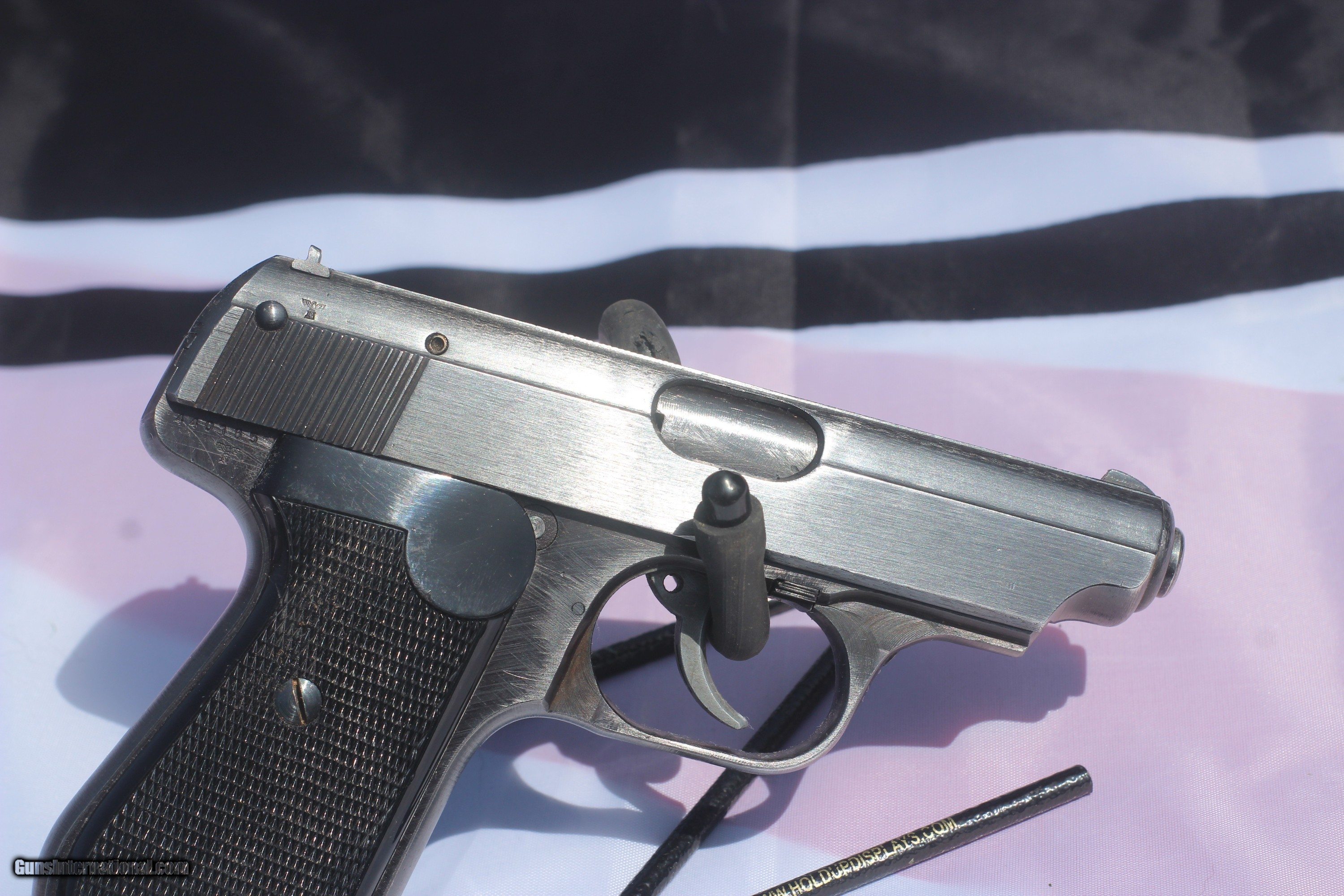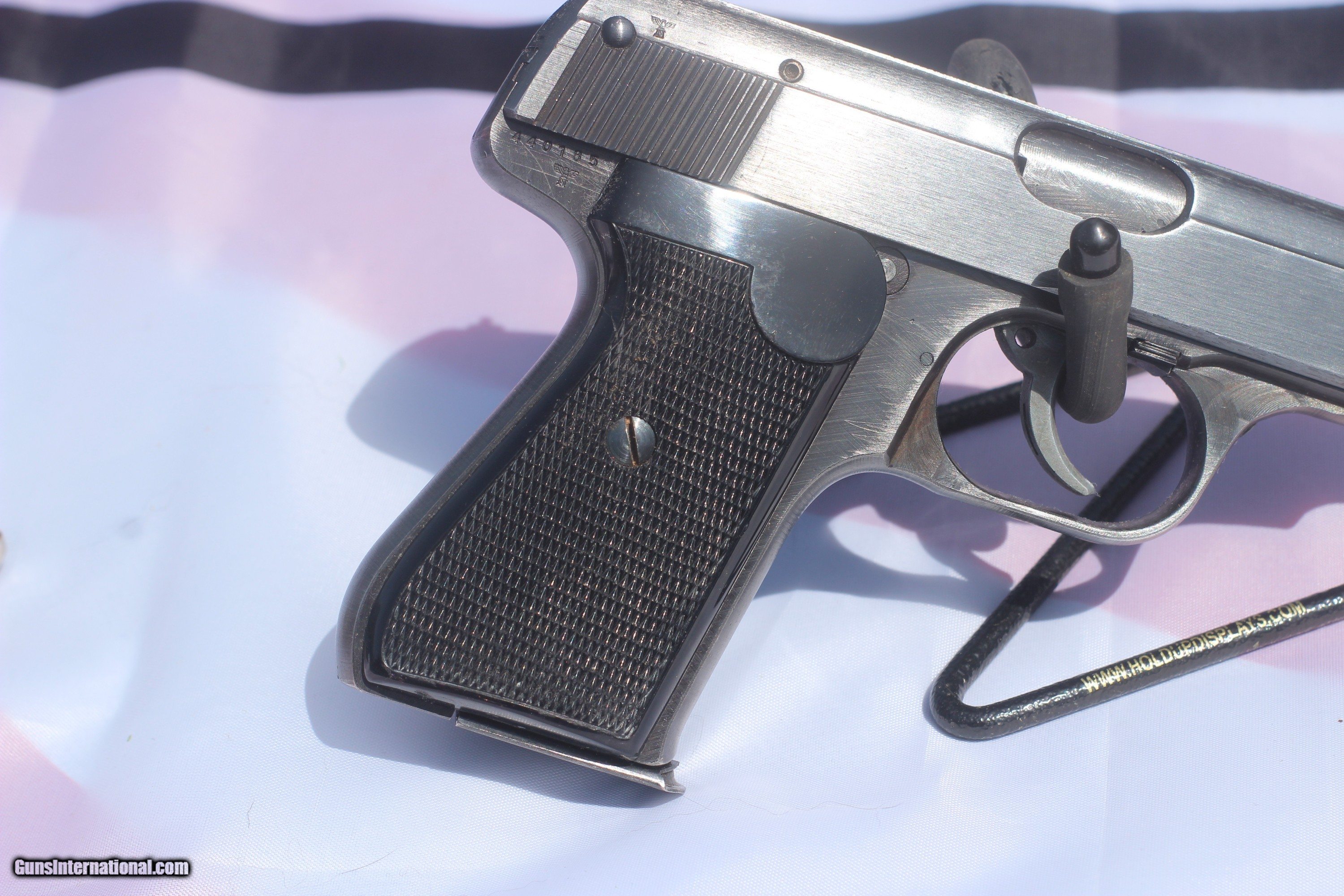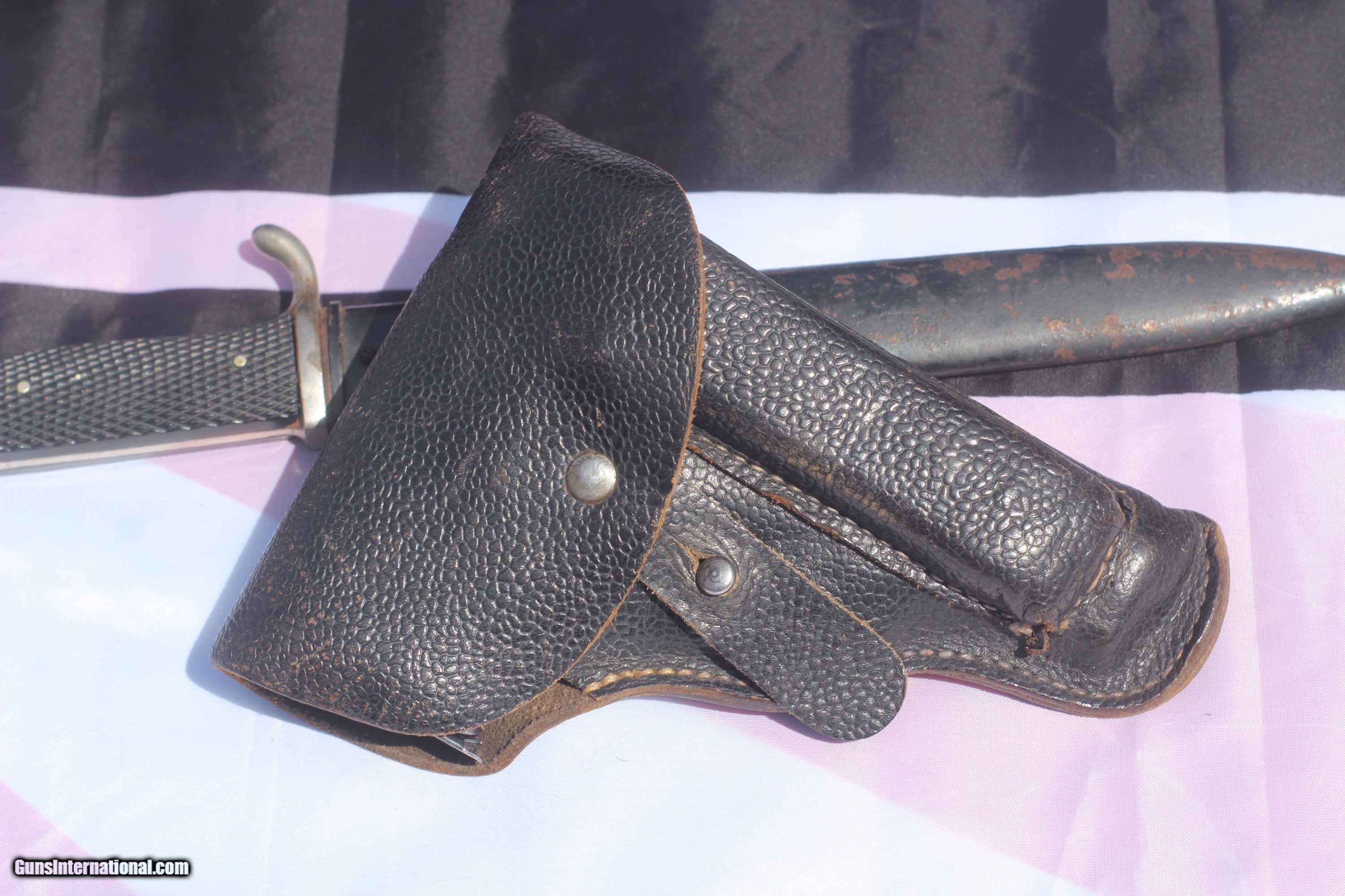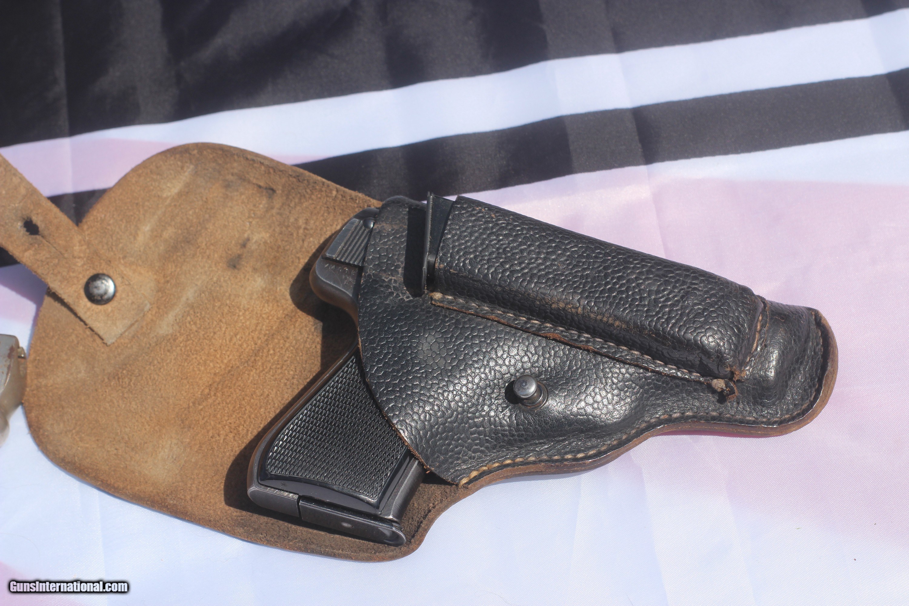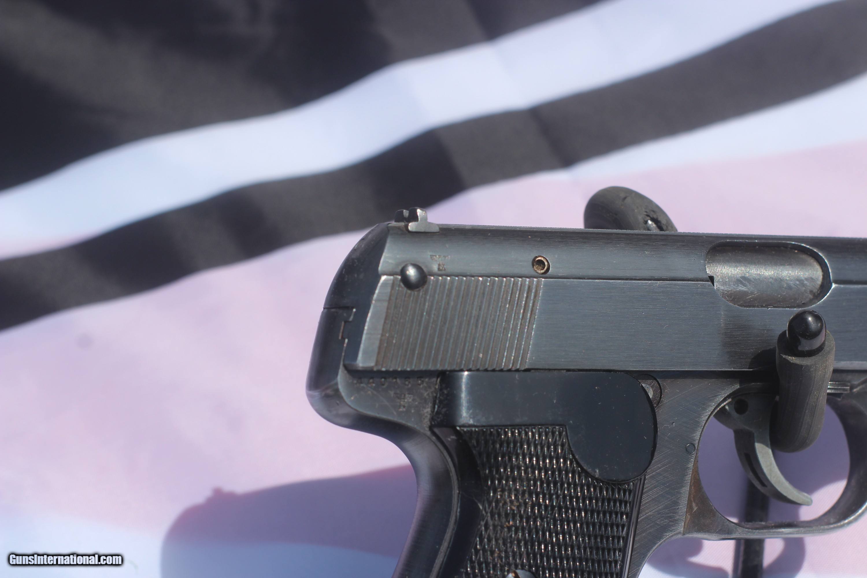 Description: WWII German maufactured 1944 German Police marked with eagle "C" Waffenamp Variation 3 with military finishand manual safety Serial # 4401xx...low production pistol Excellent bore 99% + all original bluing, with speed machine marks on contoured surfaces Comes with one original , and two extra reproduction magazines Extra set of wood grips also included Collector quality $ 2295 SOLD |