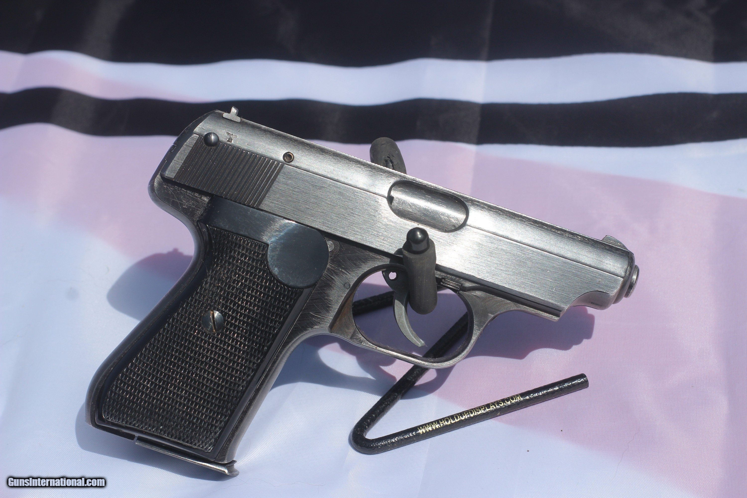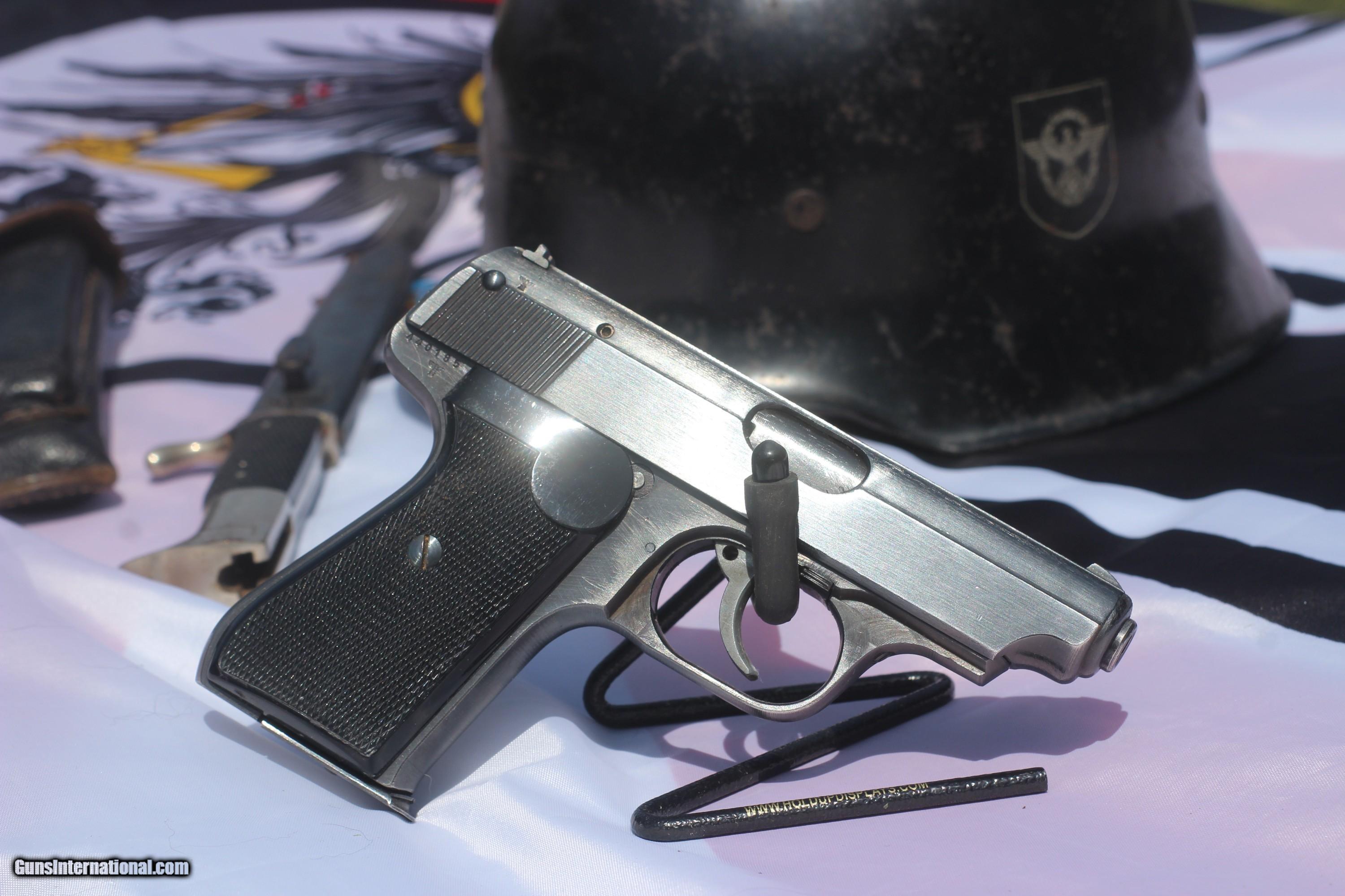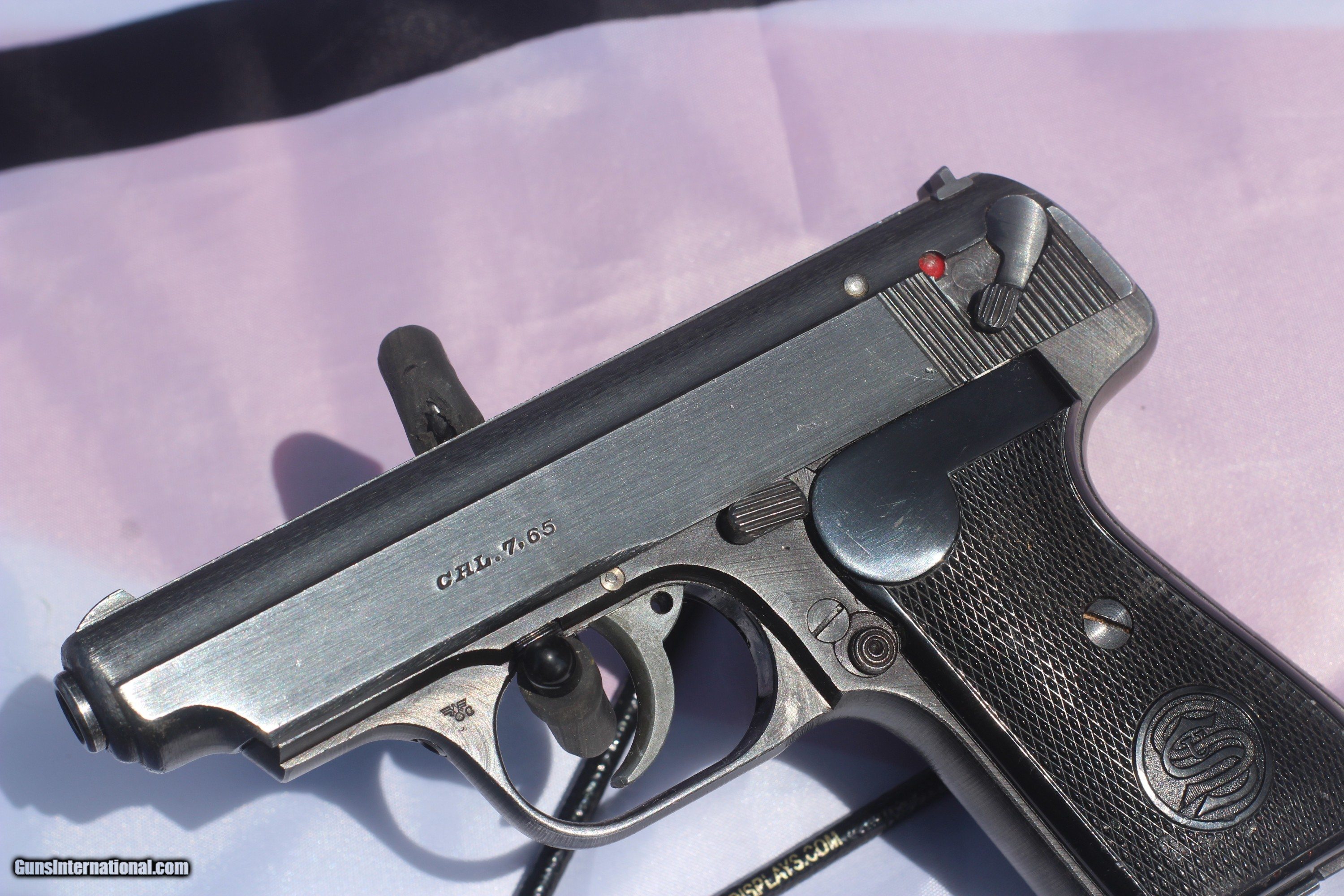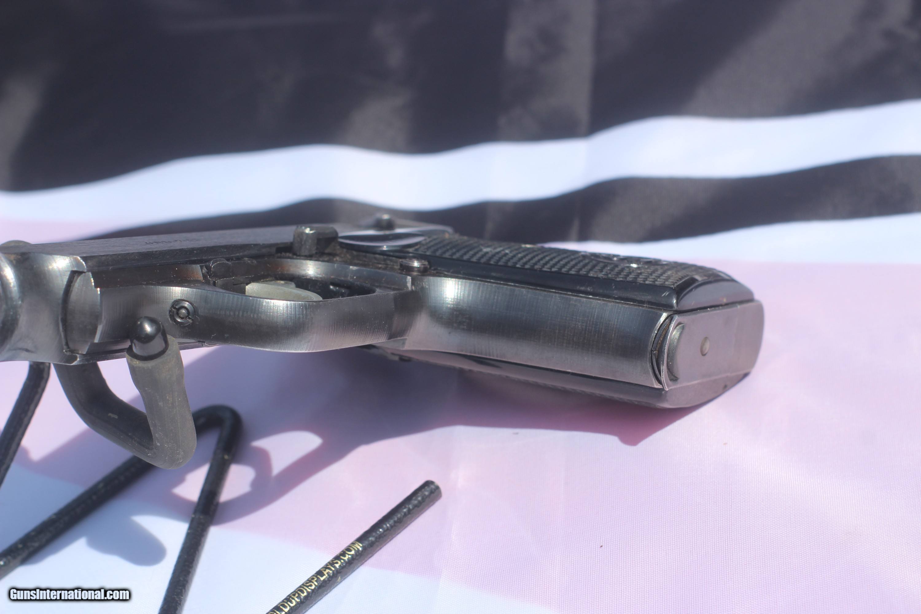 Description: WWII German maufactured 1944 German Police marked with eagle "C" Waffenamp Variation 3 with military finishand manual safety Serial # 4401xx...low production pistol Excellent bore 99% + all original bluing, with speed machine marks on contoured surfaces Comes with one original , and two extra reproduction magazines Extra set of wood grips also included Collector quality $ 2295 SOLD |