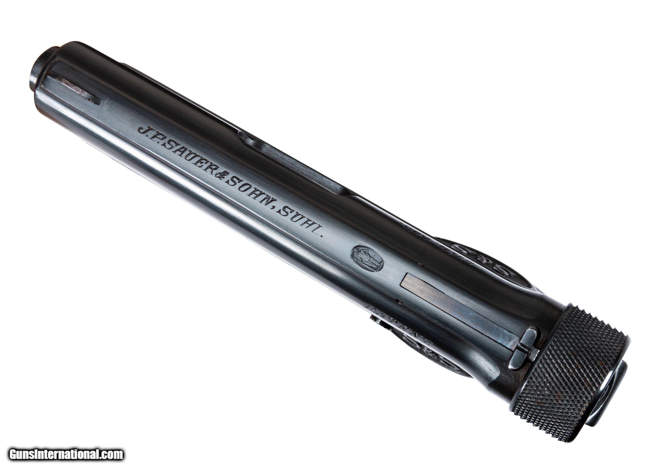 Description: Going into our showroom today is a very interesting find. This J.P. Sauer & Sohn Model 1913 is a 7.65mm Variant 2 carrying serial number 89178. This piece of German military history is in stock and ready to ship today. The Model 1913, like all early Sauers, was manufactured to an extremely high standard. The Model 1913 was originally finished with a beautiful high polish rust blue. This example appears to have been reblued by a third party at some point in time and shows some wear marks, notably on left side. The proof mark on the back of the takedown cap is the crown over N marking. This German stamp indicates nitro or smokeless powder. The same proof, although worn, is also found on the right side of the receiver just behind the trigger. The grips are hard rubber with the S&S (Sauer & Sohn) logo at the top.This military pistol includes a magazine, which is marked with “S&S 7,65”. SOLD Manufacturer: J.P. Sauer & Sohn Model: 1913 Serial Number: 89178 Caliber Info: 7.65mm Condition: Used Metal Condition: Reblued by 3rd party, some wear marks Item Location: NY |