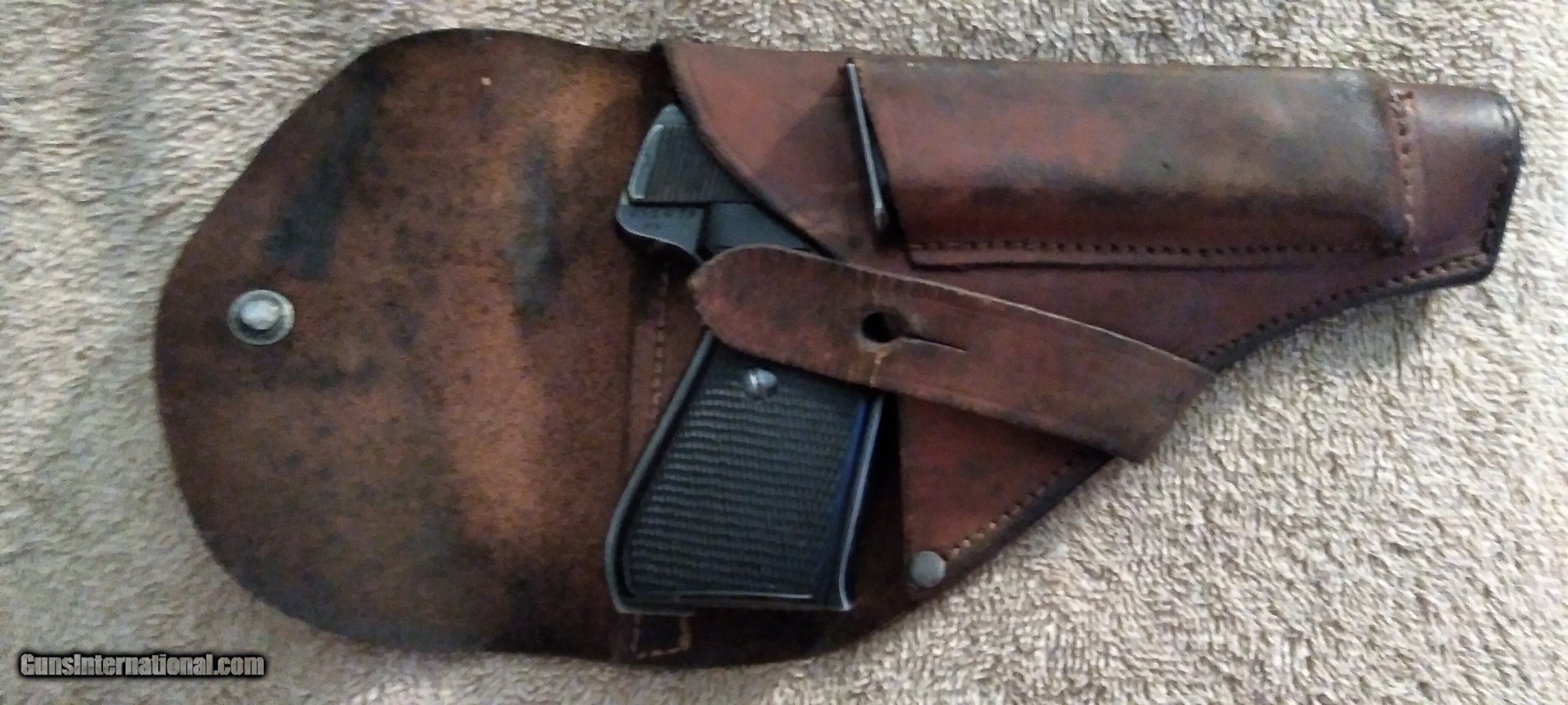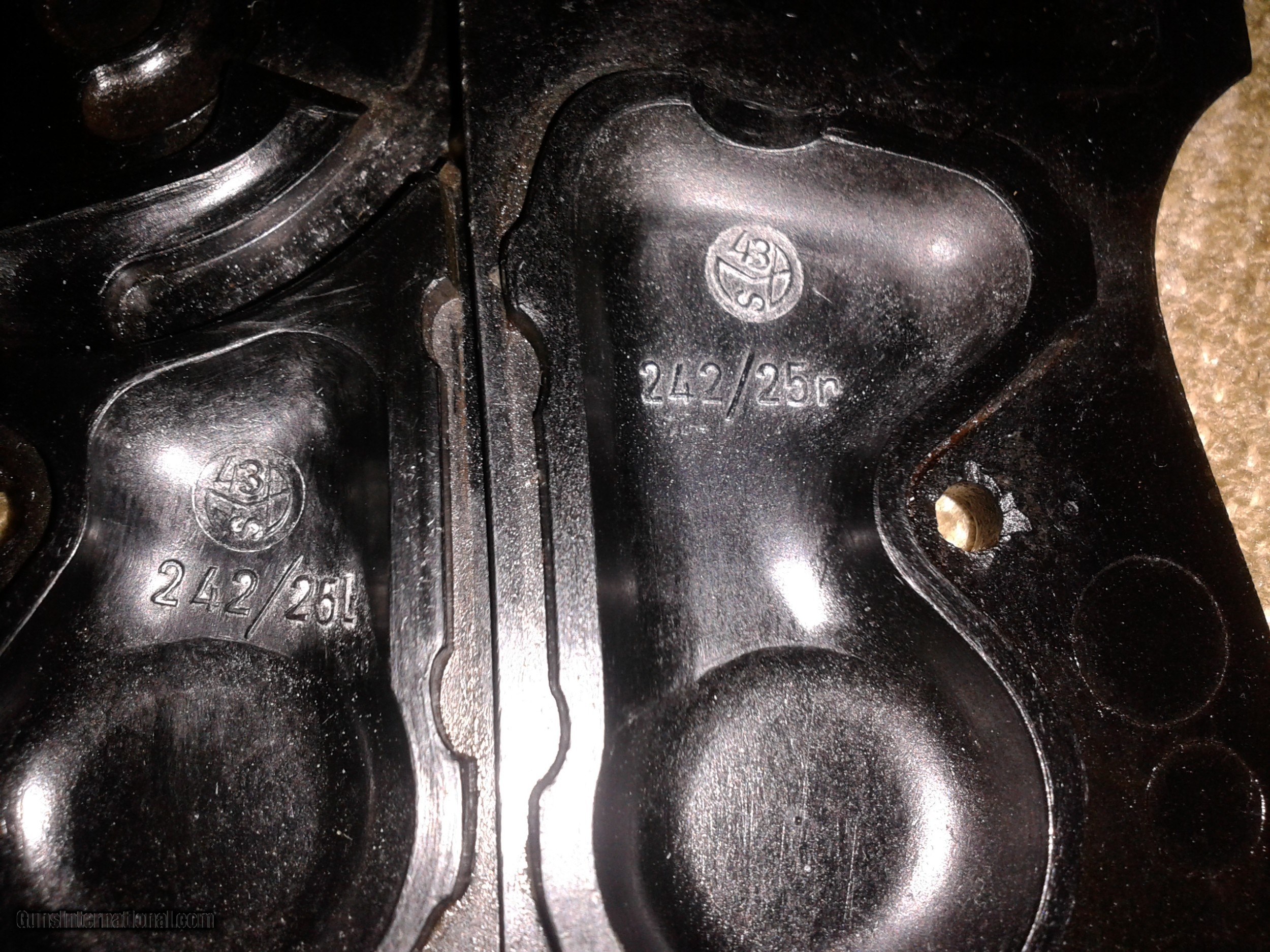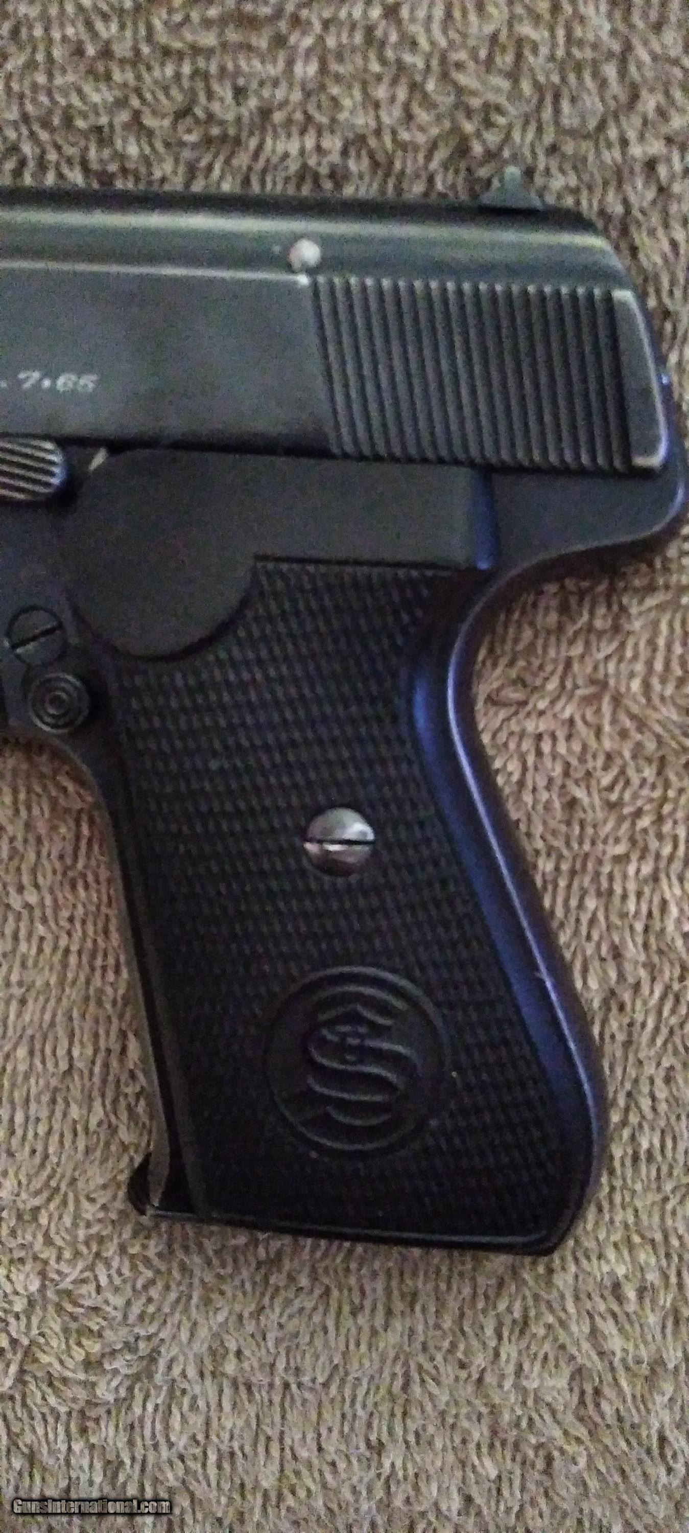 Description: SOLD SOLD SAUER 38H MANUFACTURED EARLY 1938 SOLD SOLD CALIBER 7.65 S/N 261478 ONE OF THE FIRST 1500 SAUER 38 H PRODUCED RARE WAR TIME NON-MILITARY VERY EARLY VARIATION 1 WITH THE HIGH POLISH FINISH, NO THUMB SAFETY LEVER THE ADDED SCREW TO THE MAGAZINE RELEASE AND THE CROWN OVER N PROOF MARKS THE SAUER 38H S/N STARTED AT 260000 IN 1938 THE THUMB SAFETY LEVER WAS ADDED AROUND S/N 263000 THE CROWN OVER N PROOF MARK WAS CHANGED TO THE EAGLE OVER N PROOF MARK AROUND S/N 269100 THE HIGHEST CROWN OVER N PROOF MARK KNOWN IS S/N 269257 THE LOWEST EAGLE OVER N PROOF MARK KNOWN IS S/N 269275 THE HIGH POLISH FINISH ON THE SLIDE IS GOOD WITH HIGH EDGE WEAR AND THE TYPICAL HOLSTER WEAR THE HIGH POLISH FINISH ON THE FRAME IS EXCELLENT WITH SOME THINNING AND WEAR ON FRONT AND REAR GRIP STRAPS THE BASE OF THE REAR GRIP STRAP HAS 12-14 HITS ( POSSIBLELY WAS USED AS A HAMMER? ) THE ORIGINAL GRIPS ARE EXCELLENT WITH NO CRACKS, CHIPS OR HITS THE REAR SIGHT HAS THE ORIGINAL RED PAINT THE REAR SIGHT WAS PAINTED YELLOW WHEN I PURCHASED THE SAUER ( BUBBA DID IT ) LOADED CHAMBER PIN REAR OF SLIDE EXCELLANT BORE AND RIFLING ORIGINAL MAGAZINE INCLUDED WITH ERA CORRECT HOLSTER NO IMPORT MARKS MUST SHIP TO A C&R FFL OR FFL SOLD SHIPPING $35.00 SOLD SOLD Curio/Relic: Yes Handgun Caliber: .32 ACP (7.65x17mm Browning SR) Manufacturer: J.P. SHUER & SOHN Model: 38H Serial Number: 261478 Barrel Length: 86MM ( 3.4 IN ) Bore: BRIGHT AND SHINNY Condition: Excellent Metal Condition: Excellent Bore Condition: EXCELLENT RIFLING Action: DA/SA Finish: SOME EDGE WEAR Weight: 715 G ( 1LB 9 0Z ) Sights: FIXED IRON SIGHTS Manufacture Date: 1938 |