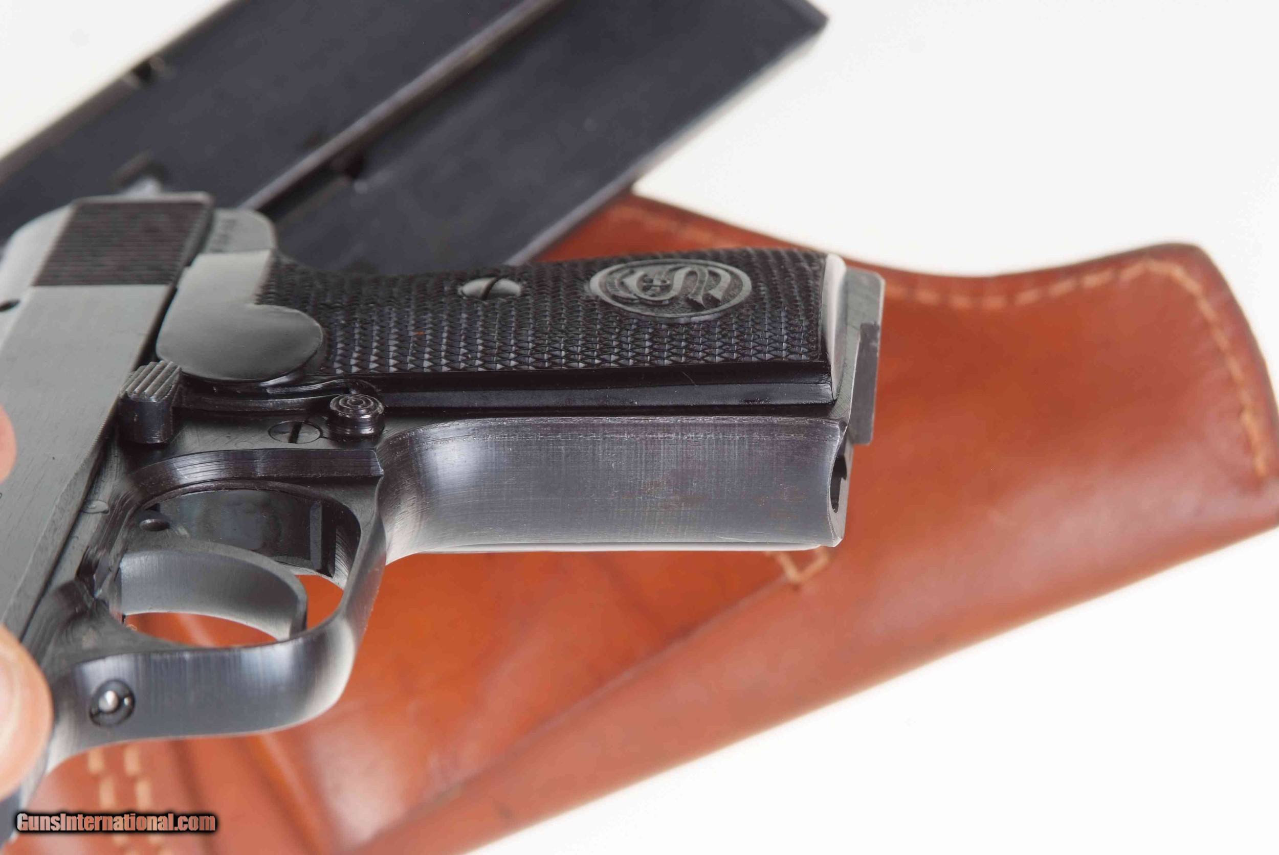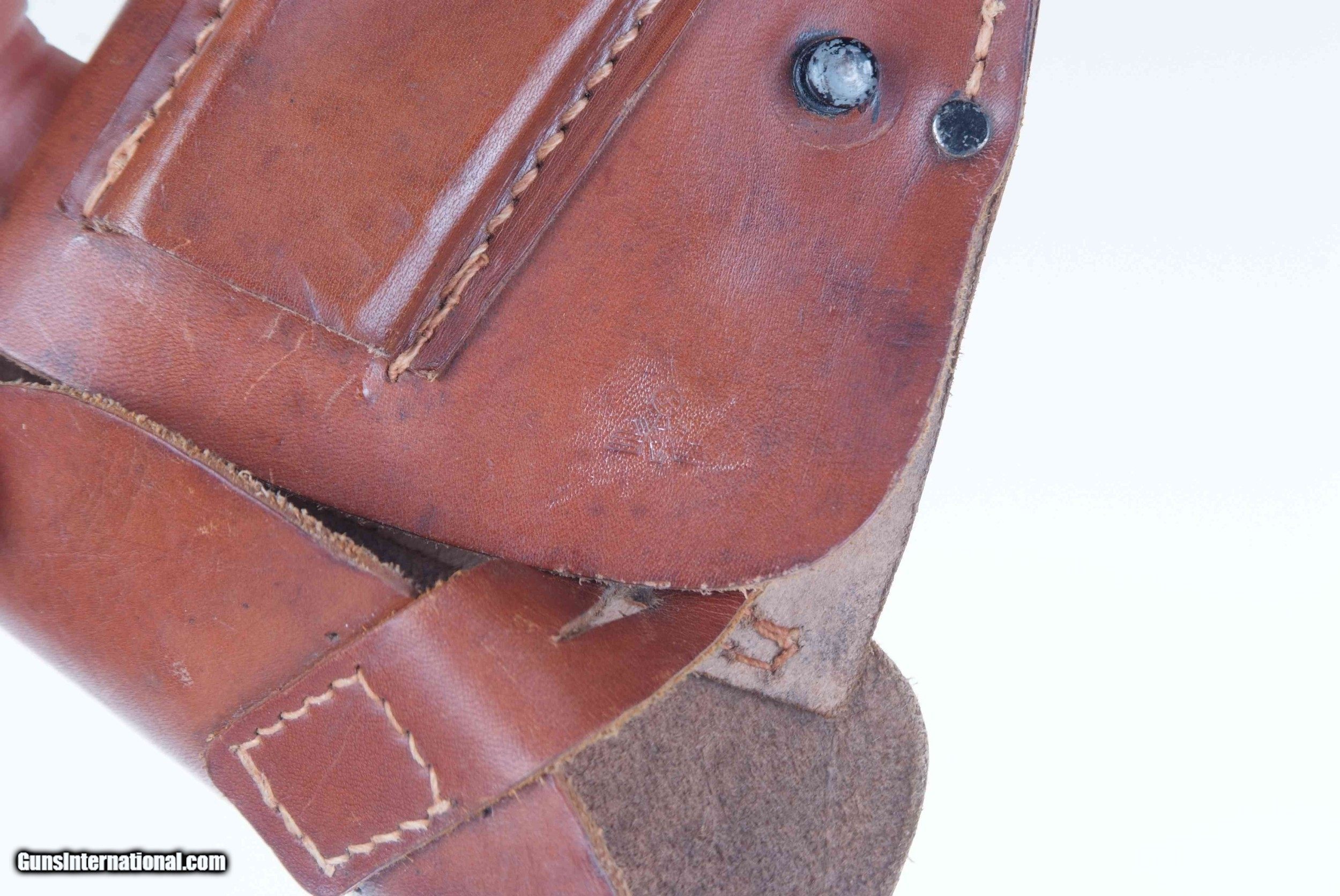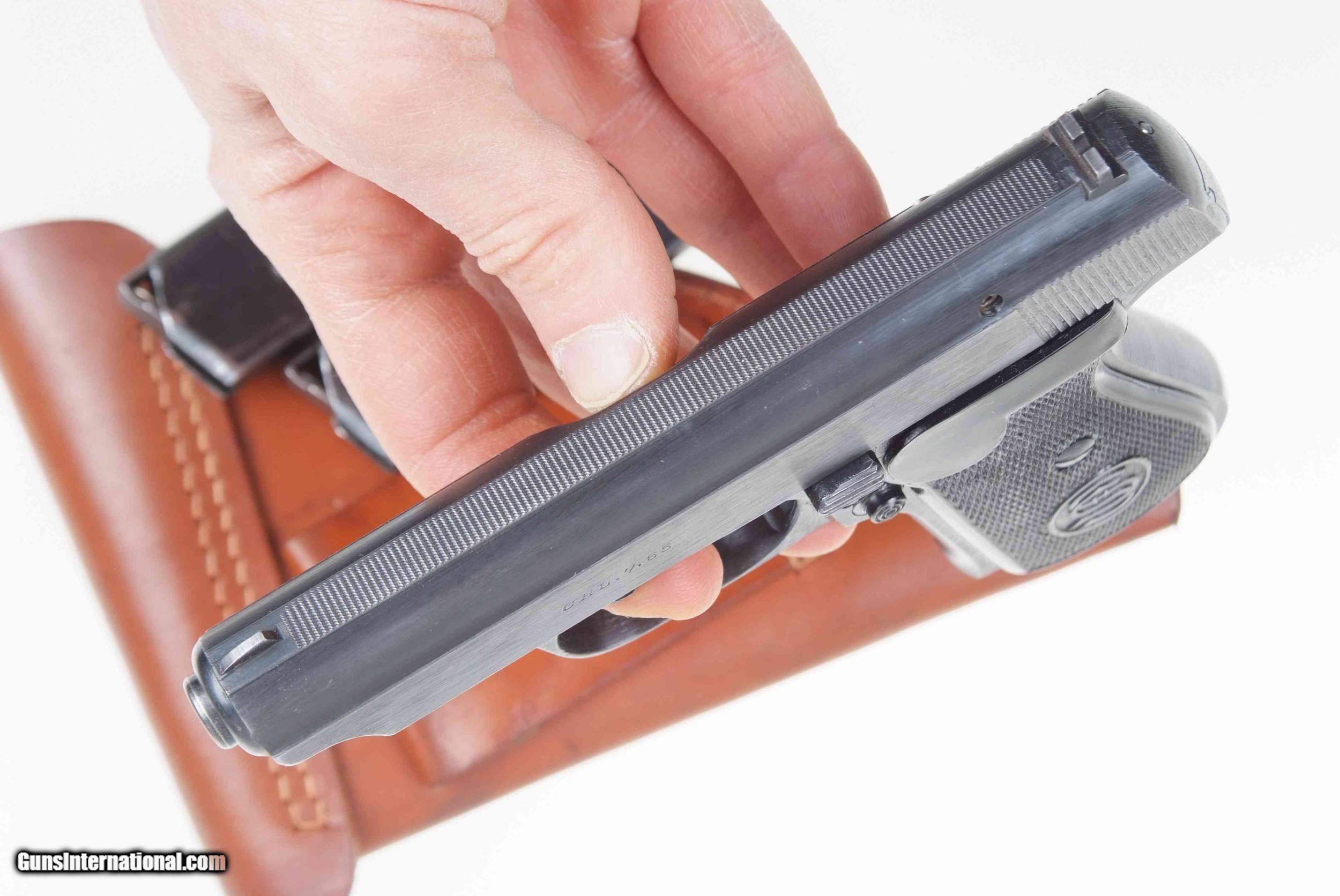 Description: Near excellent milled blued pistol, late variation without slide safety, with fixed front sight and drift adjustable rear sight. Late address on left slide limited to caliber. The right side of the slide is unmarked. Left upper trigger guardwith Eagle/F. Tang is marked with the full serial number. Eagle/N proofing on right slide and tang. The slide is matching and the firing pin housing is in-the-white. Original grips with circular intertwined S/S/U logo on left panel. Correct magazine with 7 indicator holes on left side and indented, unmarked floorplate. Spare magazine has flat floorplate with intertwined "SS". Nice but reproduction holster with police marking under flap. Synopsis: JP Sauer 38H, Late War Police, with holster and two magazines. Condition: Near excellent sharp edge wear and slight thinning as typical for a lightly holstered pistol. A few scattered handling marks as pictured. Comparable condition grips and primary magazine. Mirror bore. Perfect manual mechanics. Secondary magazine with faded floorplate as pictured. Near excellent holster with supple leather and intact stitching. A very nice late war JP Sauer 38H Police, Eagle/F, whose rig could be upgraded with an original holster and later variation magazine. ~~Insured shipping fee of $55; most packages shipped using FedEx 2nd Day.~~ SOLD Handgun Caliber: 7.65x22mm Parabellum (7.65x22mm Luger, .30 Luger) Manufacturer: JP Sauer and Sohn Serial Number: 503436 Caliber Info: 7.65mm |