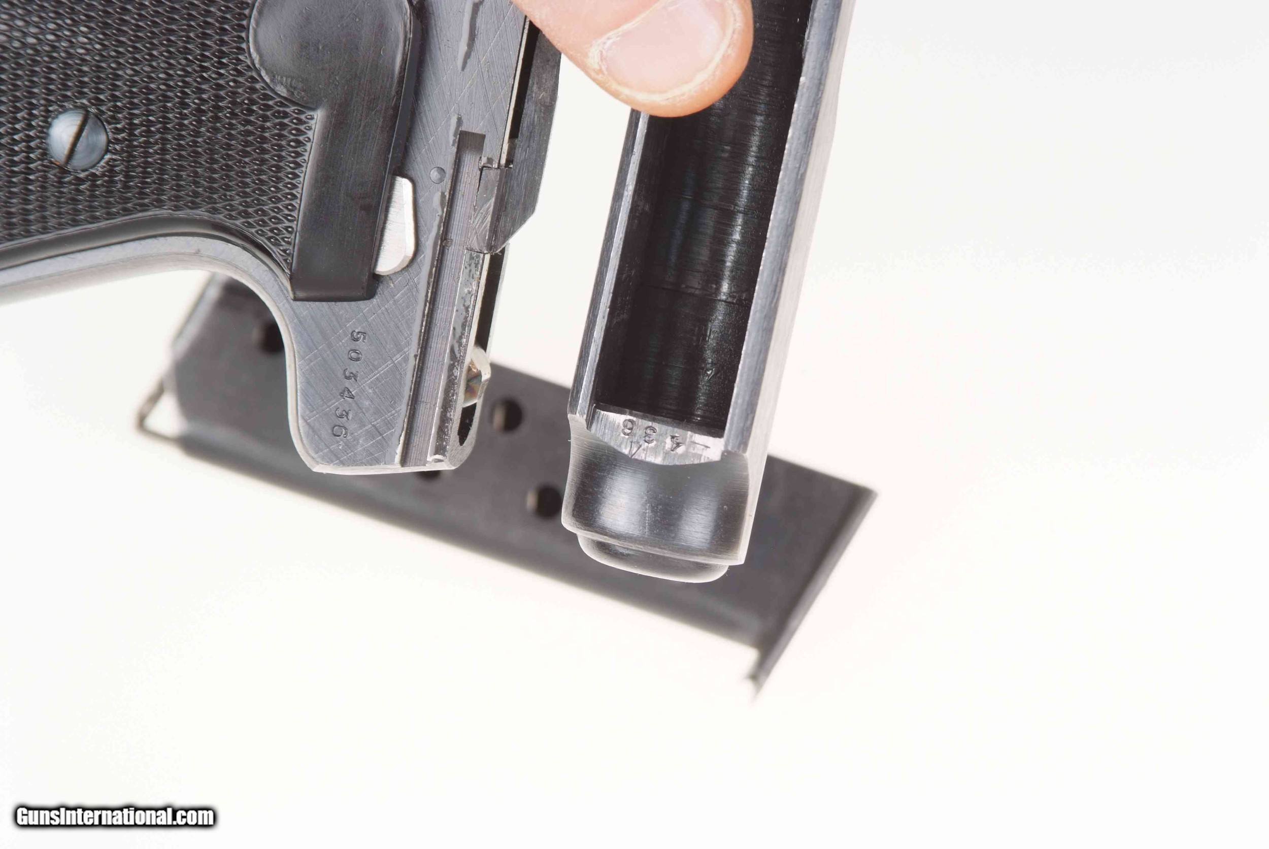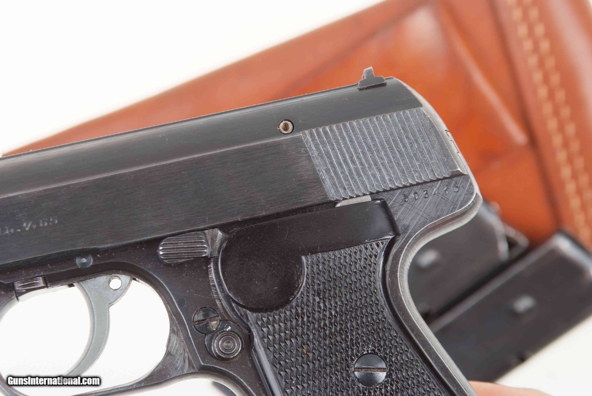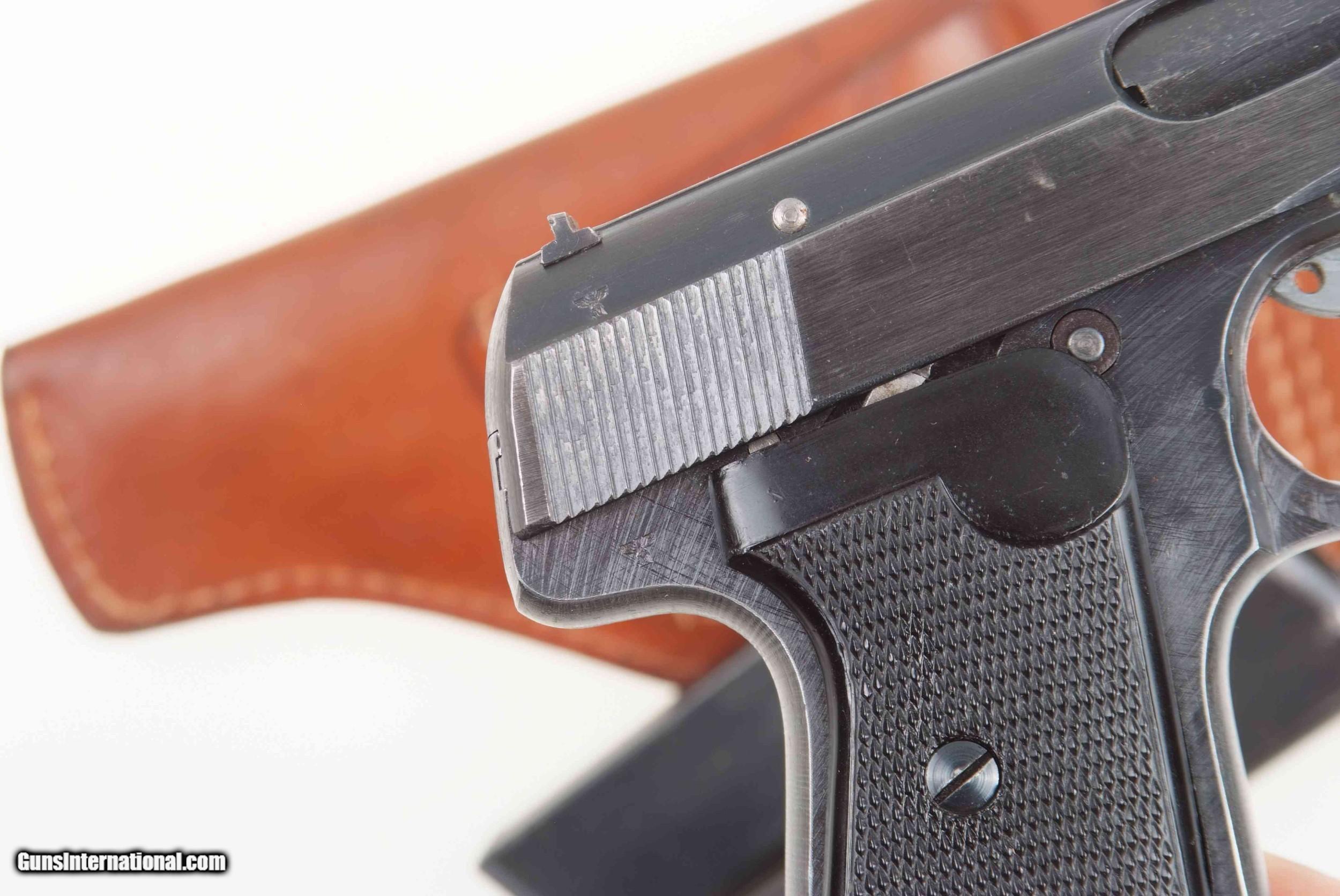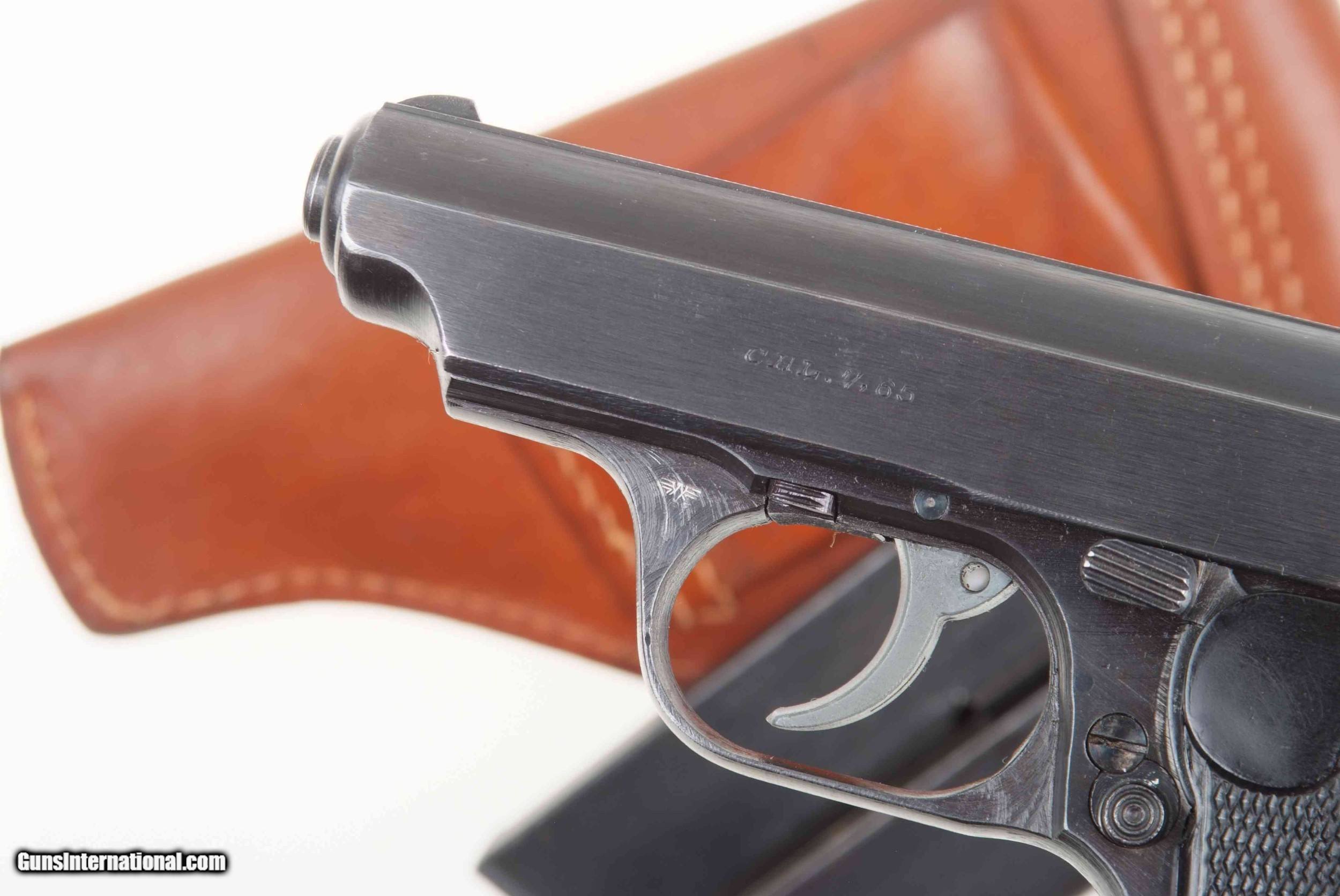 Description: Near excellent milled blued pistol, late variation without slide safety, with fixed front sight and drift adjustable rear sight. Late address on left slide limited to caliber. The right side of the slide is unmarked. Left upper trigger guardwith Eagle/F. Tang is marked with the full serial number. Eagle/N proofing on right slide and tang. The slide is matching and the firing pin housing is in-the-white. Original grips with circular intertwined S/S/U logo on left panel. Correct magazine with 7 indicator holes on left side and indented, unmarked floorplate. Spare magazine has flat floorplate with intertwined "SS". Nice but reproduction holster with police marking under flap. Synopsis: JP Sauer 38H, Late War Police, with holster and two magazines. Condition: Near excellent sharp edge wear and slight thinning as typical for a lightly holstered pistol. A few scattered handling marks as pictured. Comparable condition grips and primary magazine. Mirror bore. Perfect manual mechanics. Secondary magazine with faded floorplate as pictured. Near excellent holster with supple leather and intact stitching. A very nice late war JP Sauer 38H Police, Eagle/F, whose rig could be upgraded with an original holster and later variation magazine. ~~Insured shipping fee of $55; most packages shipped using FedEx 2nd Day.~~ SOLD Handgun Caliber: 7.65x22mm Parabellum (7.65x22mm Luger, .30 Luger) Manufacturer: JP Sauer and Sohn Serial Number: 503436 Caliber Info: 7.65mm |