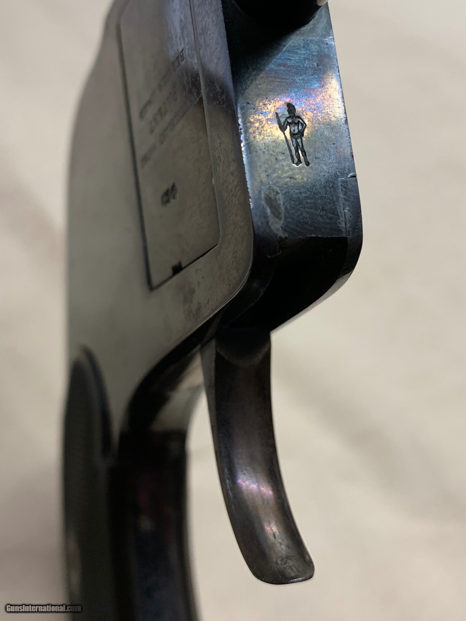 Description: Here we have a J. P. Sauer & Sohn Bär Pistol, chambered in 7mm Bär Rimfire. This unique design combined elements of a derringer and a revolver. Four rounds were chambered in a flat block-styled cylinder. Pulling the trigger fires one barrel at a time. When both cartridges are spent, the block can be manually rotated to fire the remaining two rounds. Empty shells can be ejected wit a rod stored in the grip. The trigger can be tucked forward for convenience. Grips are of the hard rubber variety. Suhl "Double Crowned U" Proofmarks on the Frame and chamber block. Sauer Proofmark on the front of the frame under the barrels. SN: 6076. Firing condition is unknown. Please email with any questions. No Sales to California. Shipping is $40 to the Lower 48. SOLD Curio/Relic: Yes Manufacturer: J. P. Sauer & Sohn Model: Bar Pistol Serial Number: 6076 |