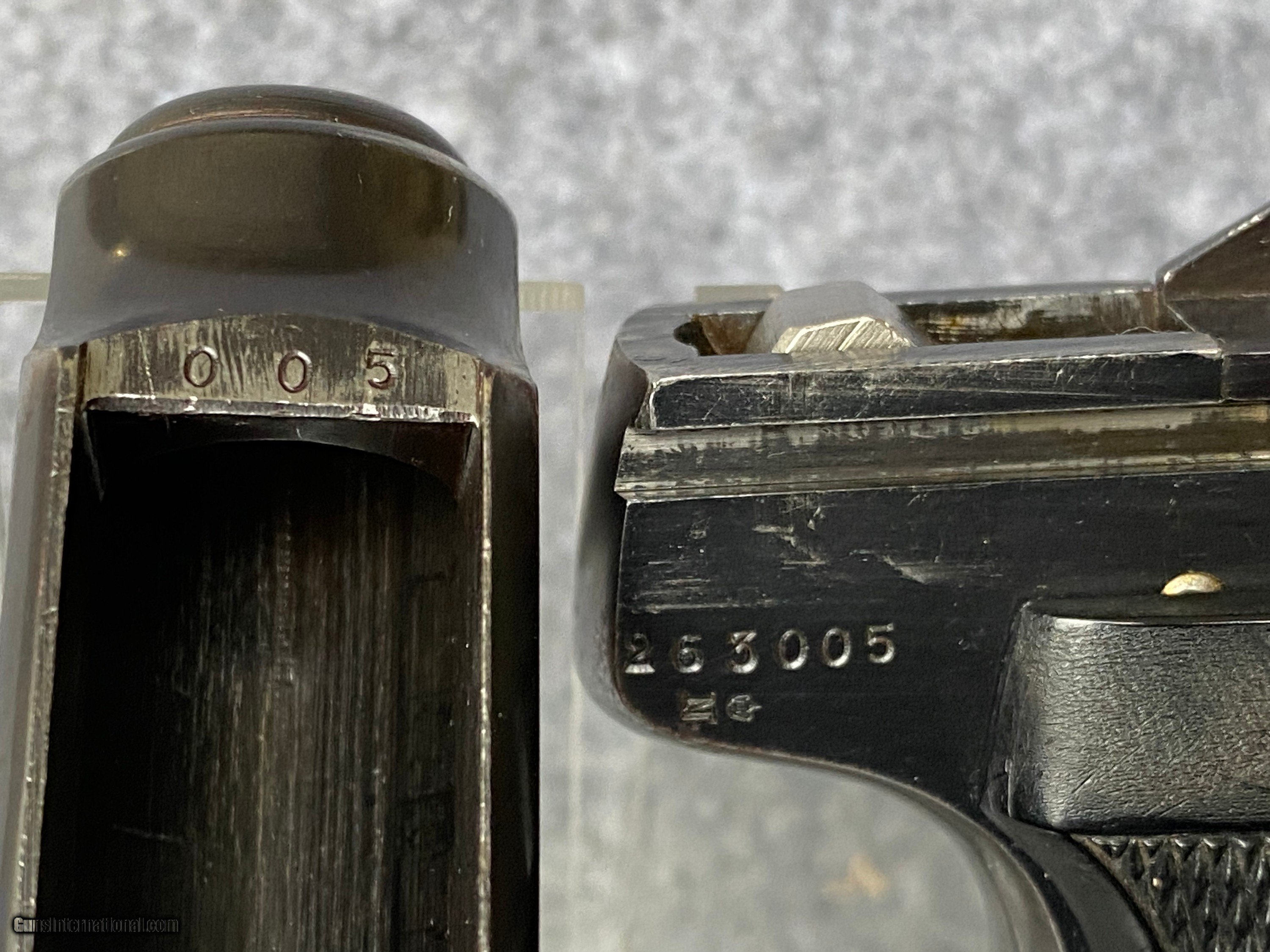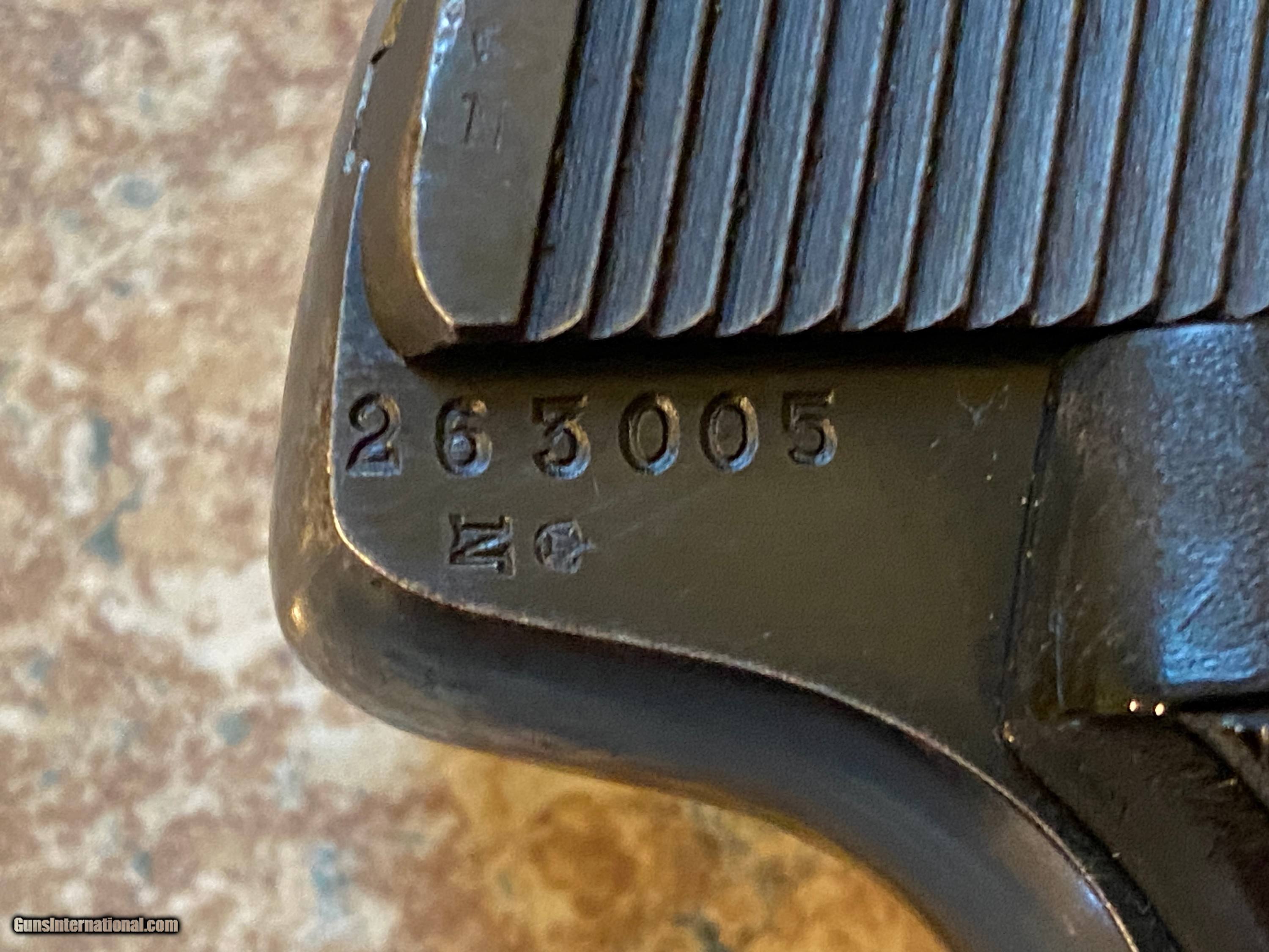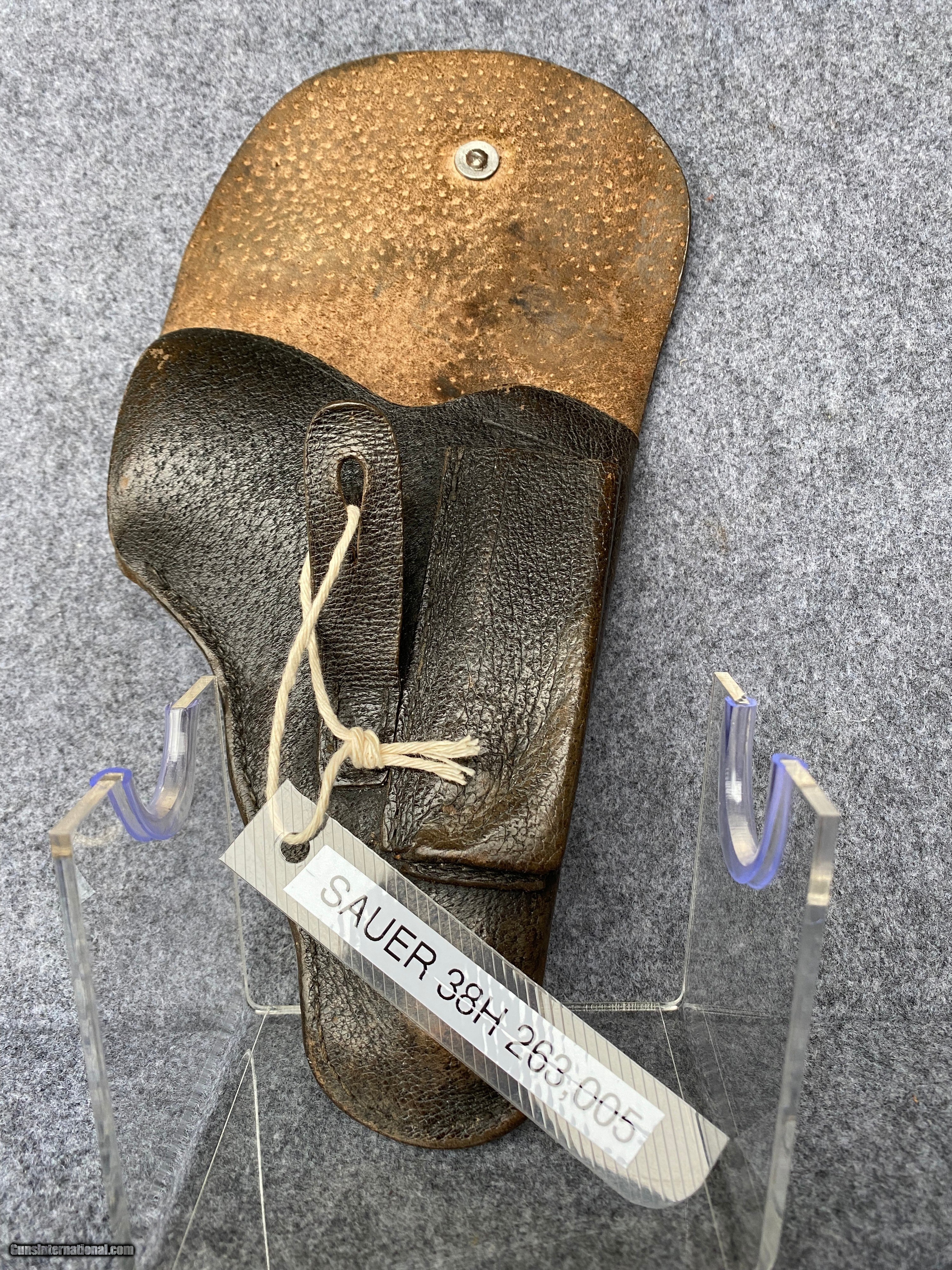 Description: Early police version of Sauer 38H serial number 263005 with an original Sauer magazine. Matching serial numbers as shown in photos. Overall very good condition with correct blue finish. Marked with a Crown N and made before April 1940. Features a decocking lever. Shiny bore, original sight paint, and good holster. $985 and free shipping. Payment by USPS MO, certified check, or Zelle. Ships to a C&R holder or FFL dealer. 3 day non-firing inspection. SOLD |