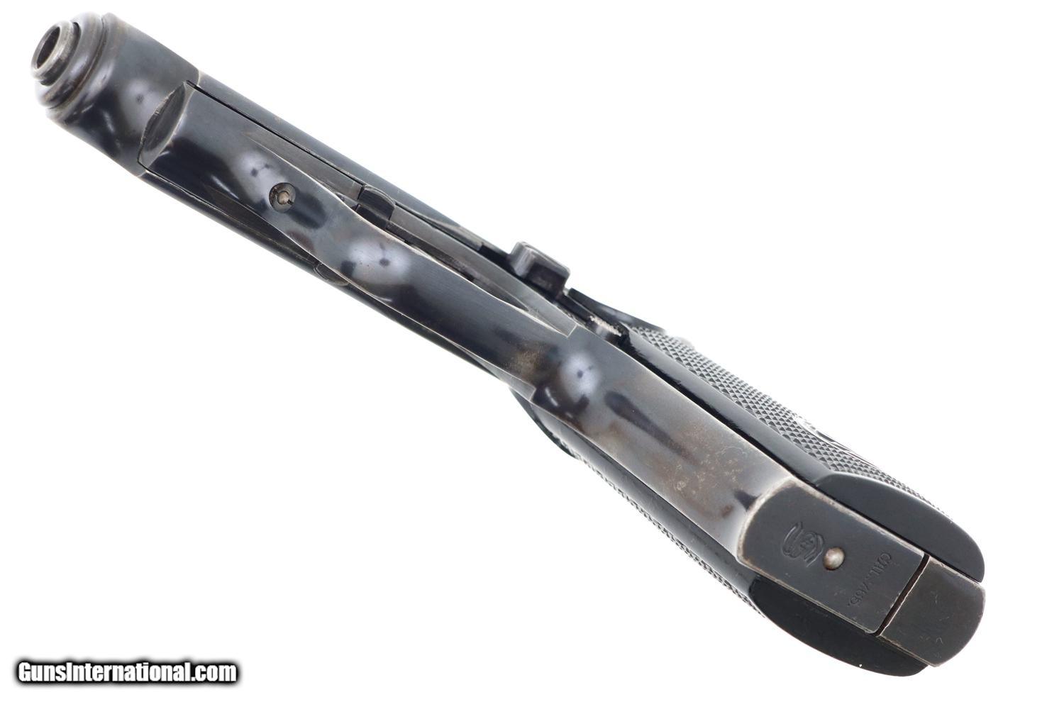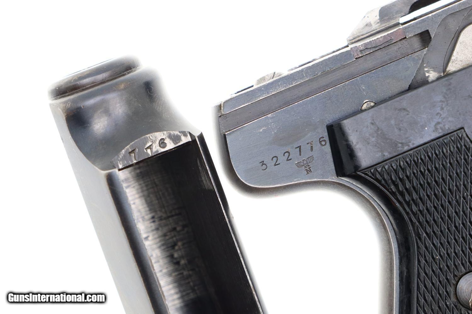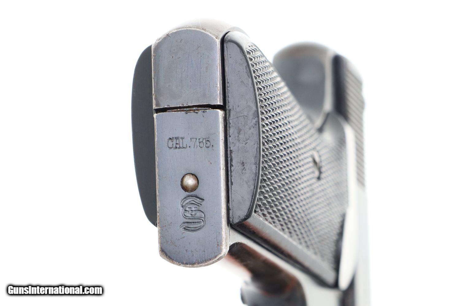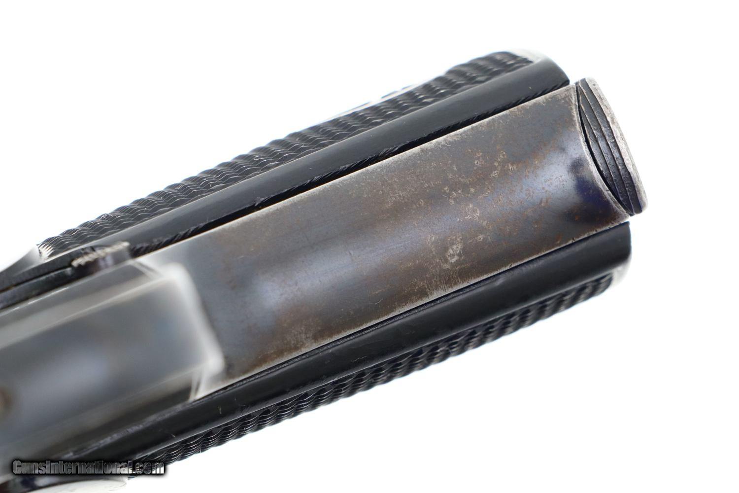 Description: Synopsis: Sauer, 38H Pistol, WWII German Police Eagle/C, Spare Magazine Description: This Sauer & Sohn is an early production high polish pistol issued to the german police in WWII, trigger guard marked with an Eagle/C, original grips, and two correct magazines. The pistol has a fixed front sight and drift adjustable rear sight. Usual address on left side of slide, referencing manufacturer and caliber. PATENT marking on right side of slide, with usual Eagle/N proofing on slide and frame. Full serial number on frame, with last few digits on matching slide. Both magazines with the scriptic intertwined SS logo and caliber on floorplates. Condition: G-VG original blue with holster wear and fading, particularly on the grip straps, as pictured. Comparable condition grips and magazines. Mirror bore. Perfect manual mechanics. A very nice and all matching Sauer 38H early police pistol with 2 correct magazines. ~~Insured shipping fee of $55; most packages shipped using FedEx 2nd Day.~~ SOLD Curio/Relic: Yes Manufacturer: Sauer Serial Number: 322776 Caliber Info: 7.65mm |