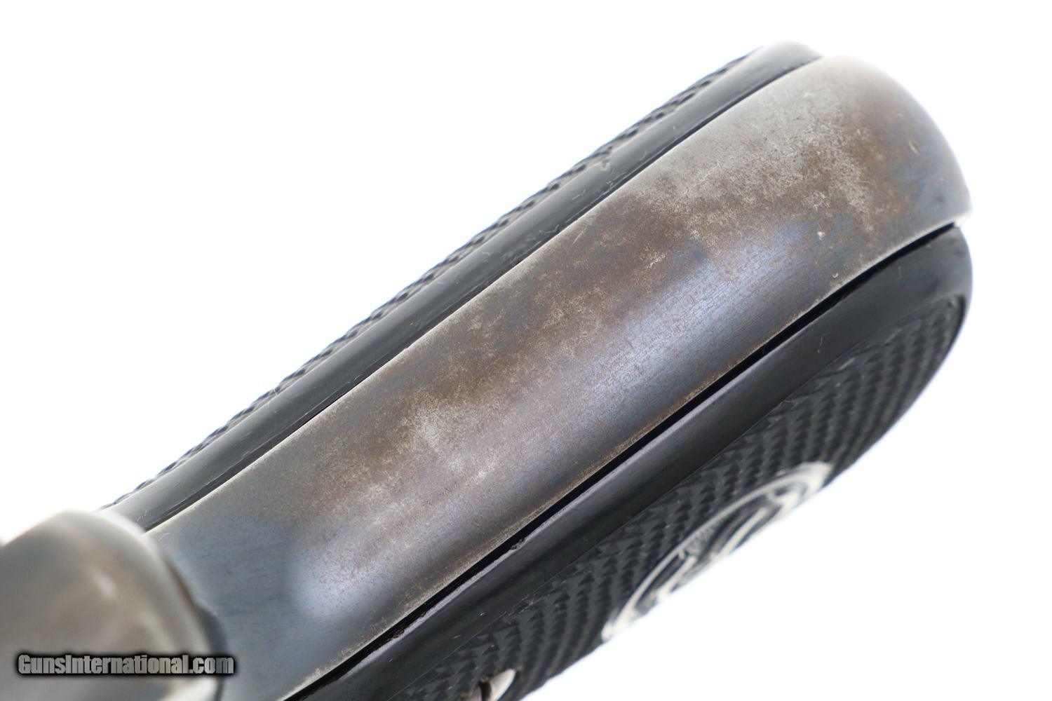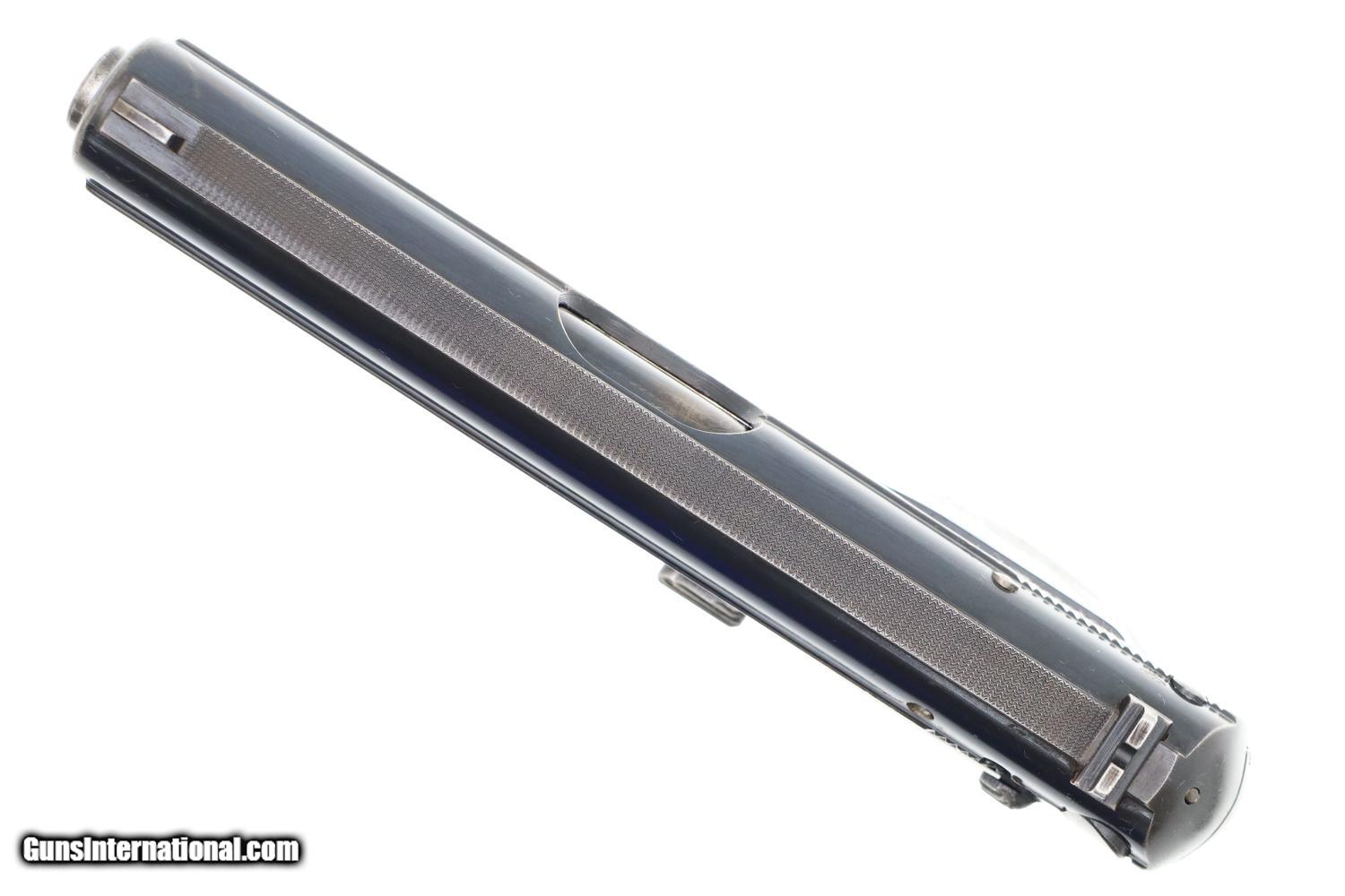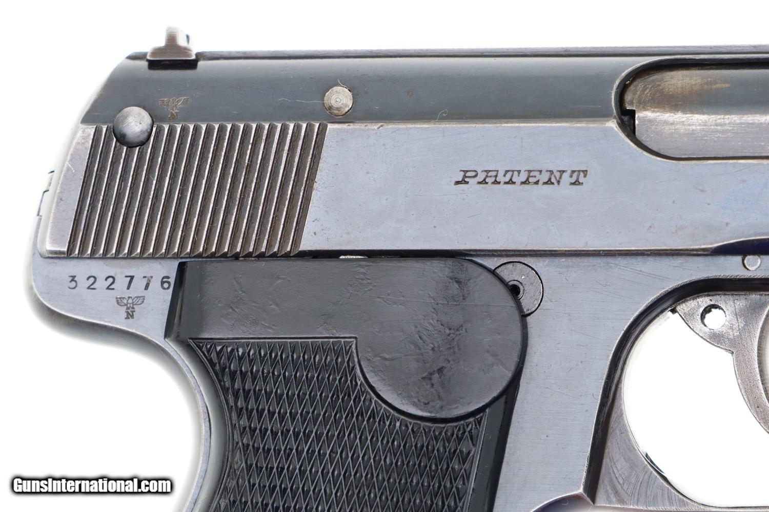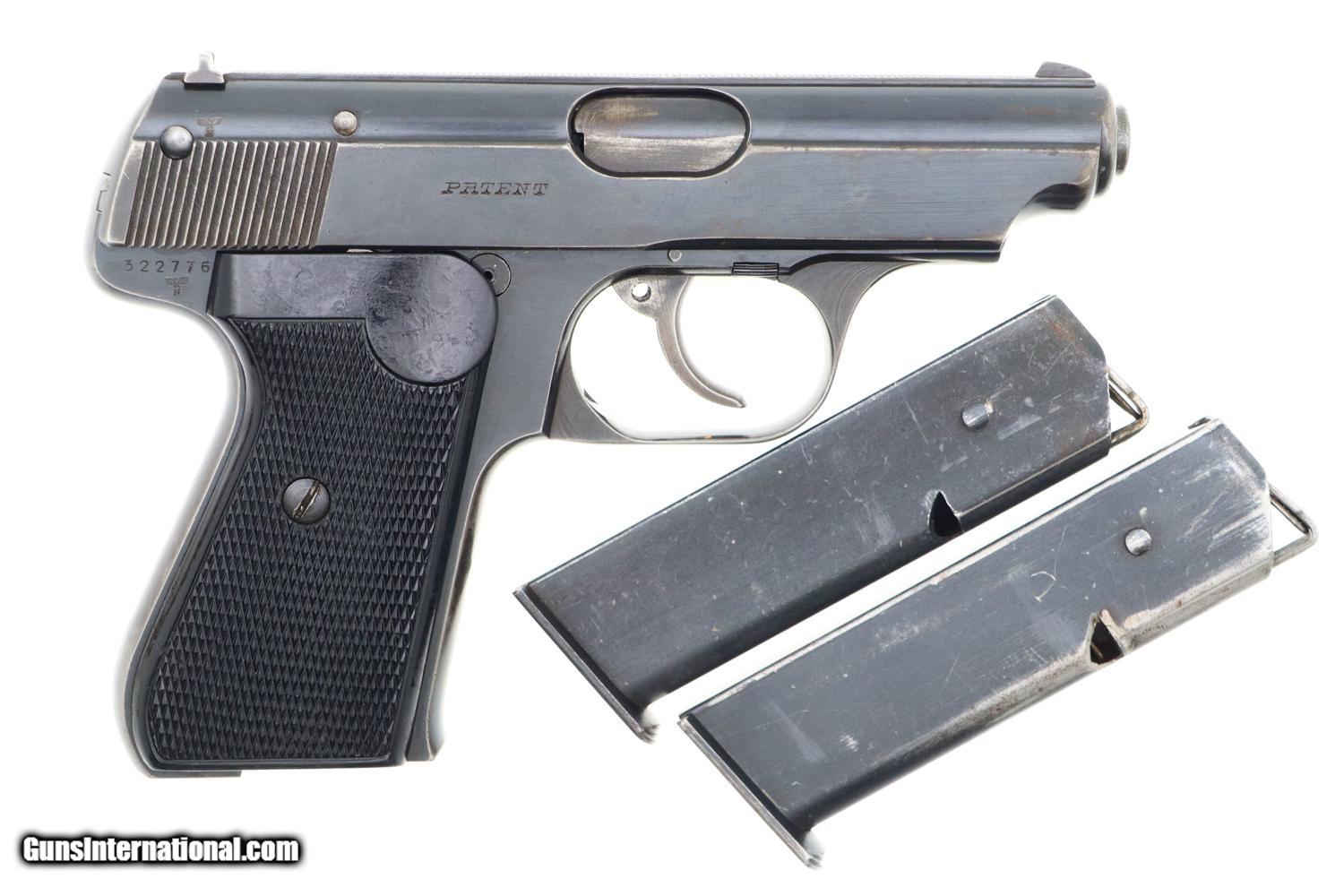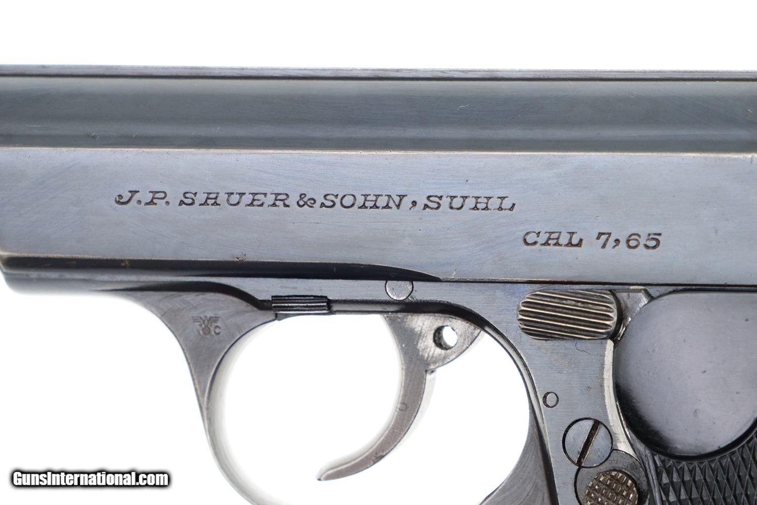 Description: Synopsis: Sauer, 38H Pistol, WWII German Police Eagle/C, Spare Magazine Description: This Sauer & Sohn is an early production high polish pistol issued to the german police in WWII, trigger guard marked with an Eagle/C, original grips, and two correct magazines. The pistol has a fixed front sight and drift adjustable rear sight. Usual address on left side of slide, referencing manufacturer and caliber. PATENT marking on right side of slide, with usual Eagle/N proofing on slide and frame. Full serial number on frame, with last few digits on matching slide. Both magazines with the scriptic intertwined SS logo and caliber on floorplates. Condition: G-VG original blue with holster wear and fading, particularly on the grip straps, as pictured. Comparable condition grips and magazines. Mirror bore. Perfect manual mechanics. A very nice and all matching Sauer 38H early police pistol with 2 correct magazines. ~~Insured shipping fee of $55; most packages shipped using FedEx 2nd Day.~~ SOLD Curio/Relic: Yes Manufacturer: Sauer Serial Number: 322776 Caliber Info: 7.65mm |
