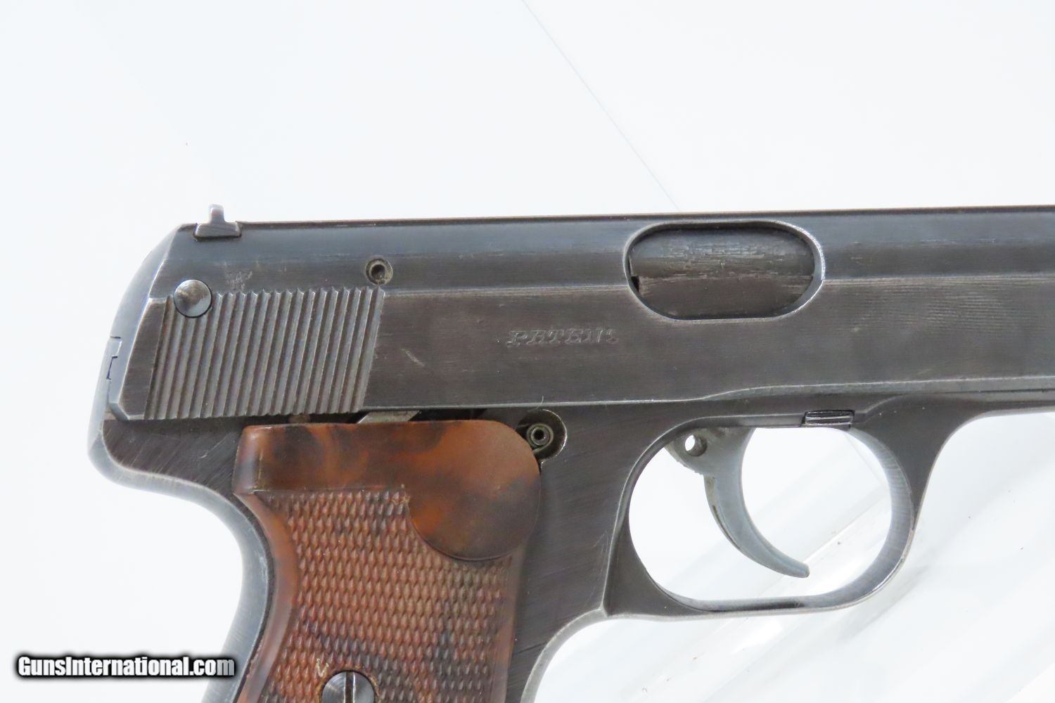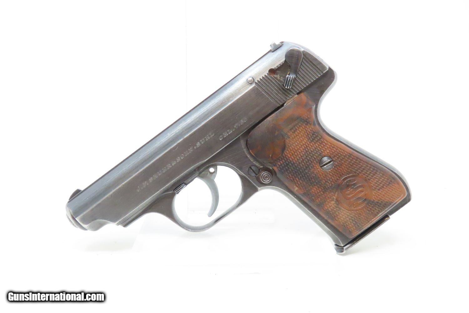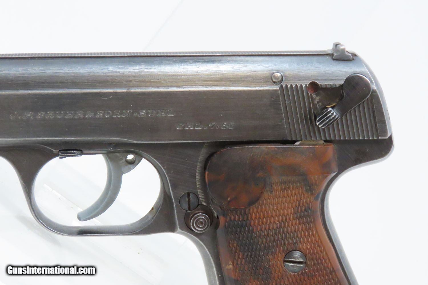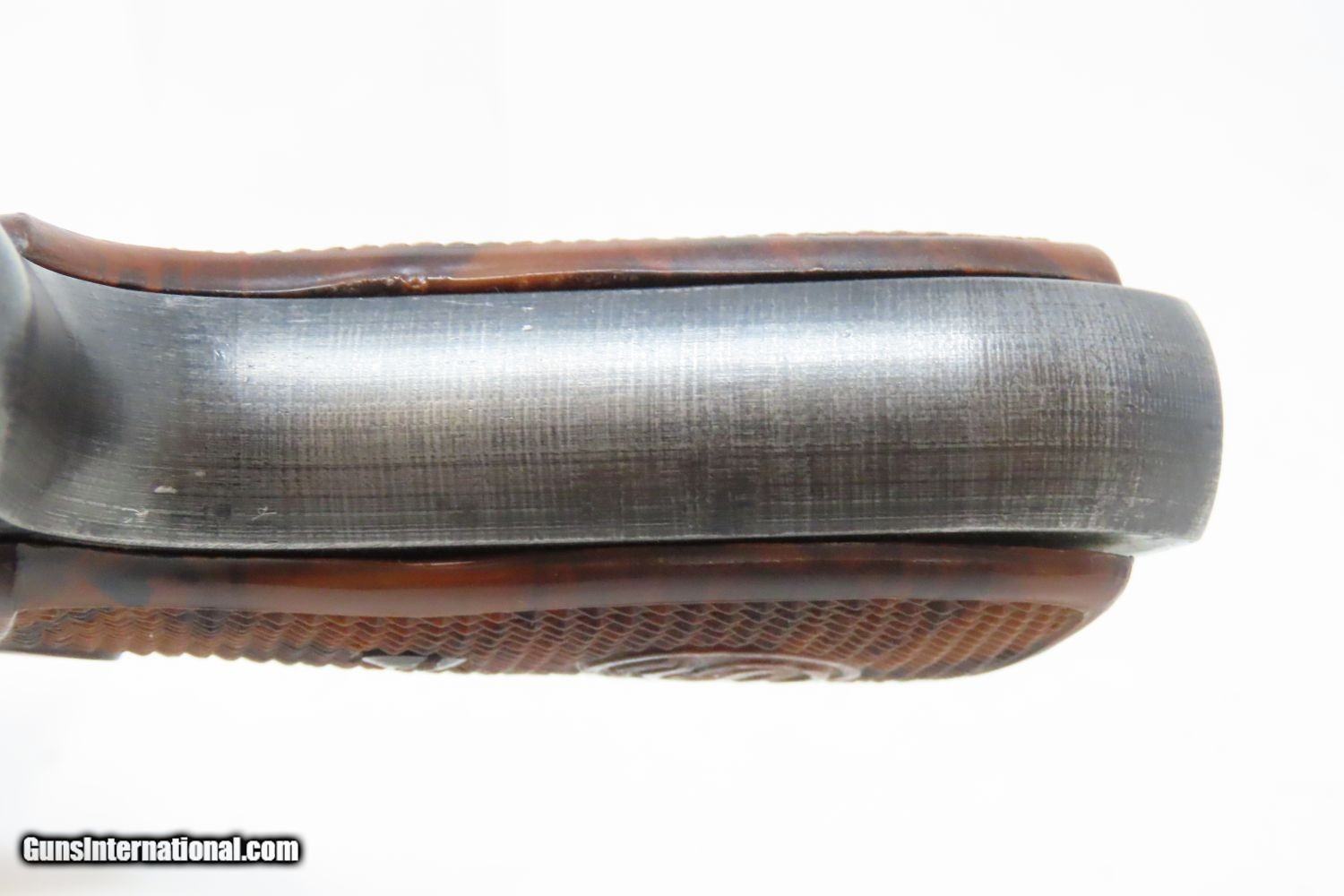 Description: Third Reich MILITARY Marked WORLD WAR II J.P. SAUER & SOHN Model 38H PISTOL EAGLE/37 Marked GERMAN First Model Pistol! Here we present a J.P. Sauer & Sohn Model 38H First Model (2nd Wehrmacht Variant) Semi-Automatic Pistol manufactured circa 1940 in Suhl, Germany with a production run from 1938 through the end of World War II in 1945 with approximately 200,000 examples made. The "H" in the model number indicates this pistol uses a shrouded hammer as opposed to the striker style firing of earlier Sauer models. This pistol was issued to the German Army and was a favorite of the Luftwaffe as it could be carried while parachuting behind enemy lines. The Eagle over 37 proof mark on the trigger guard is a Military acceptance mark indicating that this pistol was issued to the German Army instead of the police. The Sauer 38H was produced in three basic models. The slide of the first model says "JP Sauer und Sohn" on the left along with the caliber. The second version says only "CAL 7.65", and the third version omits the safety and the cocking/decocking lever. Towards the end of the war, weapons produced were simplified for quicker, cheaper production. For the 38H, this meant simpler markings, rough finish, and the elimination of features like the slide-mounted safety. The overall condition is good. Original finish. The action remains strong. The decocker has been removed from this pistol. The safety remains intact and functional. There is also a small cap under the top front corner of the right grip that has been removed. Replacement grips. This firearm is classified as a Curio & Relic. Barrel is 3-3/8 inches. Caliber: 7.65mm Browning (.32 ACP) Overall condition as seen in photos. Very Fast. Very Safe. FREE SHIPPING. Will need to be sent to your local FFL or C&R licensee. This firearm is classified as a Curio & Relic. Guaranteed AUTHENTIC & Includes CERTIFICATE OF AUTHENTICITY. ancestryguns $1400 #215354 SOLD Curio/Relic: Yes |