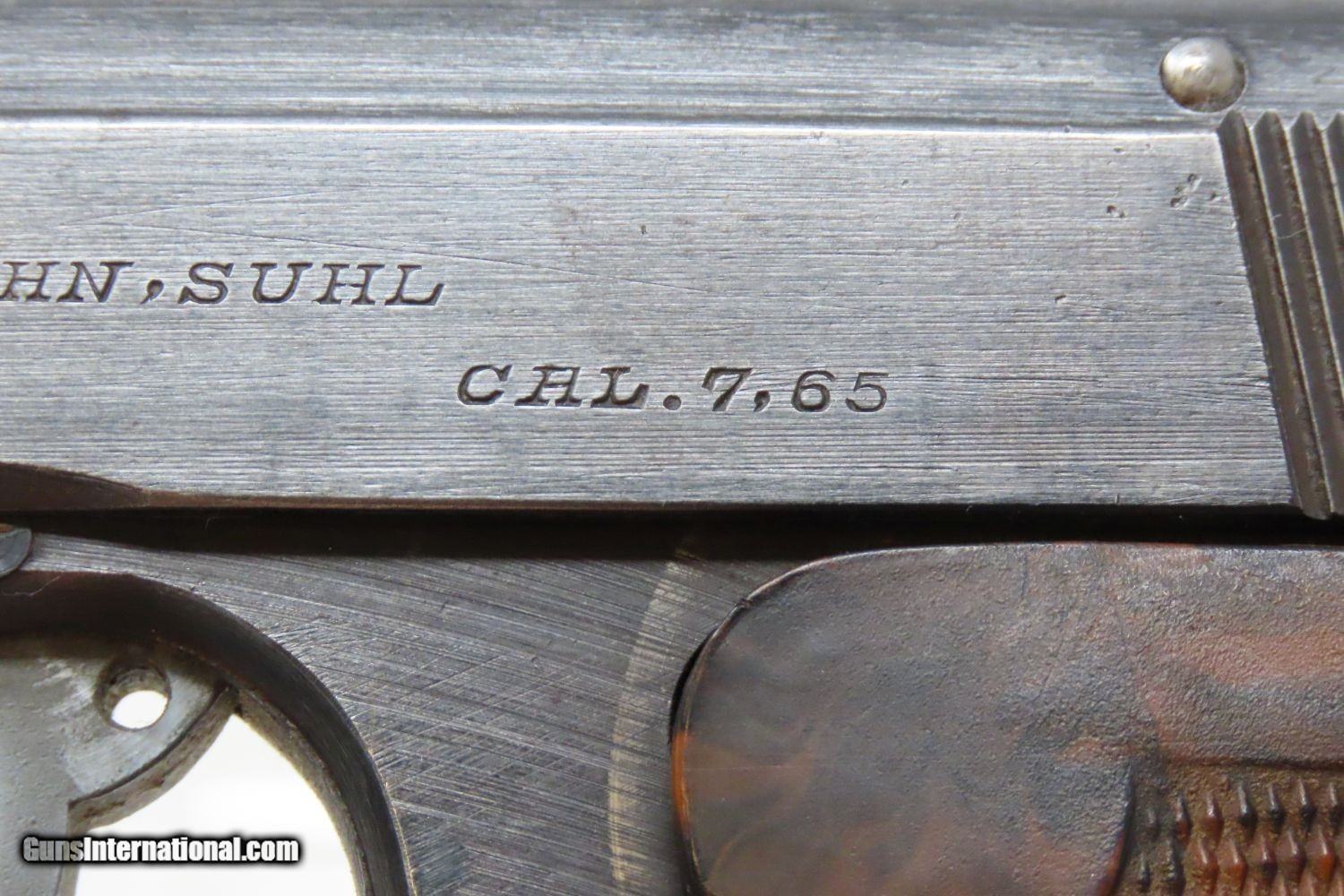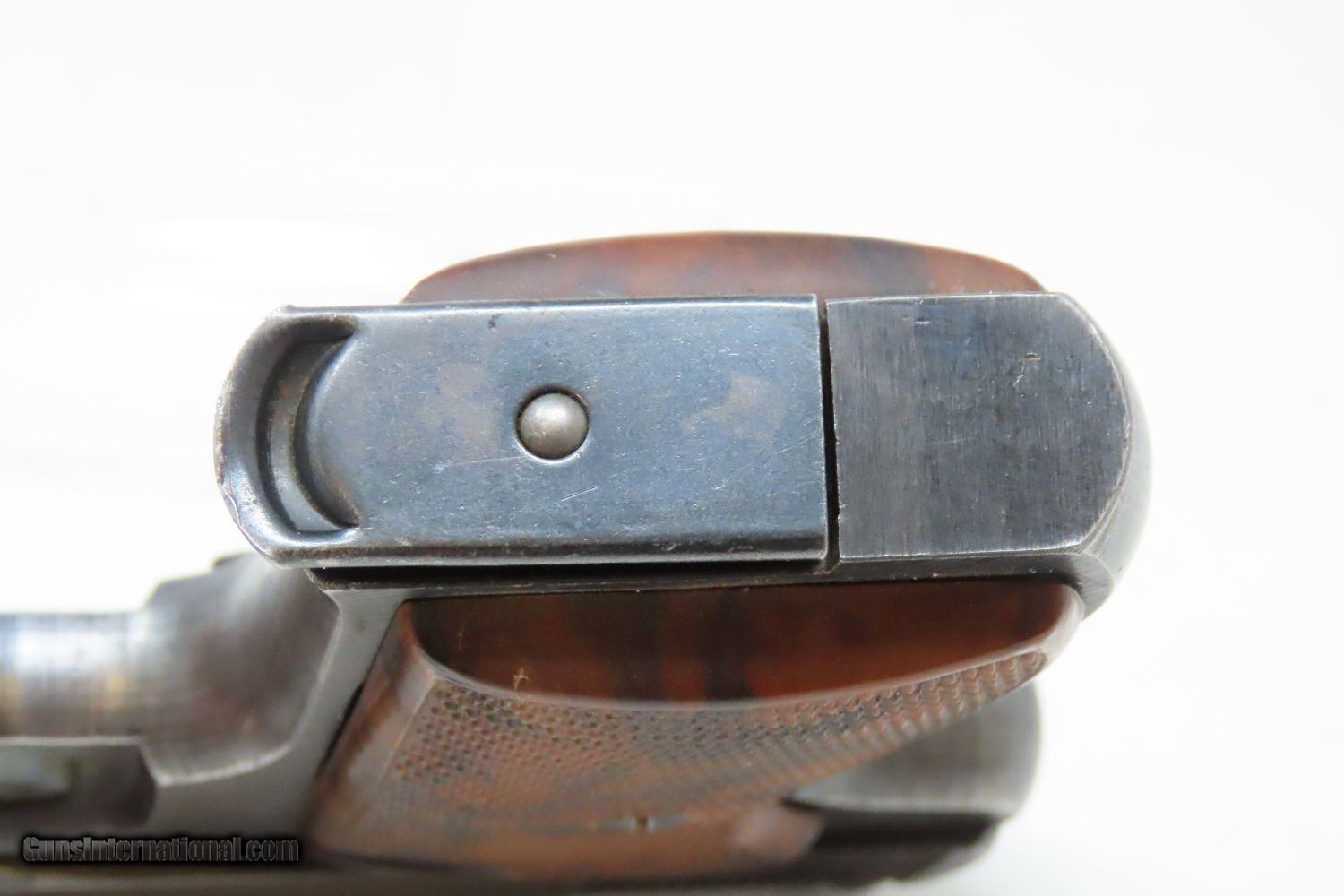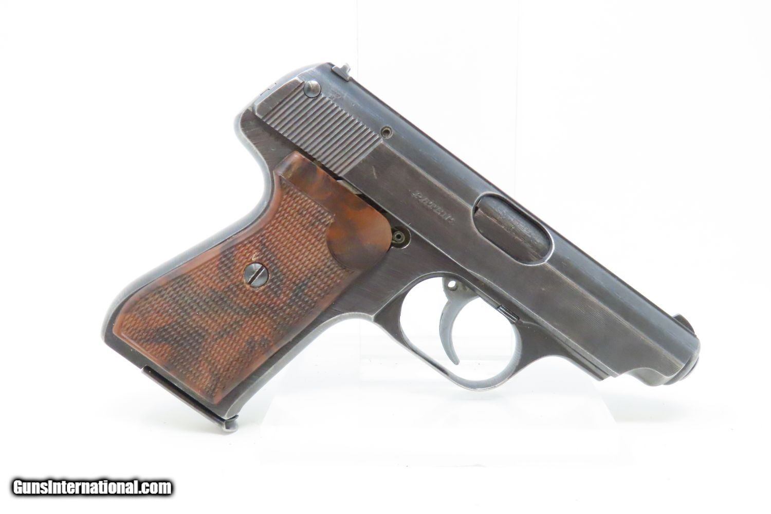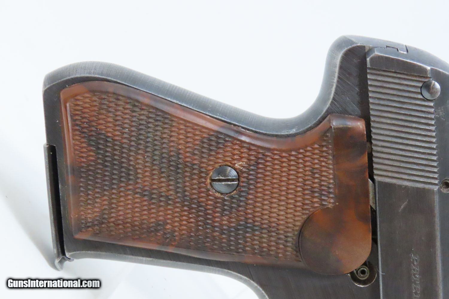 Description: Third Reich MILITARY Marked WORLD WAR II J.P. SAUER & SOHN Model 38H PISTOL EAGLE/37 Marked GERMAN First Model Pistol! Here we present a J.P. Sauer & Sohn Model 38H First Model (2nd Wehrmacht Variant) Semi-Automatic Pistol manufactured circa 1940 in Suhl, Germany with a production run from 1938 through the end of World War II in 1945 with approximately 200,000 examples made. The "H" in the model number indicates this pistol uses a shrouded hammer as opposed to the striker style firing of earlier Sauer models. This pistol was issued to the German Army and was a favorite of the Luftwaffe as it could be carried while parachuting behind enemy lines. The Eagle over 37 proof mark on the trigger guard is a Military acceptance mark indicating that this pistol was issued to the German Army instead of the police. The Sauer 38H was produced in three basic models. The slide of the first model says "JP Sauer und Sohn" on the left along with the caliber. The second version says only "CAL 7.65", and the third version omits the safety and the cocking/decocking lever. Towards the end of the war, weapons produced were simplified for quicker, cheaper production. For the 38H, this meant simpler markings, rough finish, and the elimination of features like the slide-mounted safety. The overall condition is good. Original finish. The action remains strong. The decocker has been removed from this pistol. The safety remains intact and functional. There is also a small cap under the top front corner of the right grip that has been removed. Replacement grips. This firearm is classified as a Curio & Relic. Barrel is 3-3/8 inches. Caliber: 7.65mm Browning (.32 ACP) Overall condition as seen in photos. Very Fast. Very Safe. FREE SHIPPING. Will need to be sent to your local FFL or C&R licensee. This firearm is classified as a Curio & Relic. Guaranteed AUTHENTIC & Includes CERTIFICATE OF AUTHENTICITY. ancestryguns $1400 #215354 SOLD Curio/Relic: Yes |