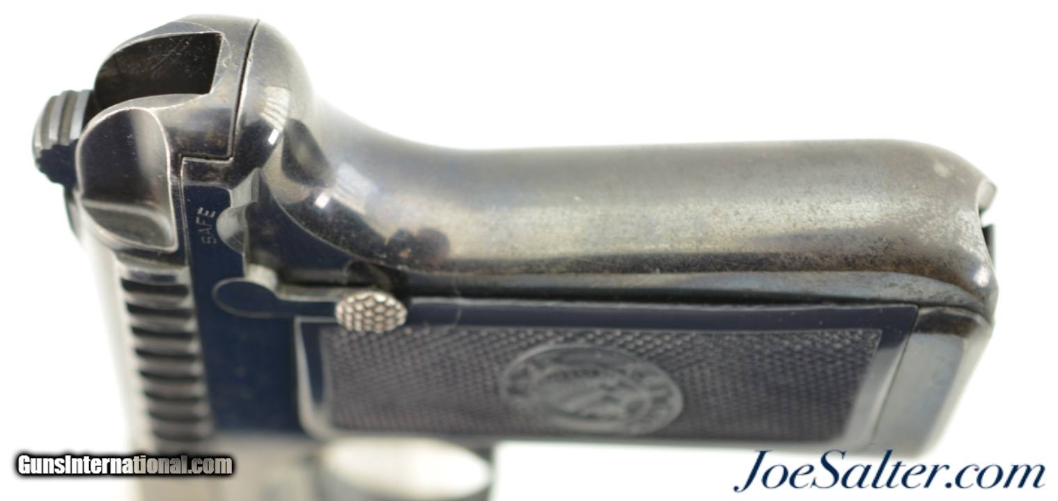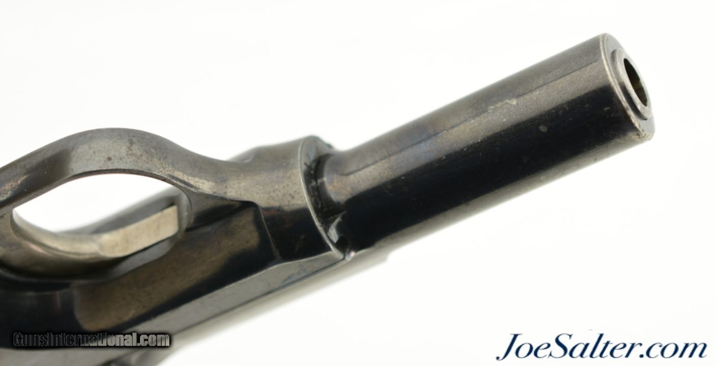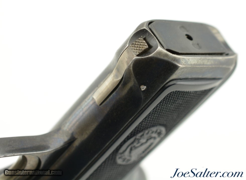 Description: Serial #71140, .32 ACP, 3 13/16 inch barrel with a bright, excellent bore. This is the Savage Model 1907 pistol manufactured in 1912. Part of the 1907-12 Transitional issues as identified in the Savage Pistols book by Bailey Brower Jr. this gun incorporates the new knurled bottom of the lever magazine release and has the magazine with two catch holes along with other internal changes from earlier versions. In excellent condition the slide and frame retain about 85-90% of the original bright blue which has thinned around the muzzle, high edges and in the grip areas with overall light use marks. The trigger shows muted case-hardened colors. The original hard rubber Savage grips rate about excellent. An excellent example of the 1907 Savage. FFL or C&R SOLD Curio/Relic: Yes |