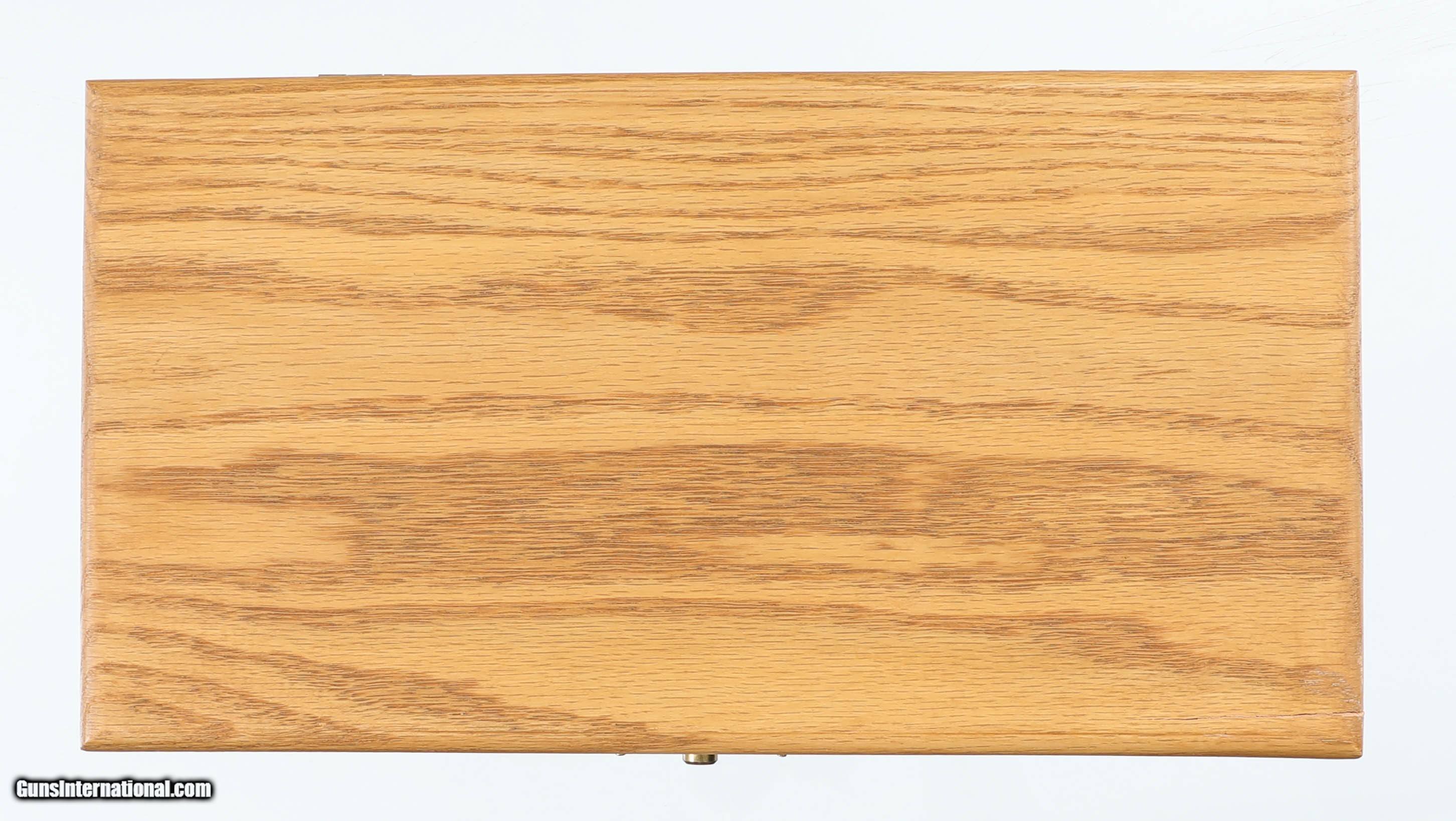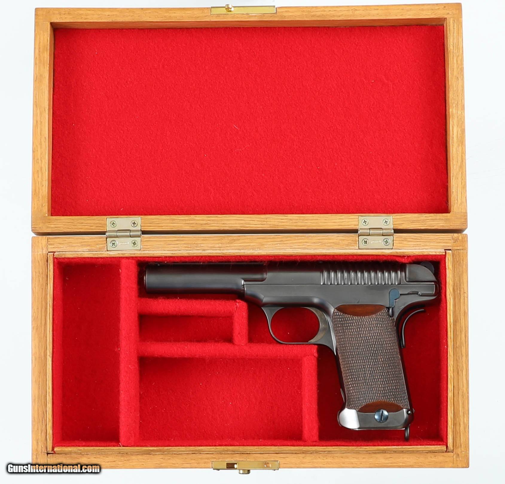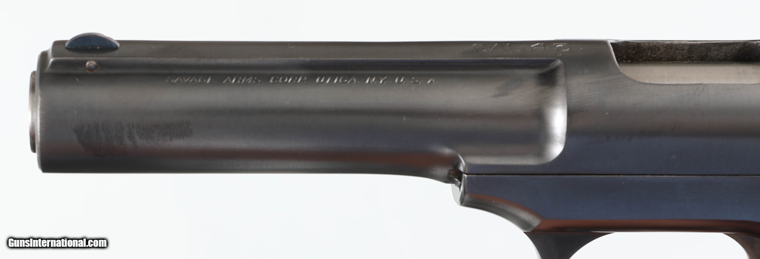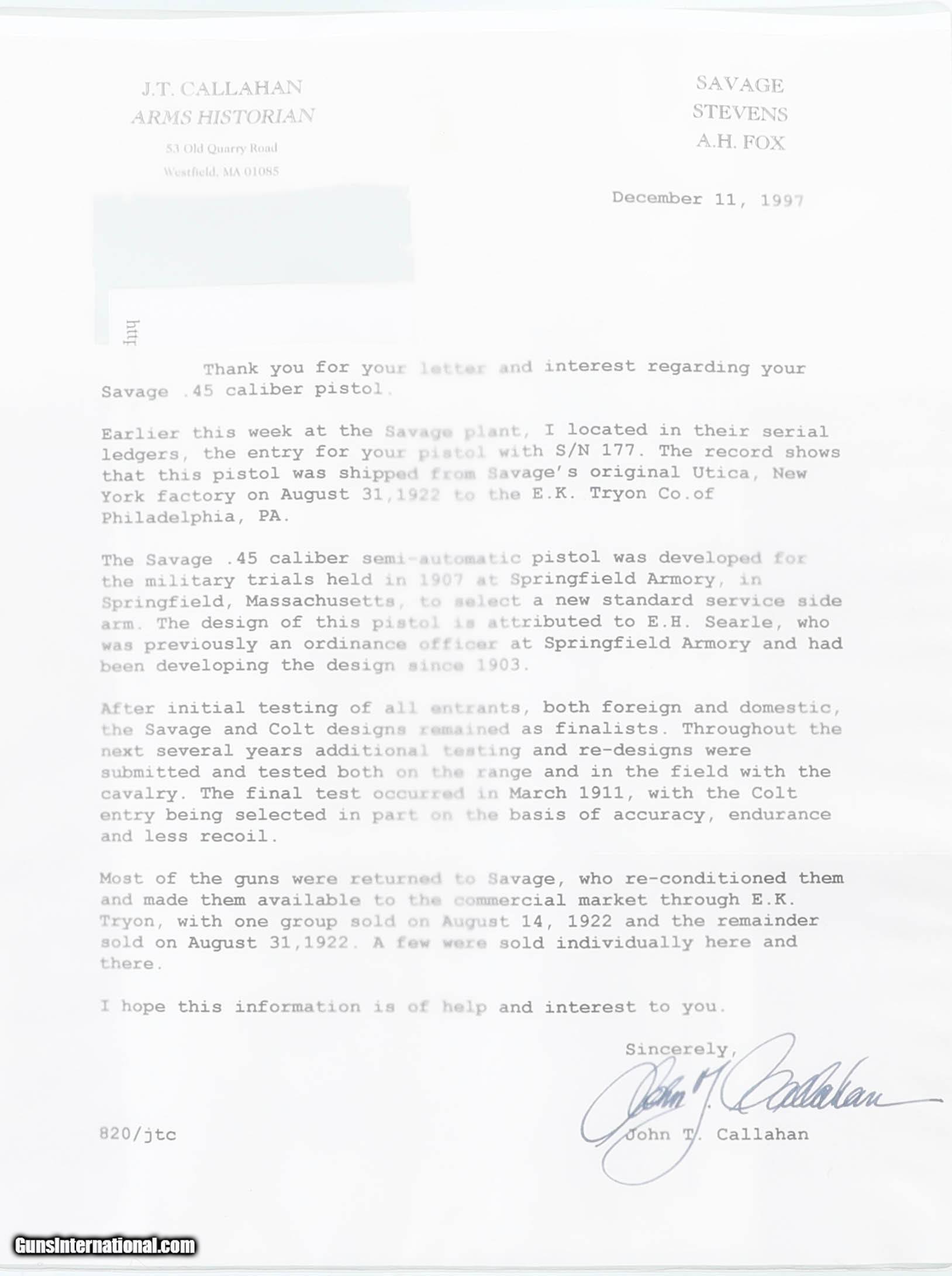 When the Colt 1911 was finally chosen over the Savage, the guns were bought back by Savage, who refinished them and sold them commercially, mostly to E. K. Tyron Co. of Philadelphia, PA This gun retains about 99-100% of the matte, blue, Savage factory refinish done by the factory. As with all the Savage buy-backs, the company name was removed from the top of the slide, leaving only ".45 CAL." However, the ones not sold to Tyron but rather sold commercially by Savage had "Savage Arms Corp. Utica, NY. U.S.A." Stamped to the left of the slide rib, as does this one. This pistol in particular is virtually new mechanically speaking with a mint bore and checkered wood grips. The serial number of the pistol is 177, the magazine is mismatched with a serial number of 78, as all surviving pistols have mis-matched magazines. We have the J.T. Callahan historical letter as photographed with the gun. The address was taken off due to confidential reasons. Mr. Callahan personally researched this pistol in the ledgers at the Savage Plant. He wrote that this pistol was shipped from Savage's original Utica, New York factory on August 31, 1922 to the E. K. Tyron Co. of Philadelphia, PA. The design of this pistol is attributed to E.H. Searle, who was previously an ordinance officer at Springfield Armory and had been developing the design since 1903. After initial testing of all entrants, both foreign and domestic, the Savage and Colt designs remained as finalists. Throughout the next several years additional testing and re-designs were submitted and tested both on the range and in the field with the Calvary. The final test occurred in March 1911, with the Colt entry being selected in part on the basis of accuracy, endurance and less recoil. Most of the guns were returned to Savage, who re-condition them and made them available to the commercial market through E.K. Tyron, with one group sold on August 14, 1922, and the rest sold on August 31, 1922. A few were sold individually here and there. This is a near new, original, and documented example of an important, experimental semi-automatic pistol manufactured in very limited numbers to compete in the U.S. Army trials against the Model 1907 Colt that eventually led to the adoption of the Colt M1911 as the Army service pistol. The vintage wood box was shipped with the gun from Harry's son, as it is solid oak with red velvet liner that compliments the bluing of the gun. He said it had been in this box for as long as he could remember the gun. (Coming from Harry's Son himself) "My Dad collected the best of all the automatic pistols in history. He was very proud of this one and claims it is the best condition sample in the world. I don't know how he would know, but it is 99+% and looks unfired since it came from the Savage factory. It is totally original, owned by one of the great gun gurus of the 20th Century. I would be happy to attest to the ownership by my father, upon request."