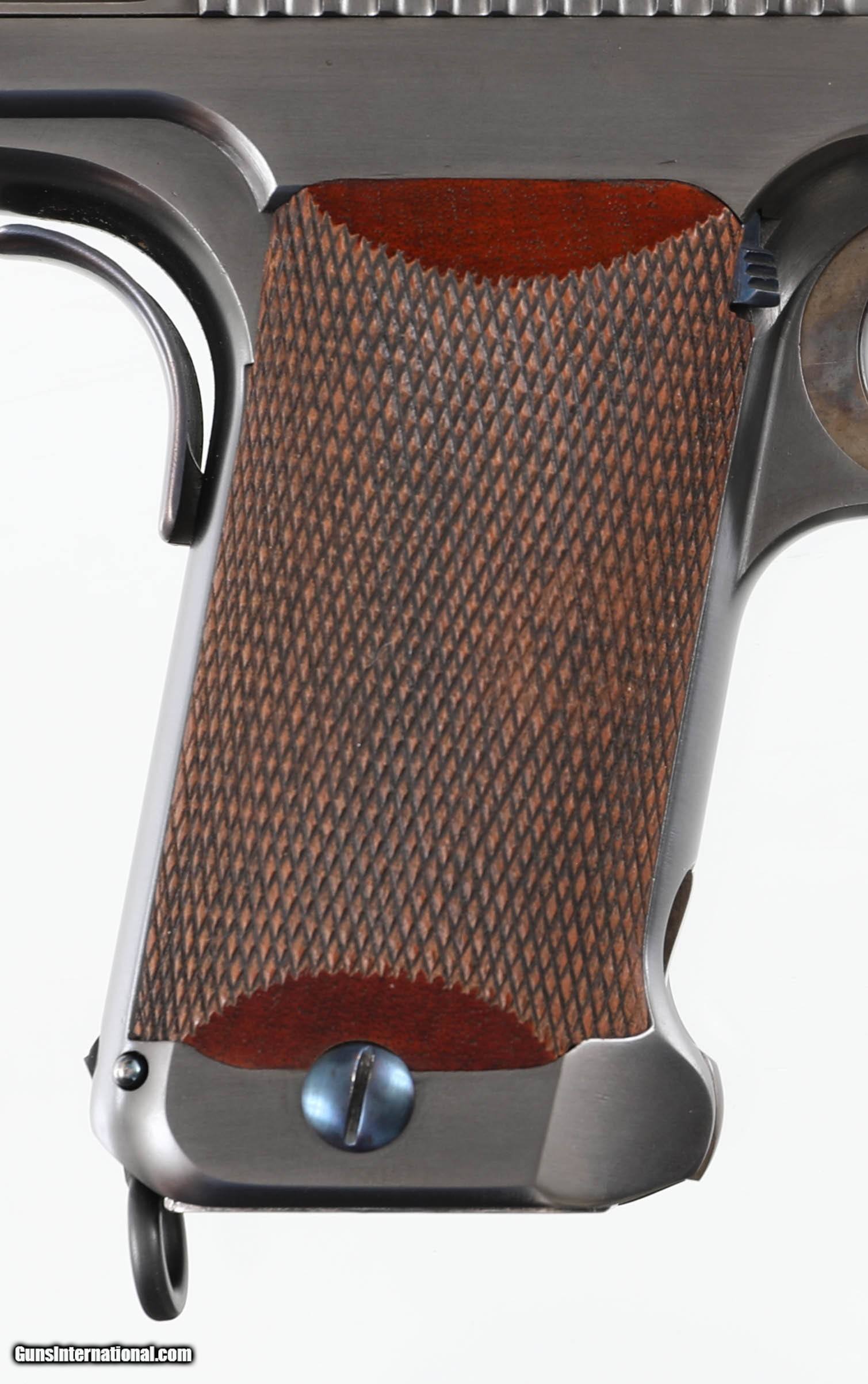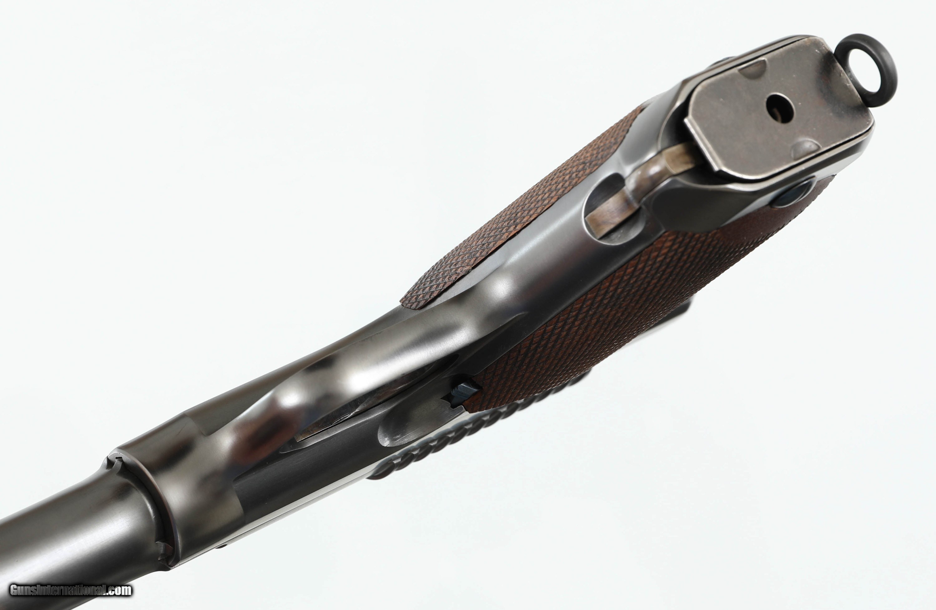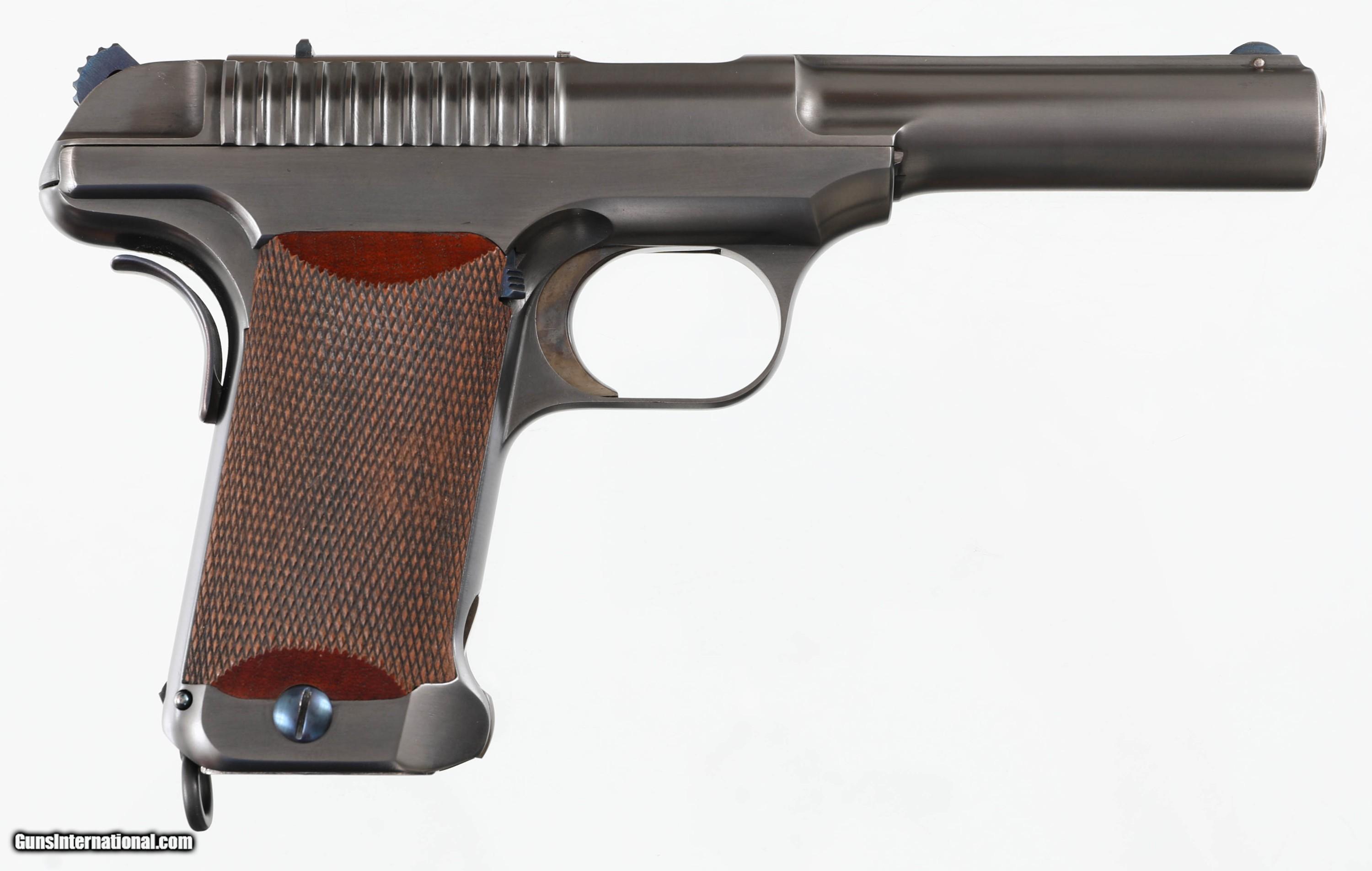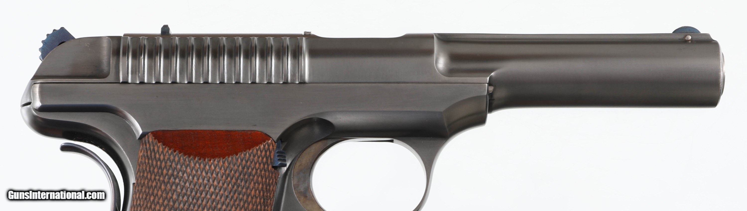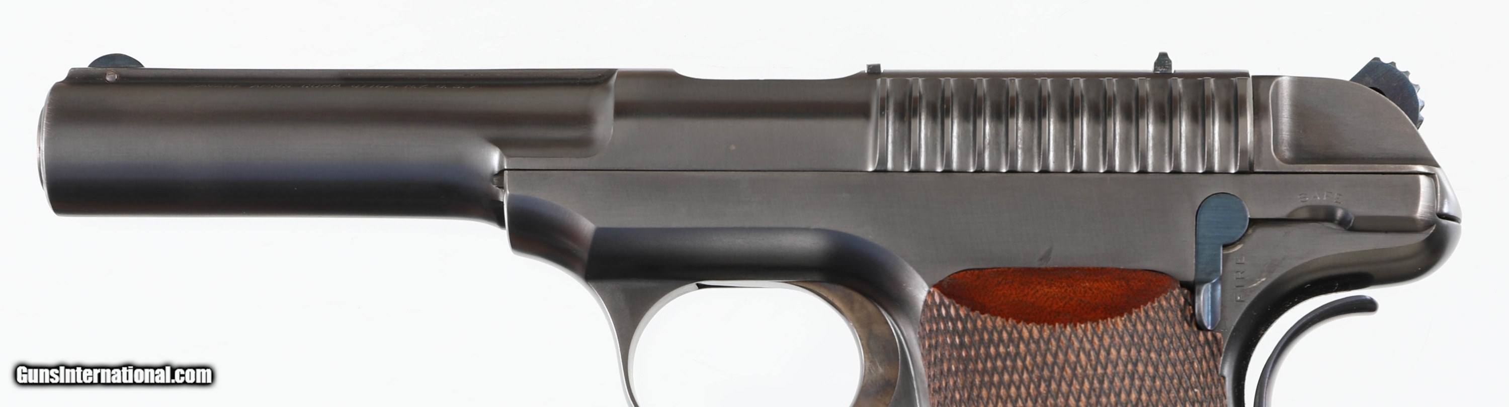 When the Colt 1911 was finally chosen over the Savage, the guns were bought back by Savage, who refinished them and sold them commercially, mostly to E. K. Tyron Co. of Philadelphia, PA This gun retains about 99-100% of the matte, blue, Savage factory refinish done by the factory. As with all the Savage buy-backs, the company name was removed from the top of the slide, leaving only ".45 CAL." However, the ones not sold to Tyron but rather sold commercially by Savage had "Savage Arms Corp. Utica, NY. U.S.A." Stamped to the left of the slide rib, as does this one. This pistol in particular is virtually new mechanically speaking with a mint bore and checkered wood grips. The serial number of the pistol is 177, the magazine is mismatched with a serial number of 78, as all surviving pistols have mis-matched magazines. We have the J.T. Callahan historical letter as photographed with the gun. The address was taken off due to confidential reasons. Mr. Callahan personally researched this pistol in the ledgers at the Savage Plant. He wrote that this pistol was shipped from Savage's original Utica, New York factory on August 31, 1922 to the E. K. Tyron Co. of Philadelphia, PA. The design of this pistol is attributed to E.H. Searle, who was previously an ordinance officer at Springfield Armory and had been developing the design since 1903. After initial testing of all entrants, both foreign and domestic, the Savage and Colt designs remained as finalists. Throughout the next several years additional testing and re-designs were submitted and tested both on the range and in the field with the Calvary. The final test occurred in March 1911, with the Colt entry being selected in part on the basis of accuracy, endurance and less recoil. Most of the guns were returned to Savage, who re-condition them and made them available to the commercial market through E.K. Tyron, with one group sold on August 14, 1922, and the rest sold on August 31, 1922. A few were sold individually here and there. This is a near new, original, and documented example of an important, experimental semi-automatic pistol manufactured in very limited numbers to compete in the U.S. Army trials against the Model 1907 Colt that eventually led to the adoption of the Colt M1911 as the Army service pistol. The vintage wood box was shipped with the gun from Harry's son, as it is solid oak with red velvet liner that compliments the bluing of the gun. He said it had been in this box for as long as he could remember the gun. (Coming from Harry's Son himself) "My Dad collected the best of all the automatic pistols in history. He was very proud of this one and claims it is the best condition sample in the world. I don't know how he would know, but it is 99+% and looks unfired since it came from the Savage factory. It is totally original, owned by one of the great gun gurus of the 20th Century. I would be happy to attest to the ownership by my father, upon request."
