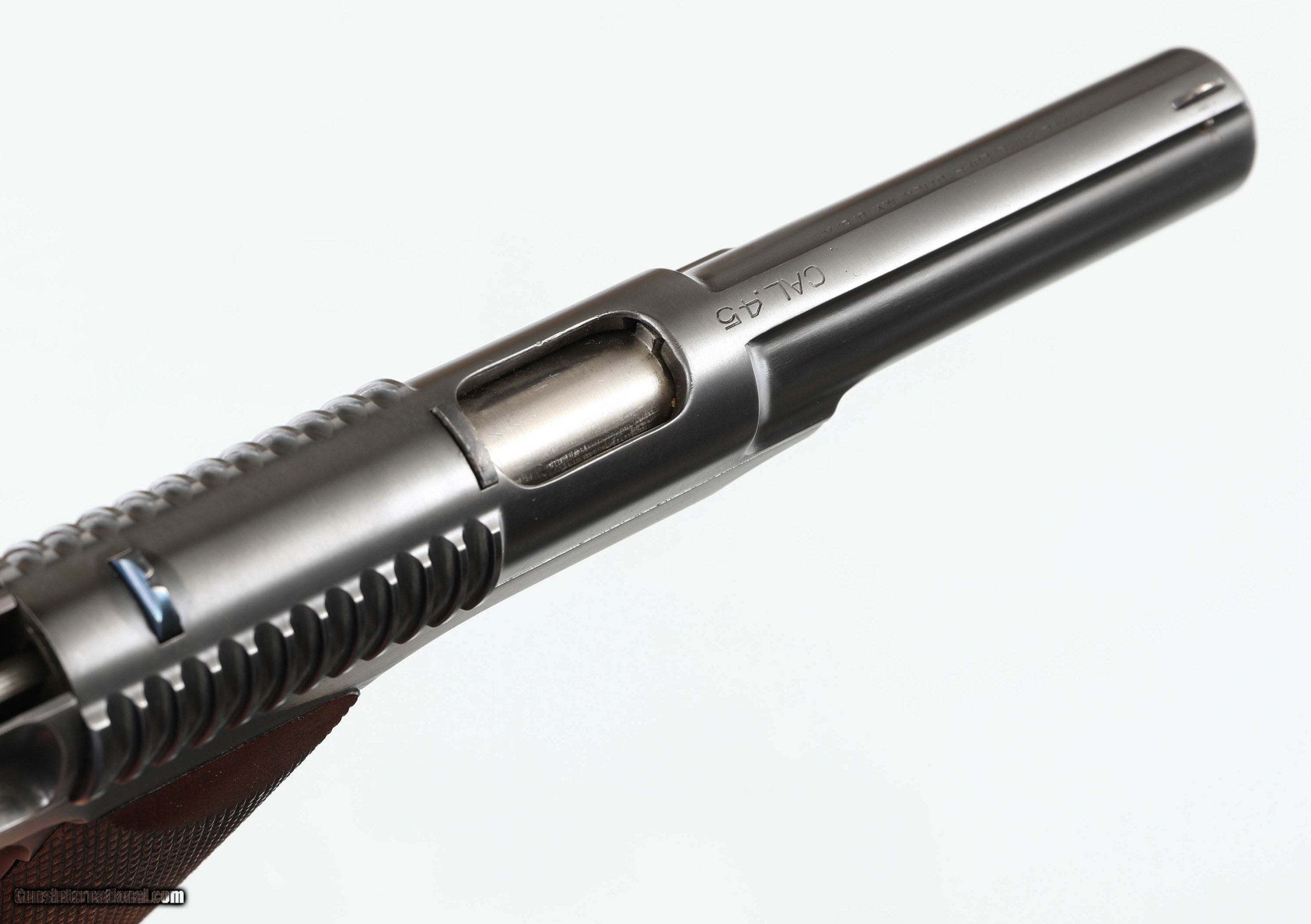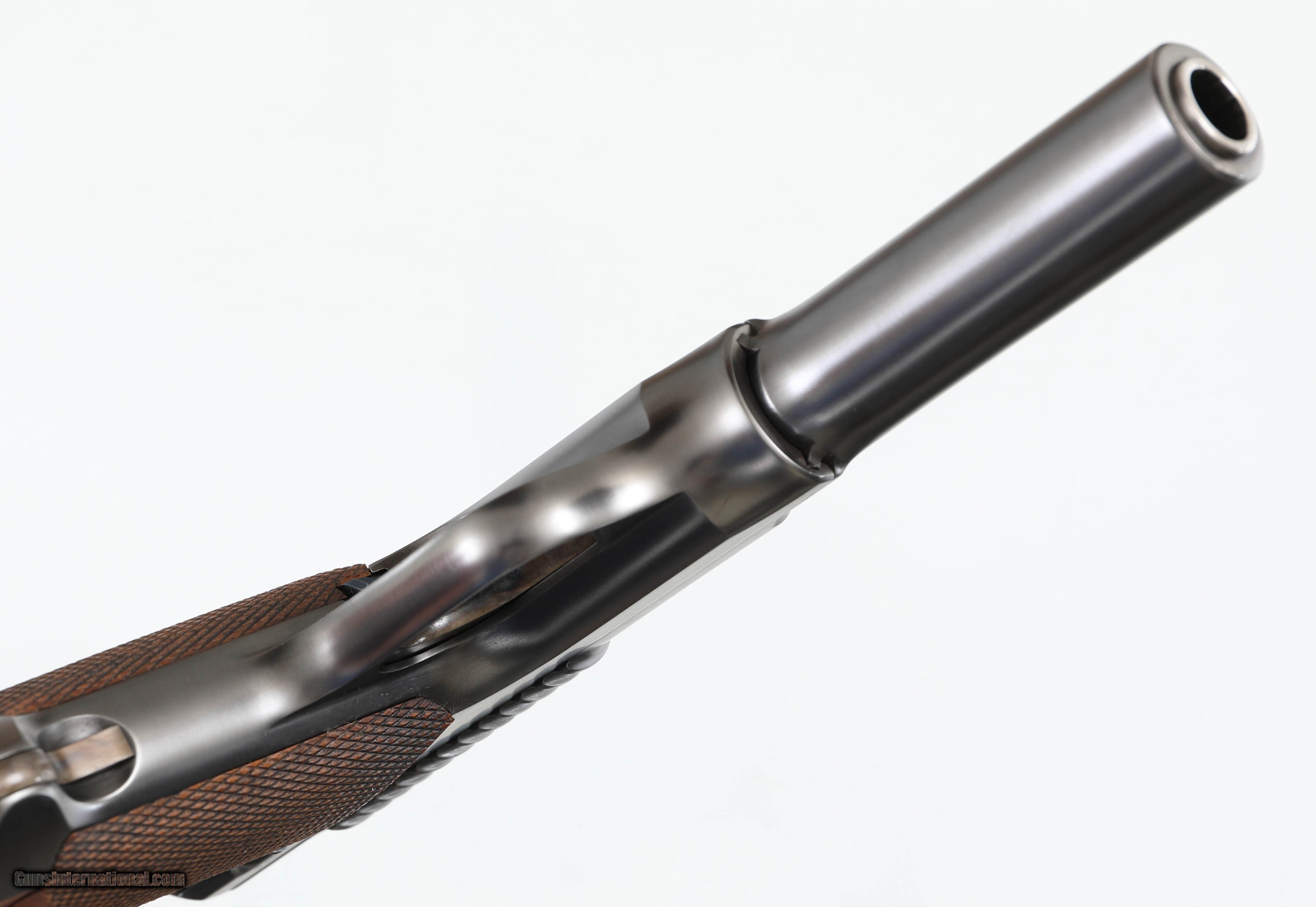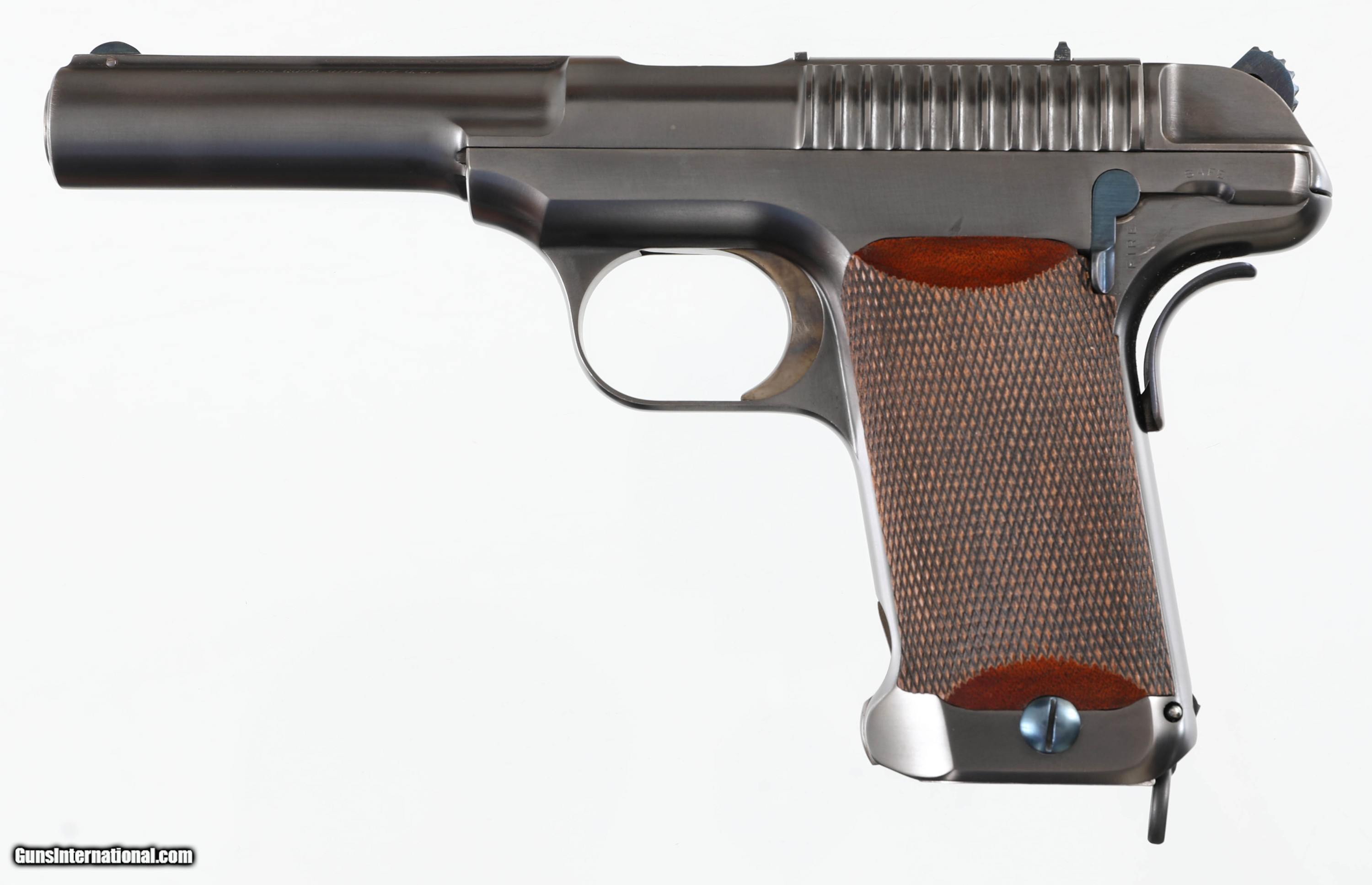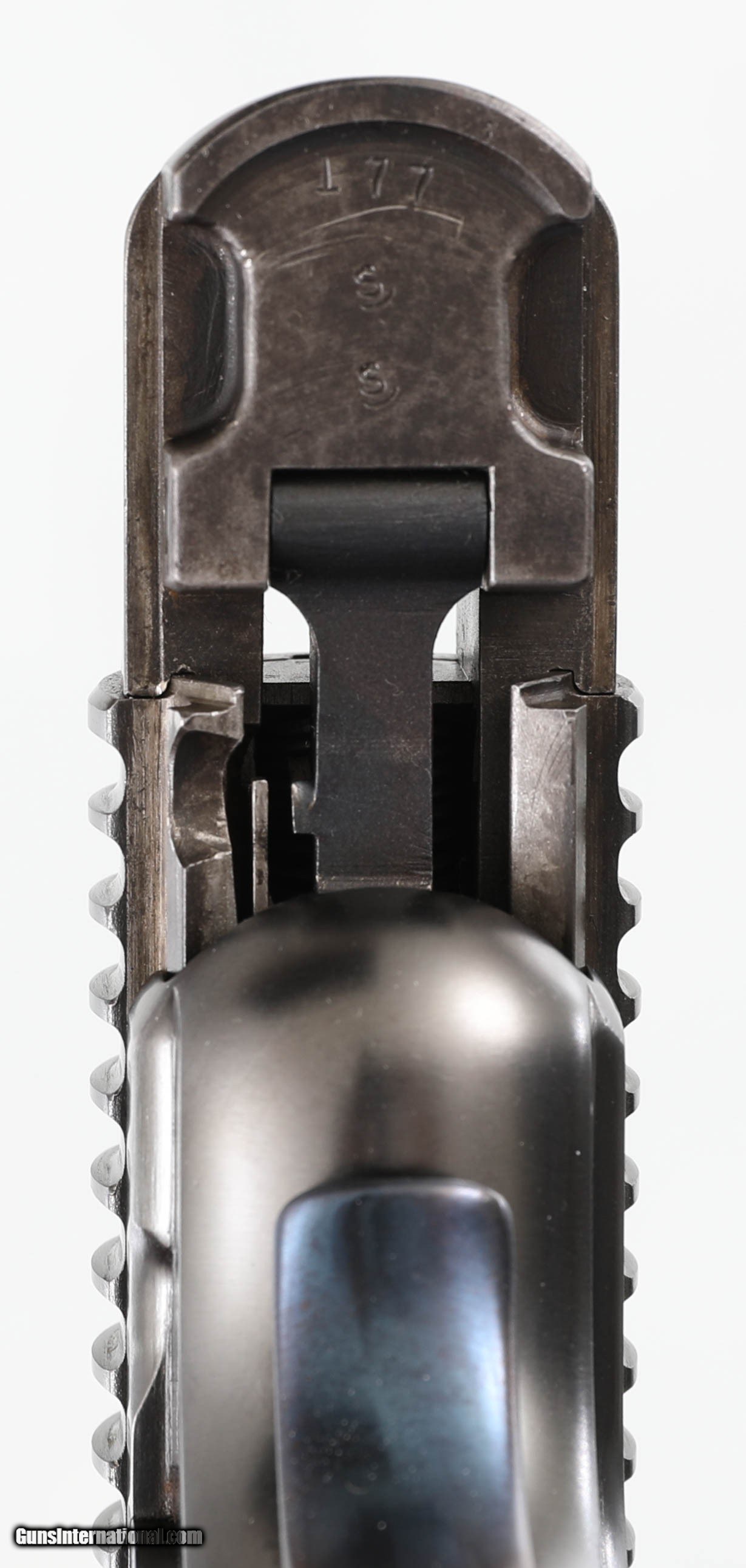 When the Colt 1911 was finally chosen over the Savage, the guns were bought back by Savage, who refinished them and sold them commercially, mostly to E. K. Tyron Co. of Philadelphia, PA This gun retains about 99-100% of the matte, blue, Savage factory refinish done by the factory. As with all the Savage buy-backs, the company name was removed from the top of the slide, leaving only ".45 CAL." However, the ones not sold to Tyron but rather sold commercially by Savage had "Savage Arms Corp. Utica, NY. U.S.A." Stamped to the left of the slide rib, as does this one. This pistol in particular is virtually new mechanically speaking with a mint bore and checkered wood grips. The serial number of the pistol is 177, the magazine is mismatched with a serial number of 78, as all surviving pistols have mis-matched magazines. We have the J.T. Callahan historical letter as photographed with the gun. The address was taken off due to confidential reasons. Mr. Callahan personally researched this pistol in the ledgers at the Savage Plant. He wrote that this pistol was shipped from Savage's original Utica, New York factory on August 31, 1922 to the E. K. Tyron Co. of Philadelphia, PA. The design of this pistol is attributed to E.H. Searle, who was previously an ordinance officer at Springfield Armory and had been developing the design since 1903. After initial testing of all entrants, both foreign and domestic, the Savage and Colt designs remained as finalists. Throughout the next several years additional testing and re-designs were submitted and tested both on the range and in the field with the Calvary. The final test occurred in March 1911, with the Colt entry being selected in part on the basis of accuracy, endurance and less recoil. Most of the guns were returned to Savage, who re-condition them and made them available to the commercial market through E.K. Tyron, with one group sold on August 14, 1922, and the rest sold on August 31, 1922. A few were sold individually here and there. This is a near new, original, and documented example of an important, experimental semi-automatic pistol manufactured in very limited numbers to compete in the U.S. Army trials against the Model 1907 Colt that eventually led to the adoption of the Colt M1911 as the Army service pistol. The vintage wood box was shipped with the gun from Harry's son, as it is solid oak with red velvet liner that compliments the bluing of the gun. He said it had been in this box for as long as he could remember the gun. (Coming from Harry's Son himself) "My Dad collected the best of all the automatic pistols in history. He was very proud of this one and claims it is the best condition sample in the world. I don't know how he would know, but it is 99+% and looks unfired since it came from the Savage factory. It is totally original, owned by one of the great gun gurus of the 20th Century. I would be happy to attest to the ownership by my father, upon request."