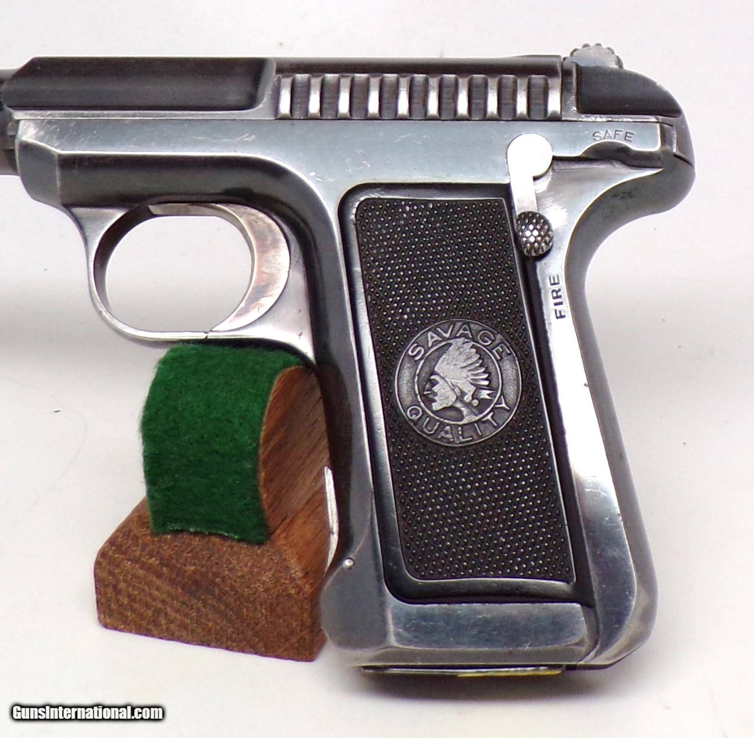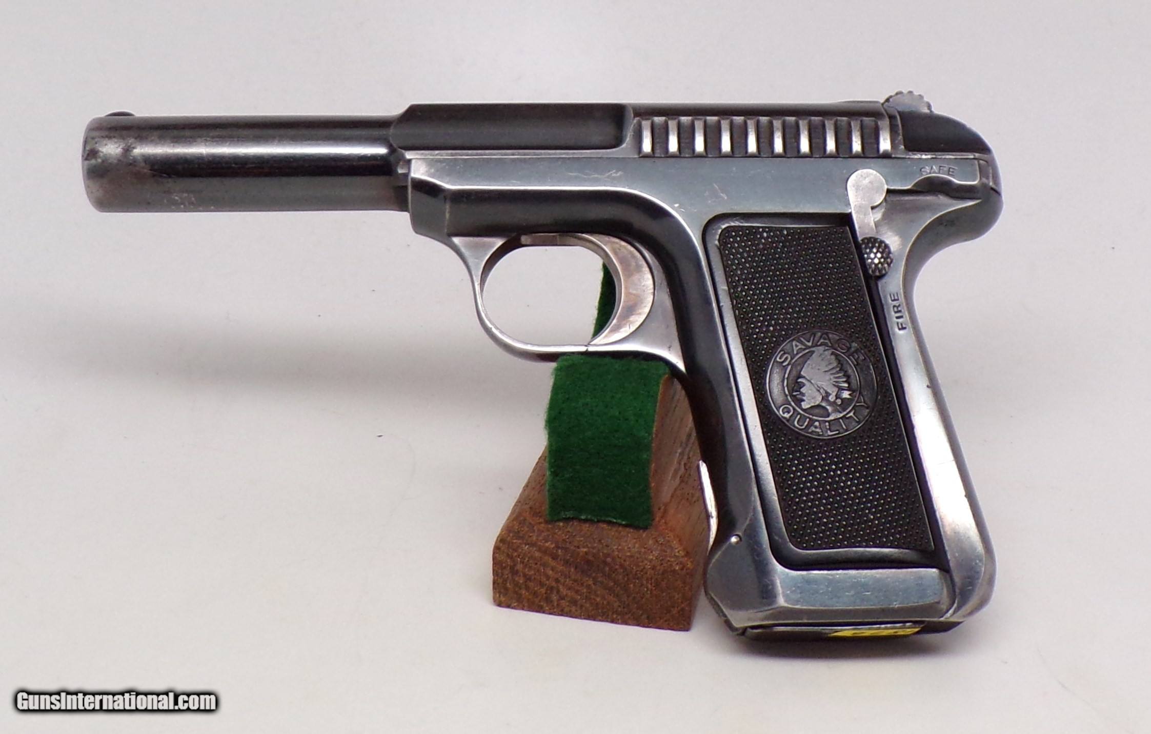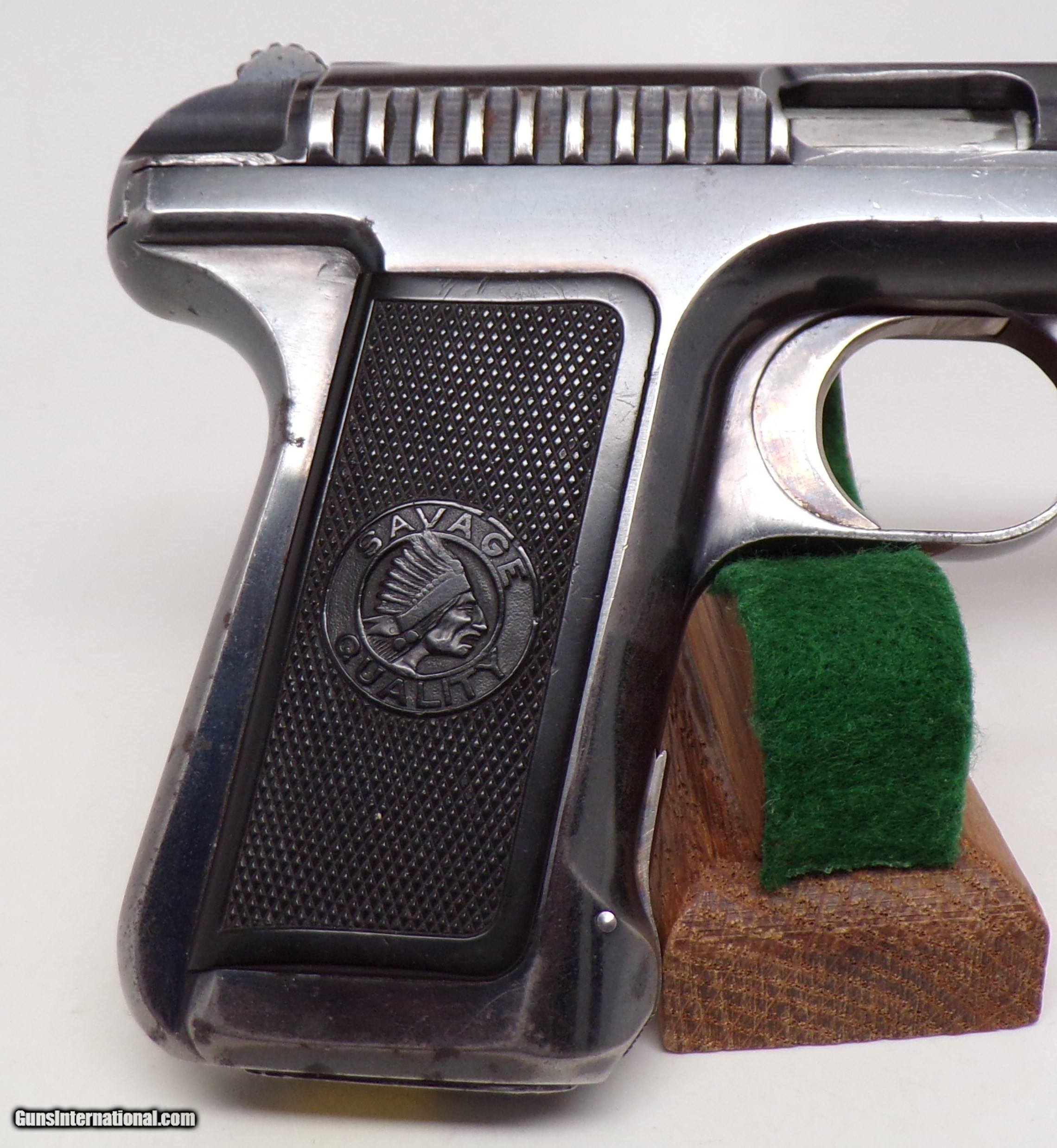 Description: SOLD These Savage pistols are a lot of fun to shoot. Not sure I have shot this one, but have shot a number of the 1907 380s. Bore in the 4" barrel is bright and shiny. It shows little wear and good care. It will rate a nine on a one to ten scale. Action is smooth and tight. It works perfectly. Markings are clear and original. A lot of the original blue finish remains. This one has a loaded chamber indicator. Notice there is still nice case color on the trigger. Grips are excellent with no cracks or chips. Magazine is correct for the pistol. One interesting fact about these pistols, there are 0 screws holding them together. You will enjoy shooting this pistol. It will make a great addition to your shooting collection. For more pictures or information please contact me. American Arms & Antiques item #2789. SOLD |
