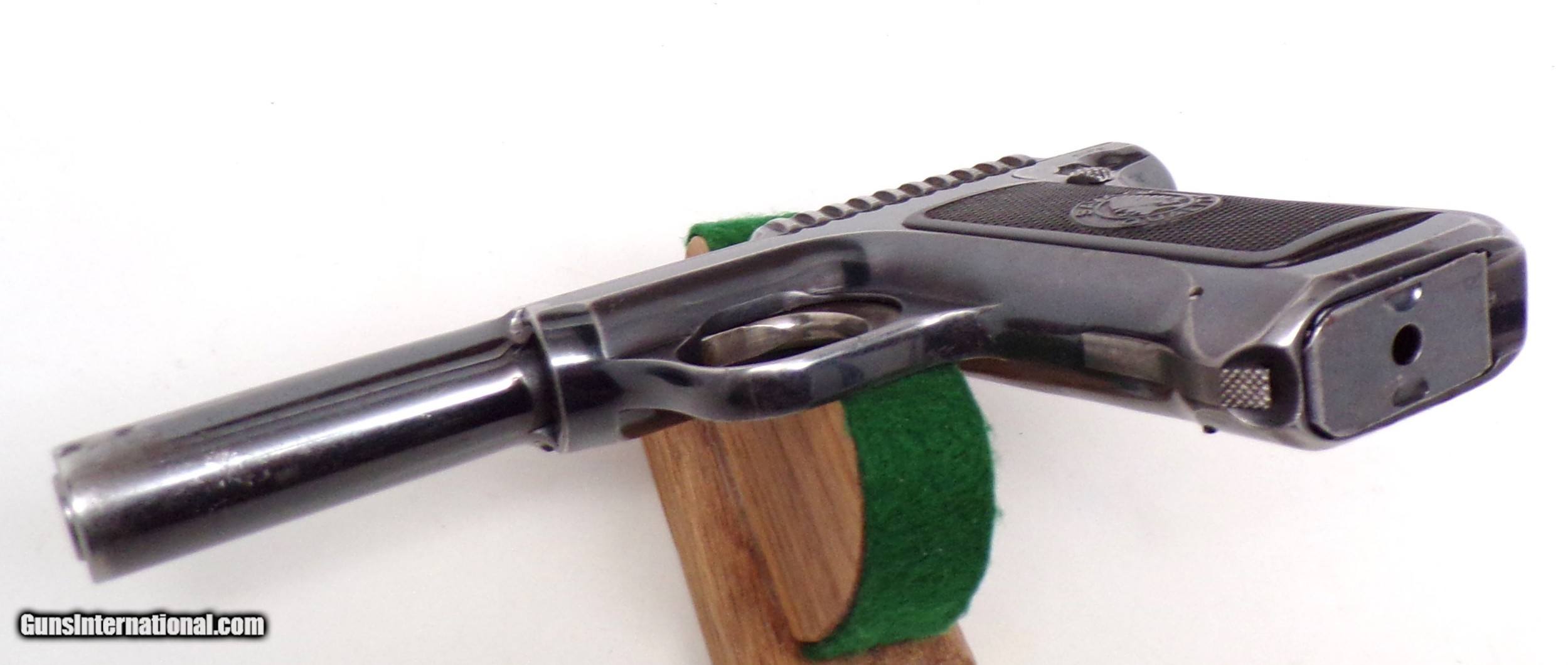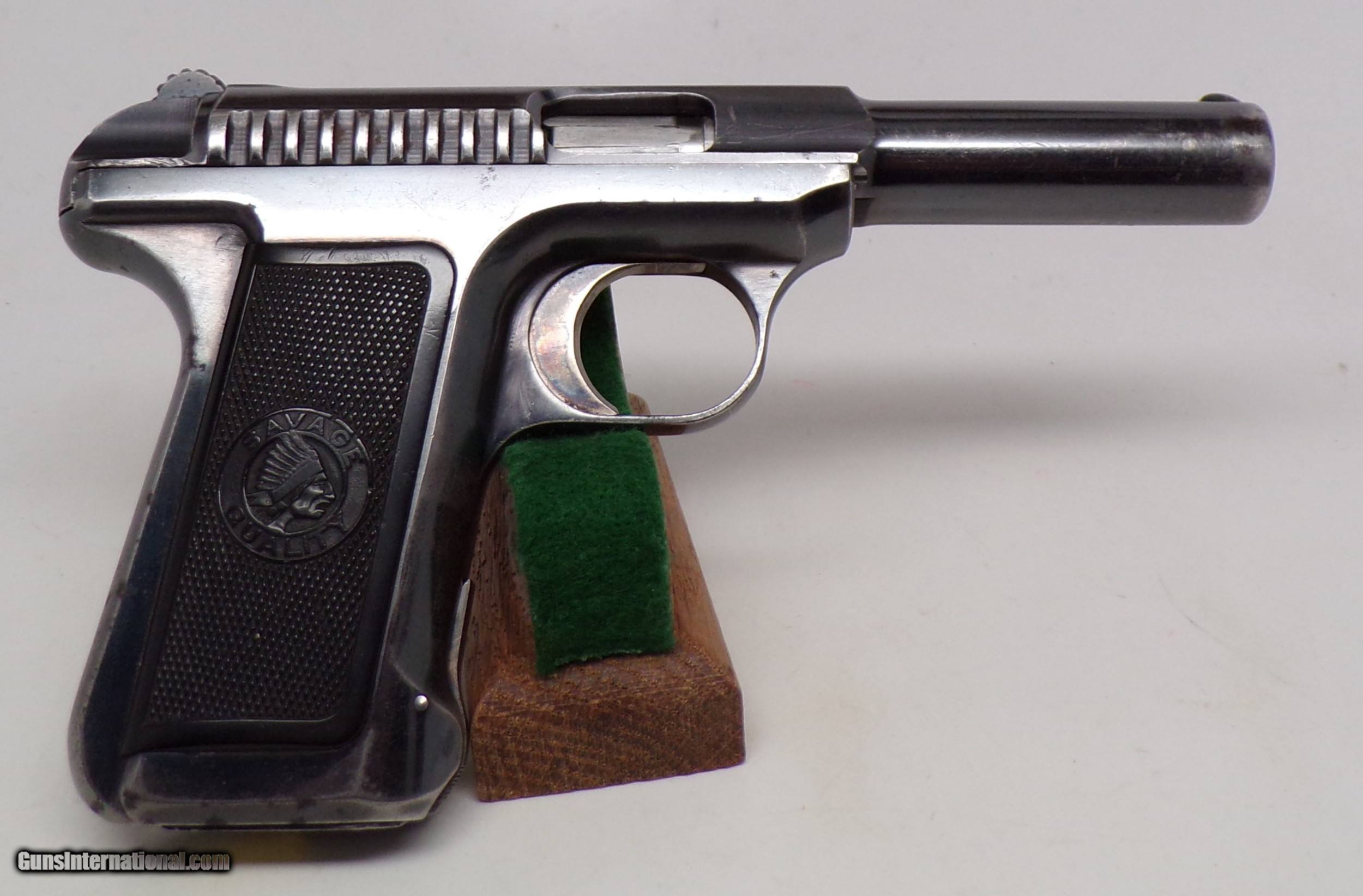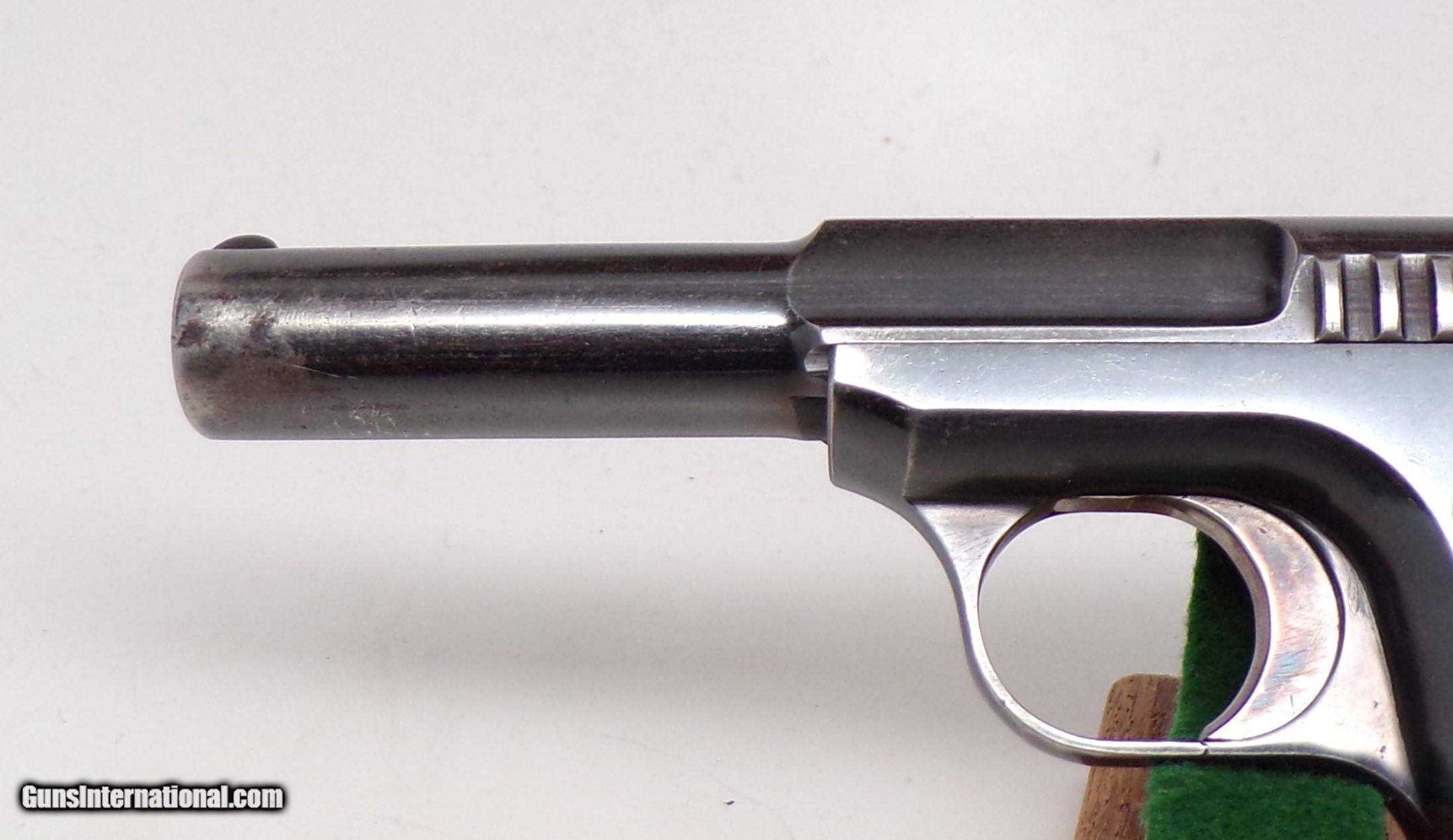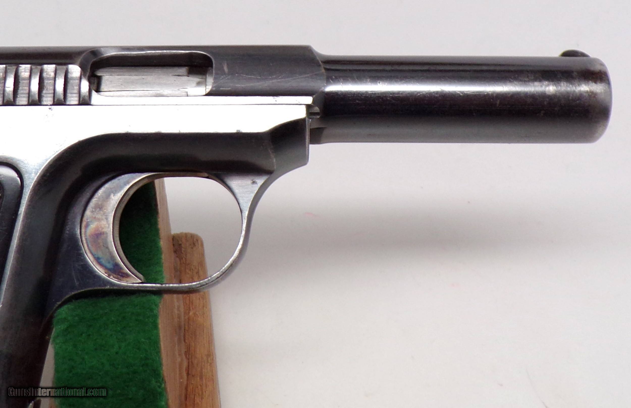 Description: SOLD These Savage pistols are a lot of fun to shoot. Not sure I have shot this one, but have shot a number of the 1907 380s. Bore in the 4" barrel is bright and shiny. It shows little wear and good care. It will rate a nine on a one to ten scale. Action is smooth and tight. It works perfectly. Markings are clear and original. A lot of the original blue finish remains. This one has a loaded chamber indicator. Notice there is still nice case color on the trigger. Grips are excellent with no cracks or chips. Magazine is correct for the pistol. One interesting fact about these pistols, there are 0 screws holding them together. You will enjoy shooting this pistol. It will make a great addition to your shooting collection. For more pictures or information please contact me. American Arms & Antiques item #2789. SOLD |