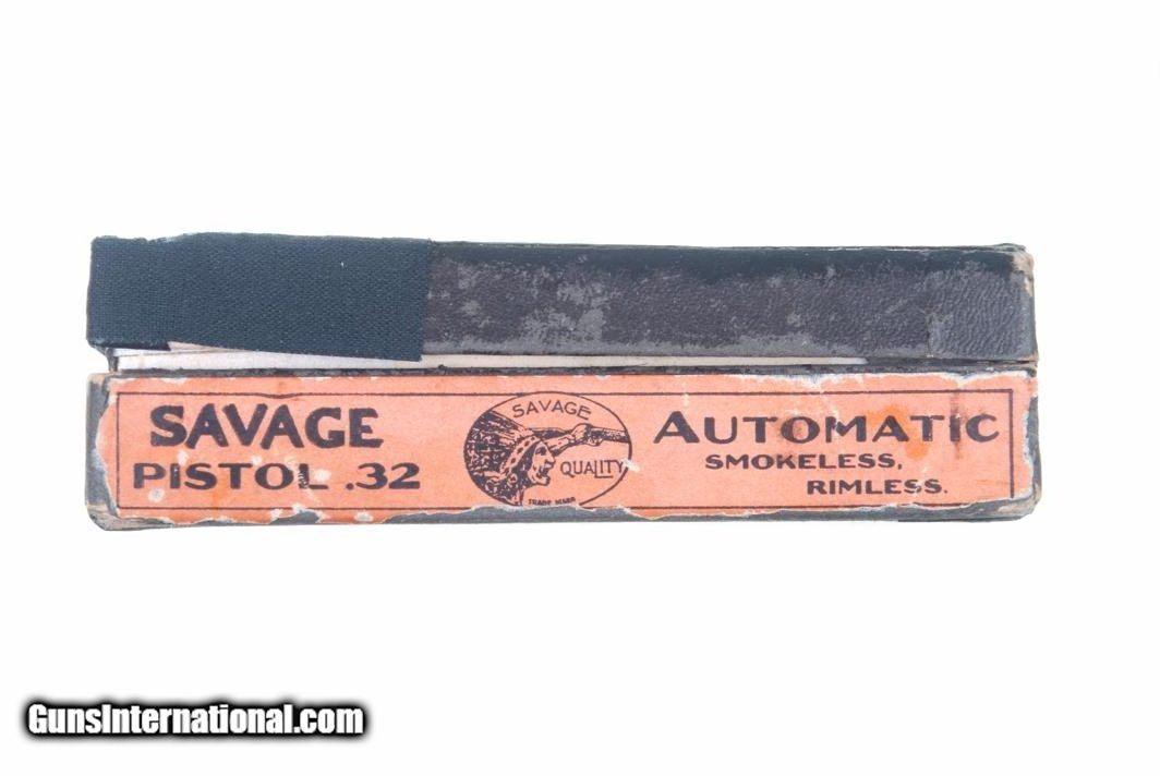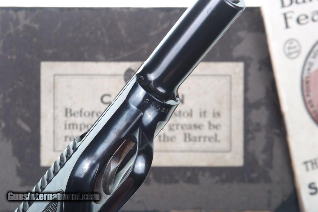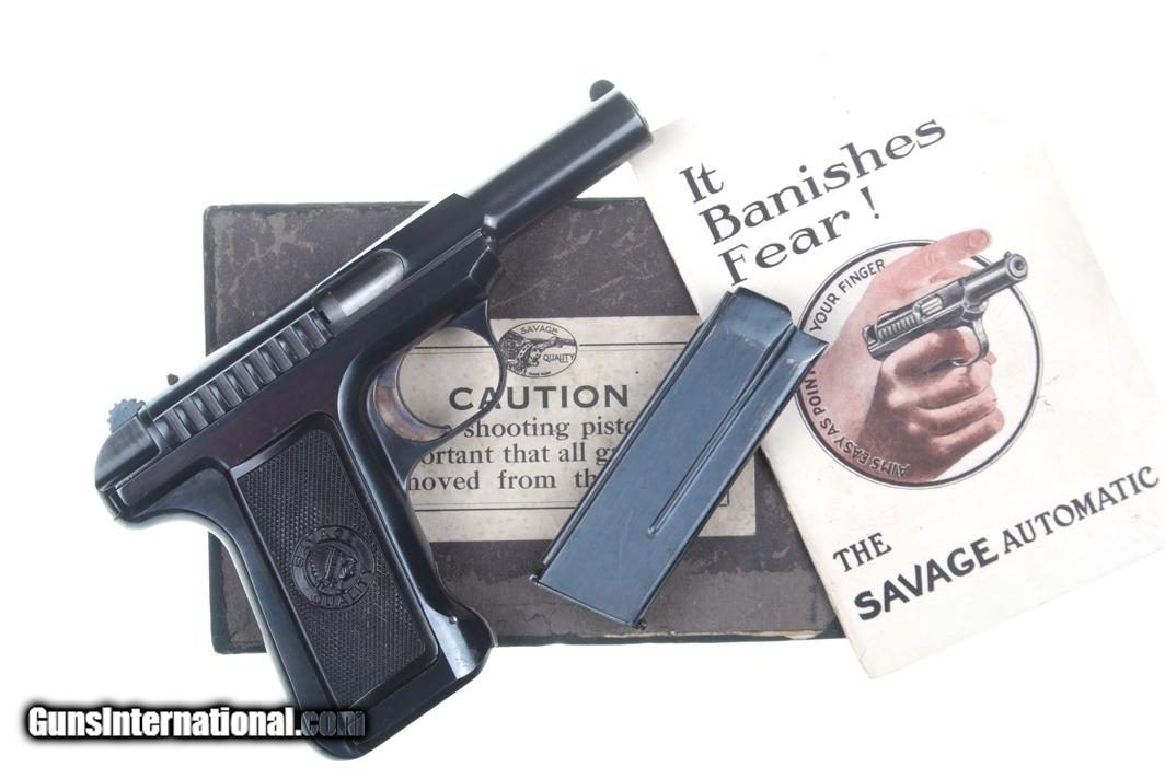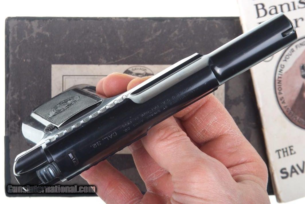 Description: Standard configuration Savage 1907, manufactured in 1910, with a high polish blued finish, fixed sights, broad slide serrations, barrel without loaded indicator, and original "Savage Quality" logoed hard rubber grips. Color case hardened trigger and magazine release. Original magazine with slotted ports on left side, no caliber marking as correct for .32 ACP. Complete with an original but non matching shipping box and 40 page instruction manual. Synopsis: Virtually New, Savage, 1907, High Polish Blue, .32 ACP, Boxed, Booklet Condition: Spectacular NEAR NEW condition pistol with only the faintest pin prick freckling on back strap and near bottom of frame. Vivid, bright case colors just as when left the factory. Comparable condition grips. Exc+ magazine with only the most minute insertional wear. Mirror bore with sharp rifling. Perfect manual mechanics. VG+ box with black (external) and white (internal) taped repairs as carefully photographed. Near excellent instruction manual. A superb, example of an early production Savage 1907, whose condition would be virtually impossible to upgrade! ~~Insured shipping fee of $65; most packages shipped using FedEx 2nd Day.~~ SOLD Curio/Relic: Yes Manufacturer: Savage Serial Number: 28025 Caliber Info: 0.32 ACP |