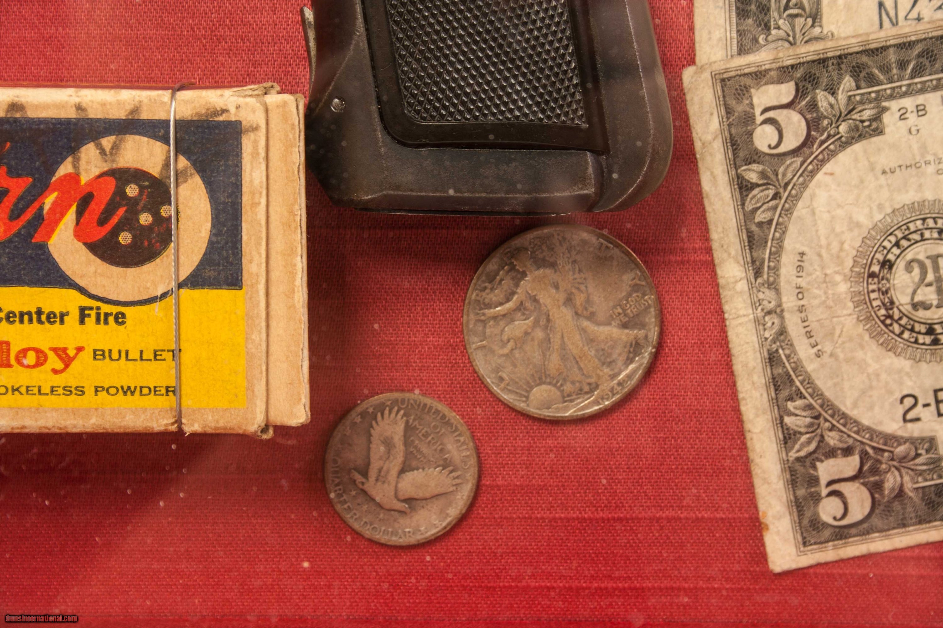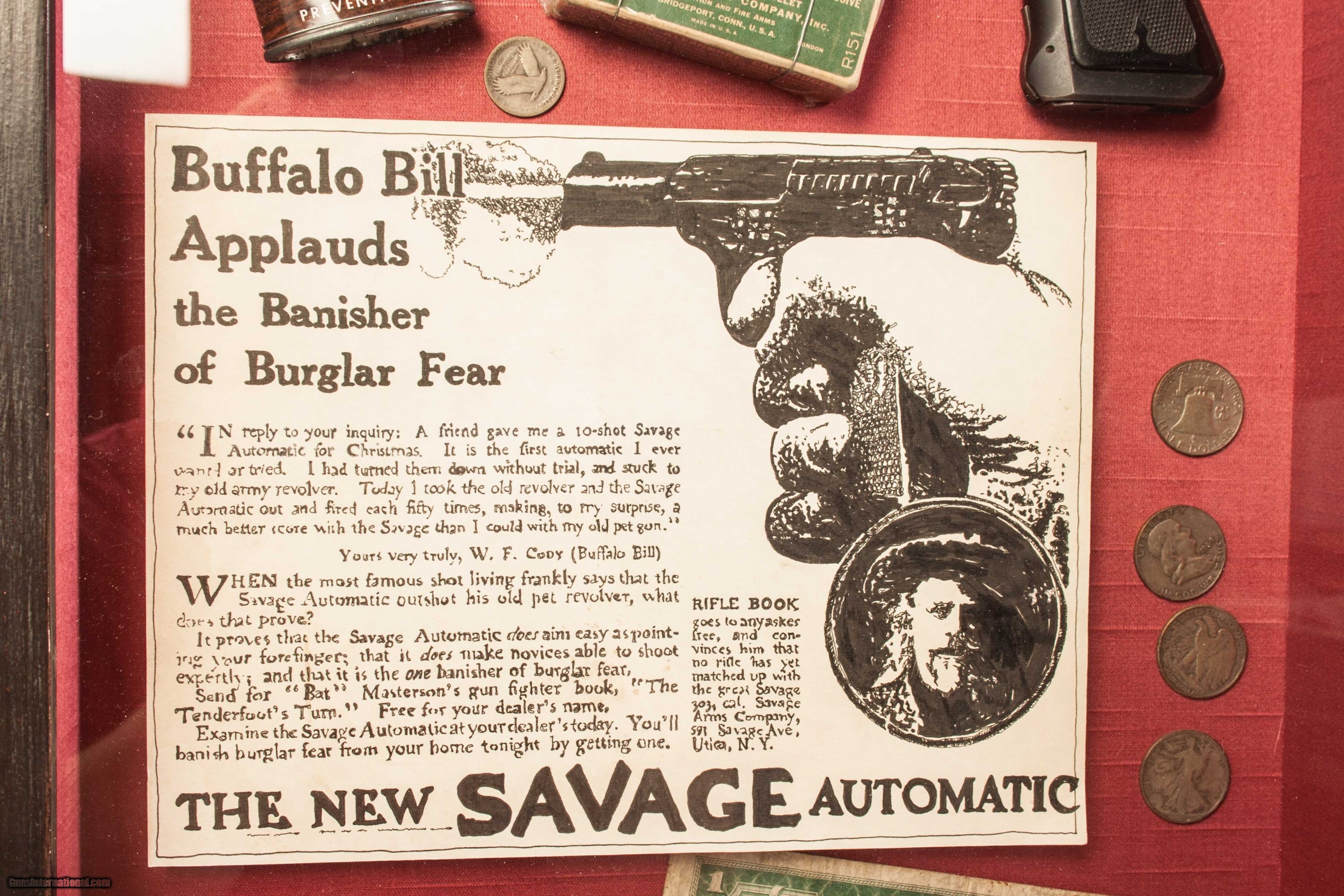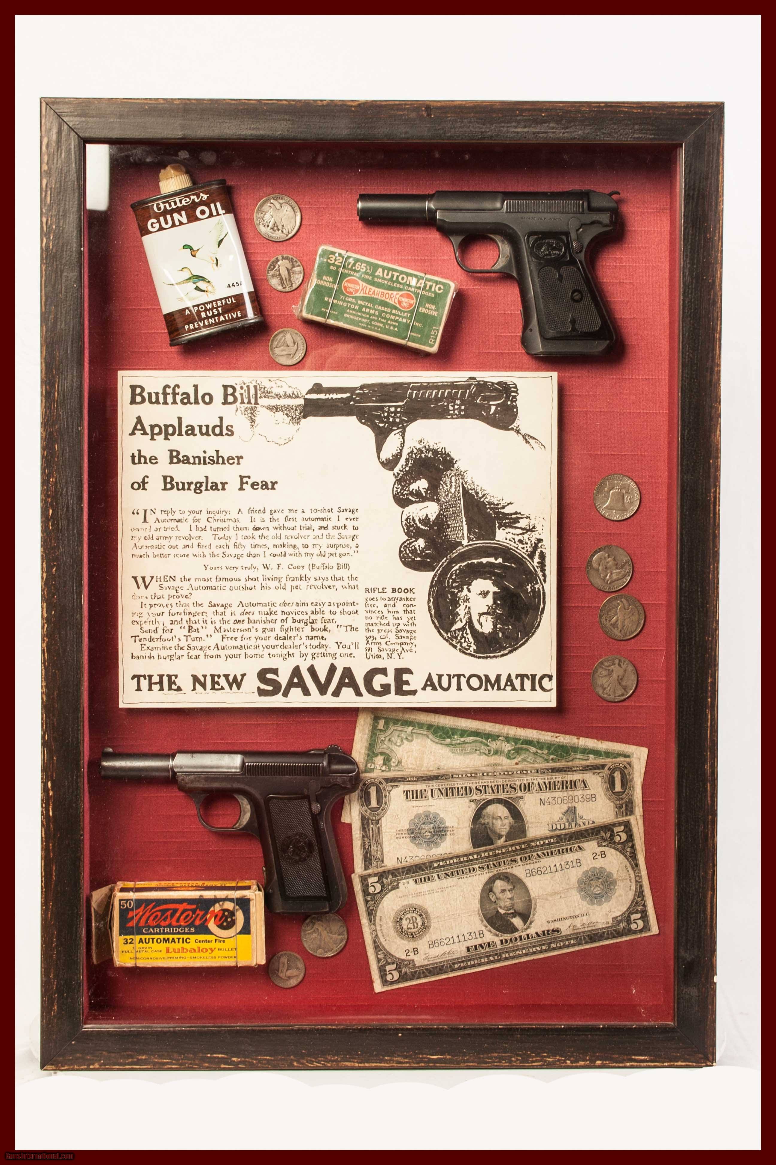 Savage 1917 Automatic display with era correct US currency newsarticle about the firearm when it was originally released in a sealed frame. This gun is in excellent condition and is covered by Dury's Lifetime Warranty.