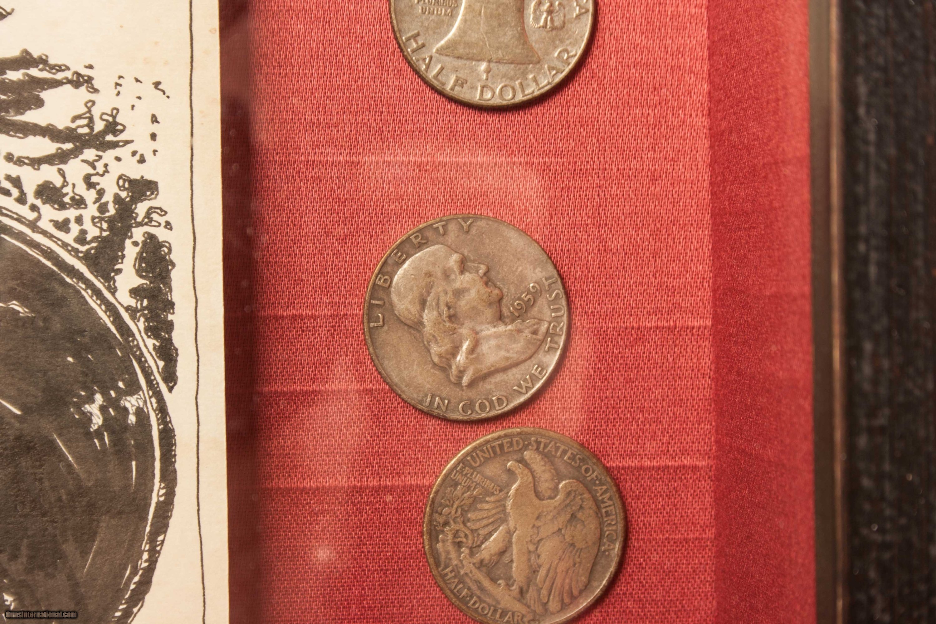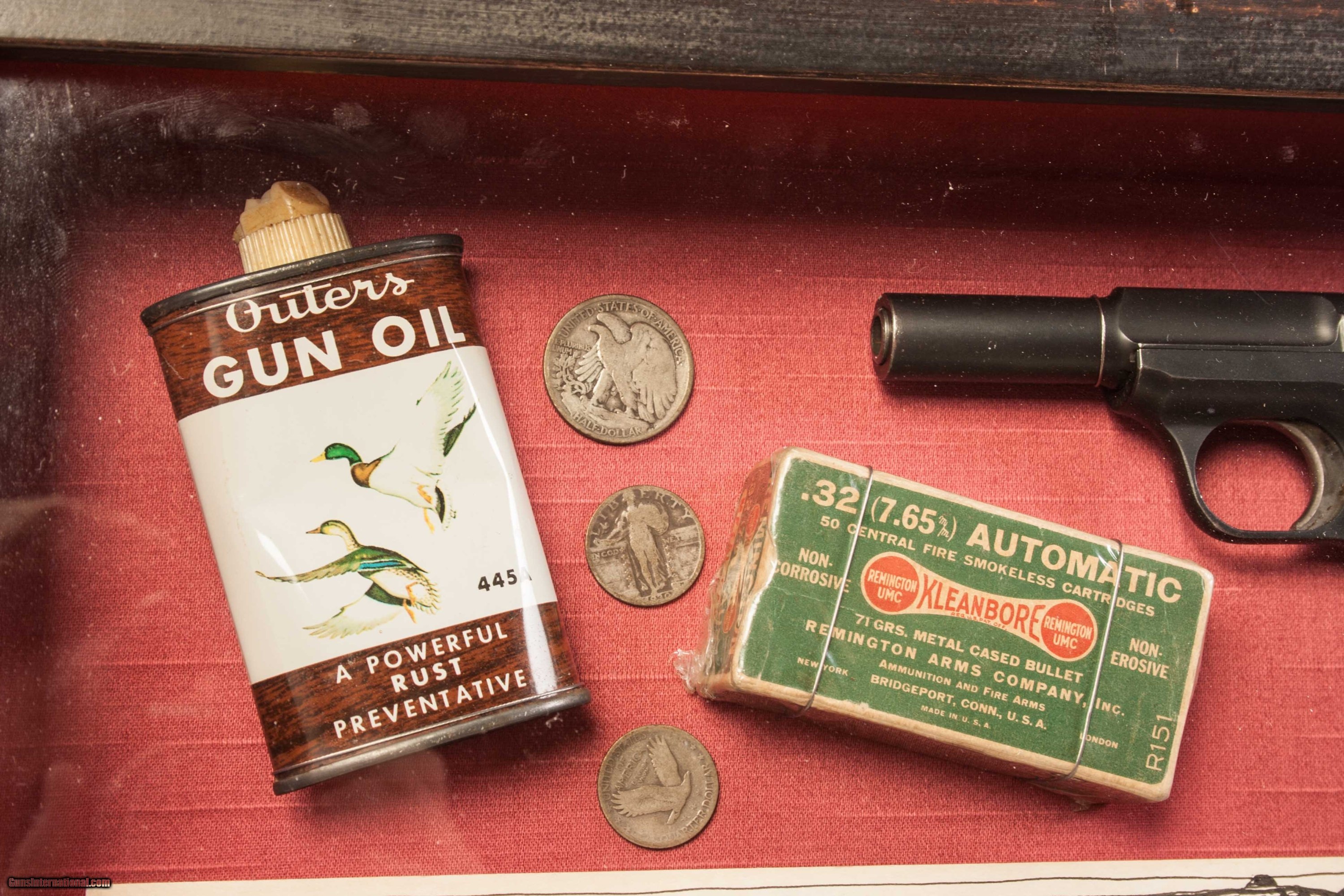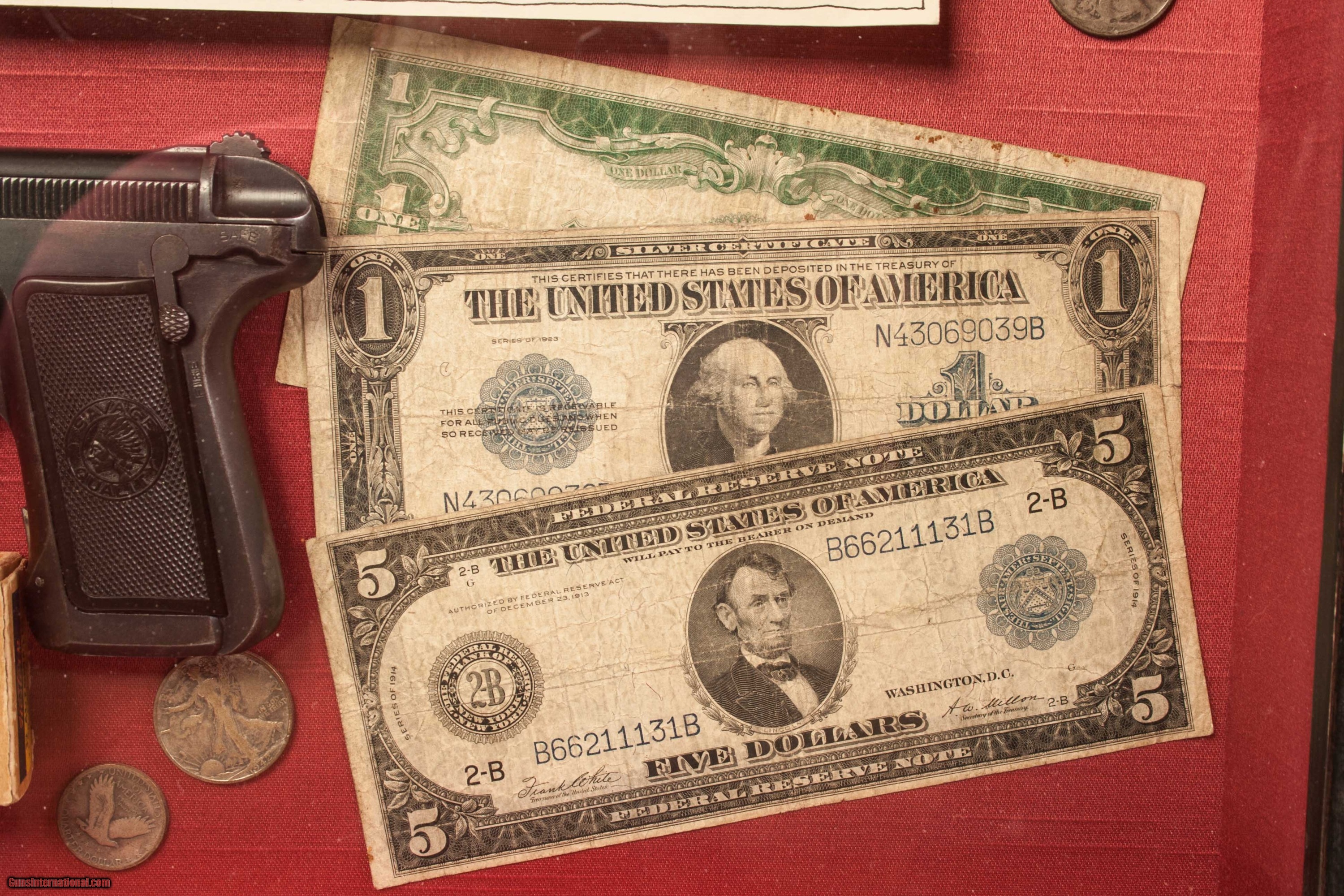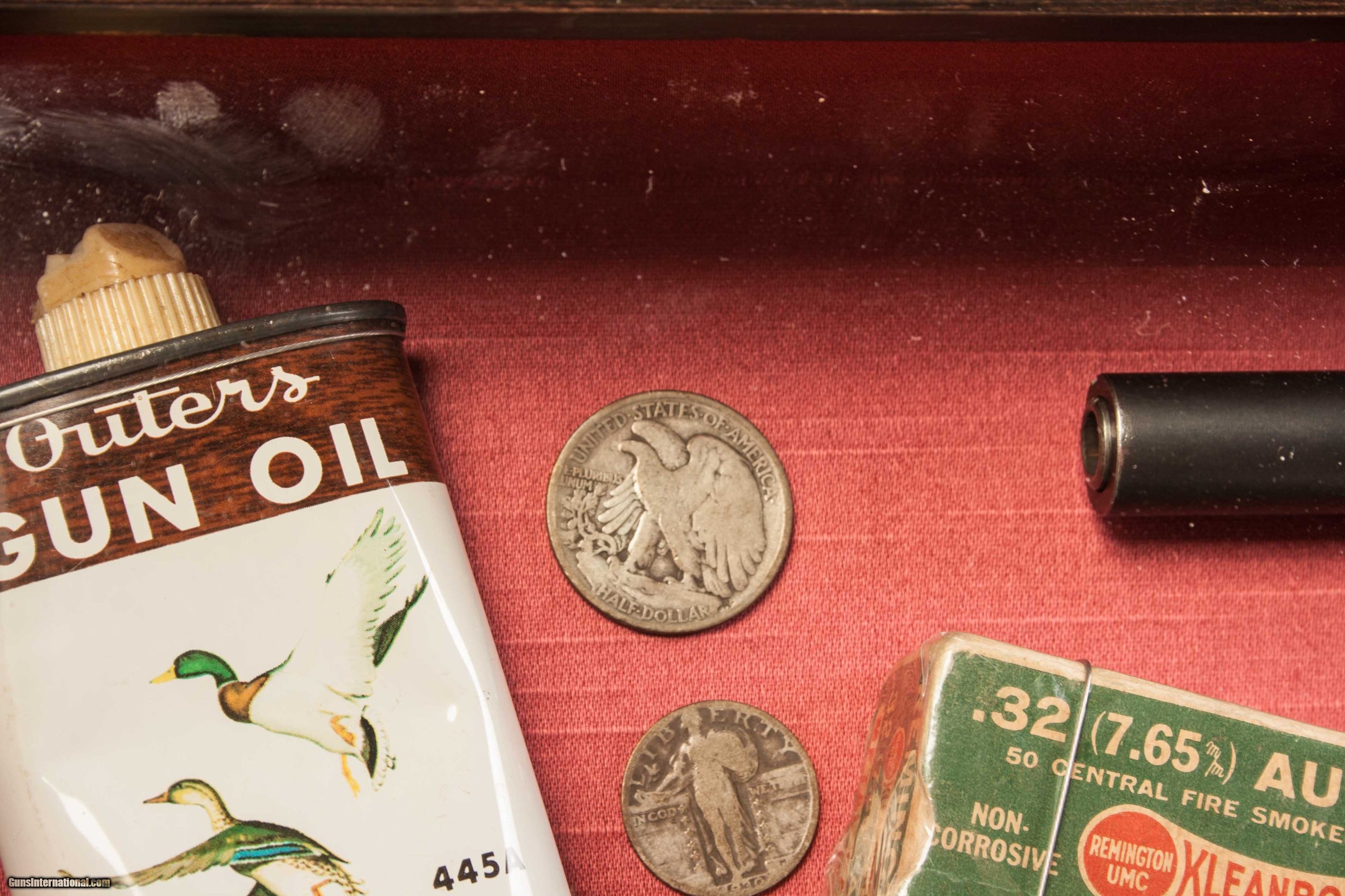 Savage 1917 Automatic display with era correct US currency newsarticle about the firearm when it was originally released in a sealed frame. This gun is in excellent condition and is covered by Dury's Lifetime Warranty.