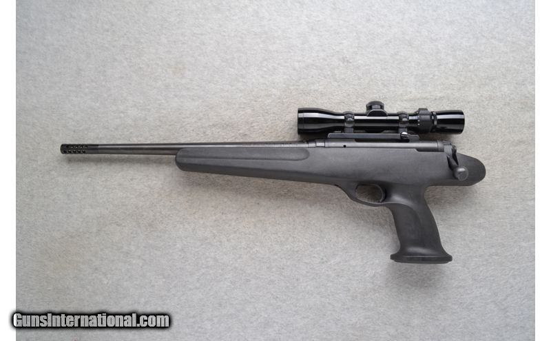 Description: This Savage Model 510 is a left hand short bolt action with right hand ejection pistol in .308 Win. Cal. It has a 14 inch barrel plus a muzzle break. It is outfitted with a Bushnell High Contrast 2-9 Scope. No iron sights. The stock is a smooth grip black .308 Winchester SOLD Chambers: Bolt Action 2 round internal box magazine. Metal Condition: Excellent. Wood Condition: Stock is excellent. Barrels: 14 inch blued barrel plus the muzzle break. Triggers: Grooved. Sights: Bushnell High Contrast 2-9 Scope. No iron sights. Drilled and tapped. Item Location: Springfield, OR |