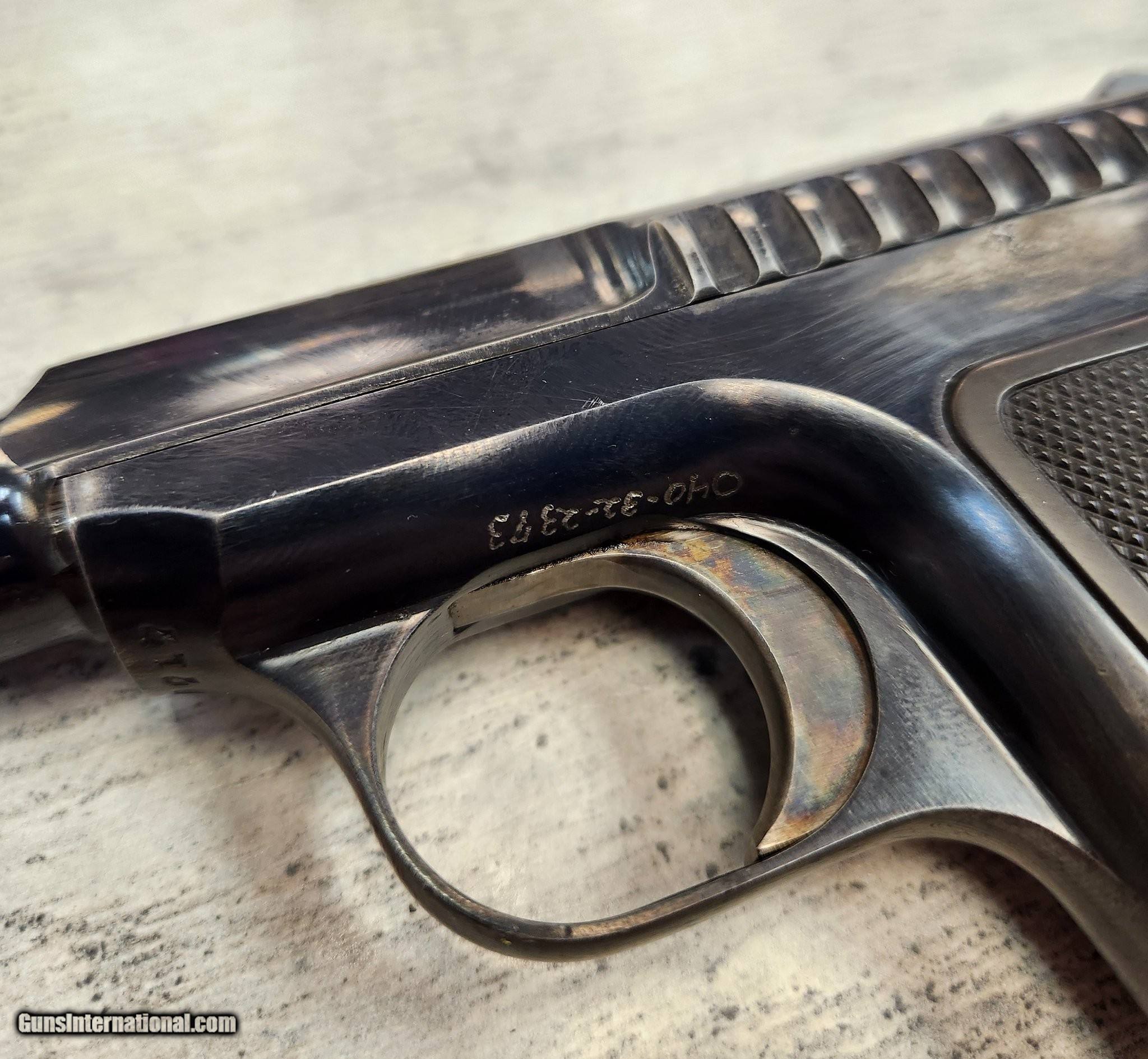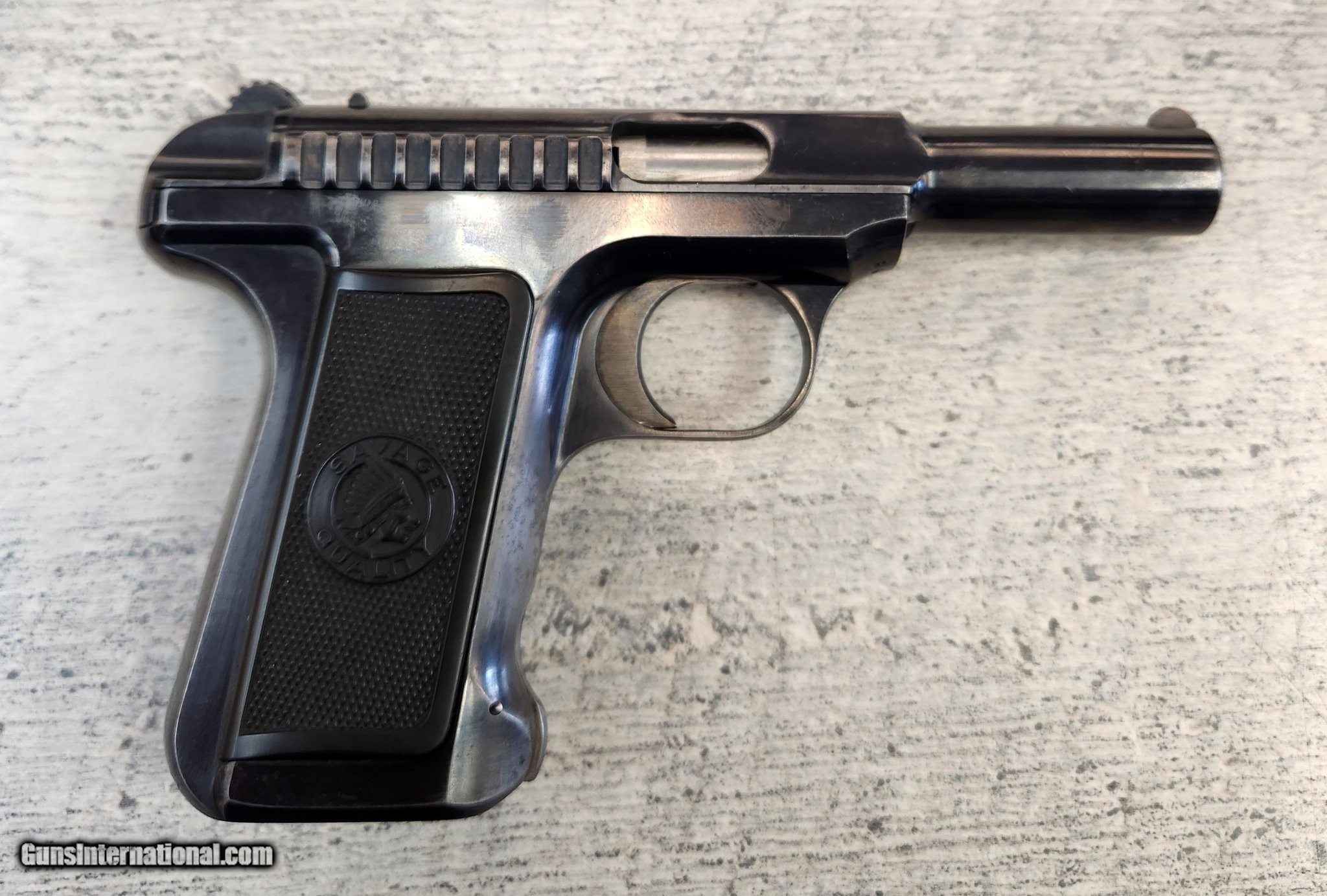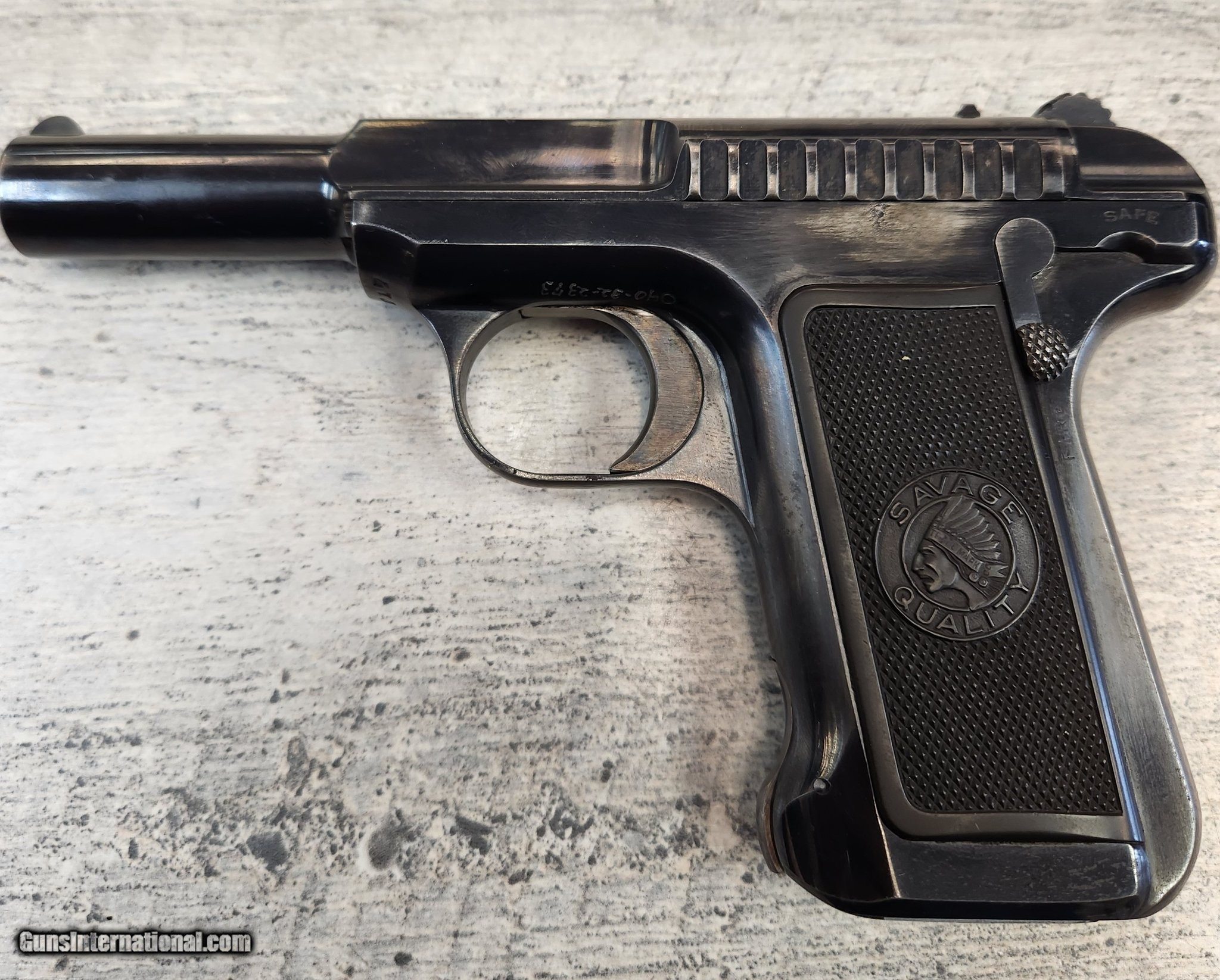 Description: Guns Listing ID: 553662 Condition as pictured. Includes one total magazine. Pitting evident on left side of frame, bluing wear around grip. Previous owners SSN engraved on frame above trigger guard. SOLD Curio/Relic: Yes Manufacturer: SAVAGE ARMS Model: 1907 Caliber Info: .32 ACP Condition: Used - Non-Certified Barrels: 3.75 BARREL Action: SEMI AUTOMATIC Finish: blued |