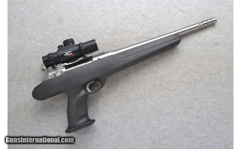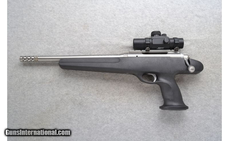 Description: This Savage Arms Model 516 is a bolt action 7mm-08 Rem. pistol. It has a checkered bolt handle on the left side and the casings eject from the right side. A 14 inch stainless steel barrel with the off or on muzzle break. Outfitted with a Tasco ProPoint Plus red dot 11 power sight. No iron sights. In overall excellent condition it comes as is. No box. SOLD Caliber Info: 7mm-08 Rem. Chambers: Internal magazine. Metal Condition: Excellent. A couple of very minor handling marks. Bore Condition: Excellent. Barrels: 14 inches with the muzzle break. Muzzle break can be open or closed. Triggers: Grooved. Stock: Smooth grip black polymer pistol grip. Fore End: Smooth grip black polymer with finger grooves. Weight: 6 lbs. 2 oz. with sight attached. Sights: Tasco ProPoint Plus red dot 11 power sight. No iron sights. Item Location: Richfield, WI |