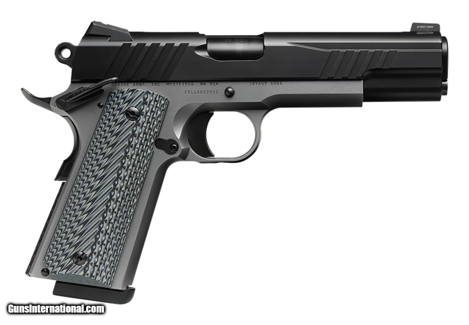 Description: Savage Arms 67201 1911 Government 45 ACP 8+1 5" Black Nitride Stainless Steel Target Crown Barrel, Black Nitride Stainless Steel Serrated Slide, Matte Stainless Steel Frame w/Beavertail, Black/Dark Gray VZ G10 Grips, Ambidextrous ON ITS BEST PRICE! BUY NOW!! After more than century of evolution, the 1911 is still standing strong. The Savage 1911 is built for hard use. Premium materials and features that shooters demand like the dual recoil spring, fully machined sear and disconnector, stainless steel hammer, target crown, nitride coated titanium firing pin, ambidextrous slide lock safety, ejection port is lowered, flared and cut for live round ejection. Includes two magazines.