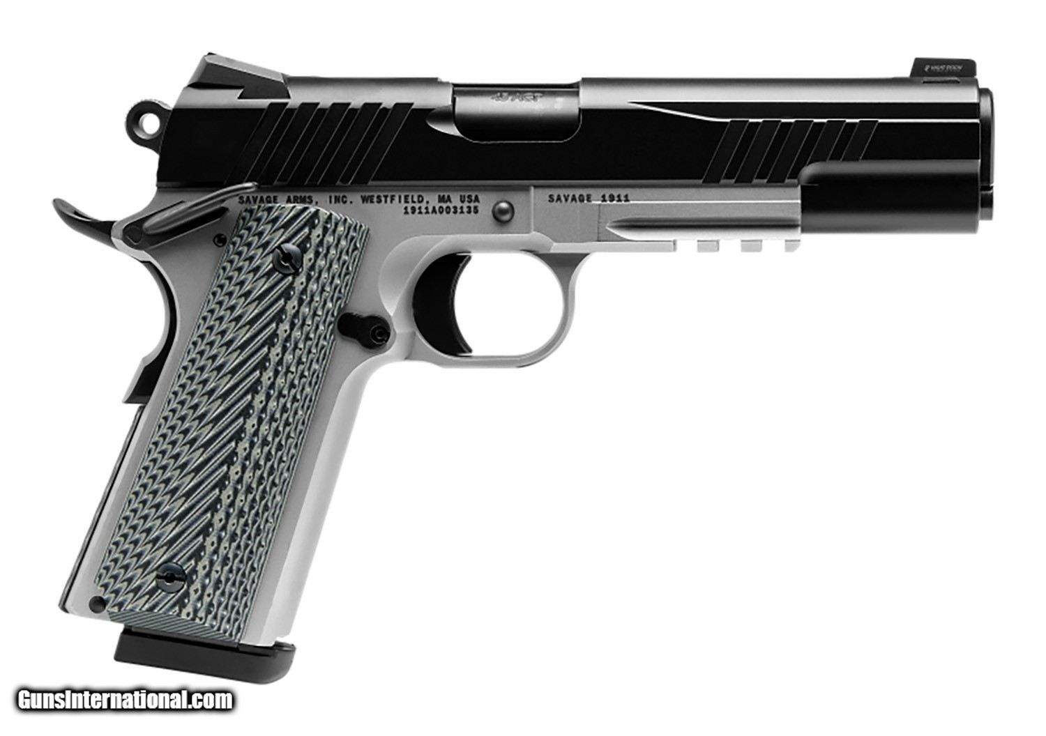 Description: Savage Arms 67207 1911 Government 45 ACP 8+1 5" Black Nitride Stainless Steel Target Crown Barrel, Black Nitride Stainless Steel Serrated Slide, Matte Stainless Steel Frame w/Beavertail & Picatinny Rail, Black/Dark Gray VZ G10 Grips, Ambidextrous ON ITS BEST PRICE! BUY NOW!! After more than century of evolution, the 1911 is still standing strong. The Savage 1911 is built for hard use. Premium materials and features that shooters demand like the dual recoil spring, fully machined sear and disconnector, stainless steel hammer, target crown, nitride coated titanium firing pin, ambidextrous slide lock safety, ejection port is lowered, flared and cut for live round ejection. Includes two magazines.