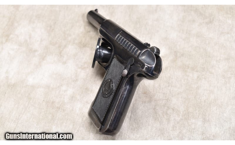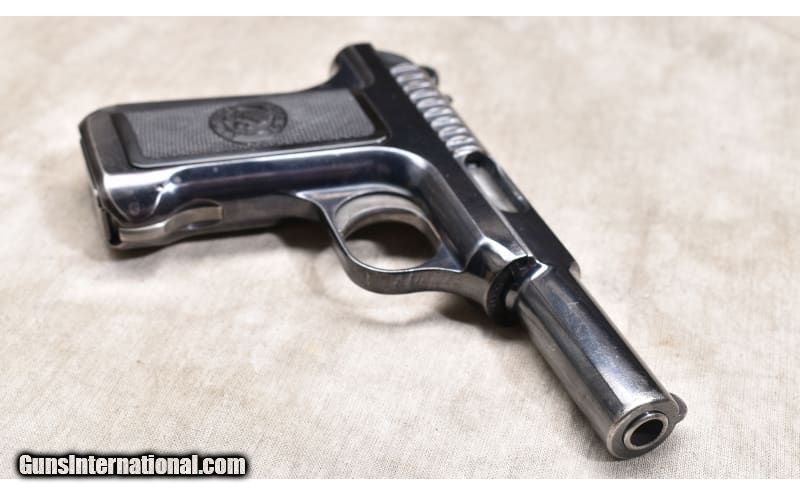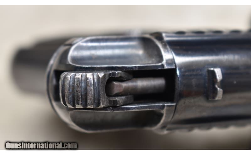 Description: A nice 1907 showing some blue wear along the edges and shallow rust on the handle. The main feature of these pistols is the external cocking lever that appears to be a hammer. This one has very nice grips with a sharp Savage logo, and nice case colored trigger. Sometimes the best description is "nice little gun." .32 Auto SOLD Curio/Relic: Yes Chambers: 10+1 capacity Metal Condition: Good. There are wear on the edges and some patches of shallow rust on the handle. Wood Condition: Very good. Bore Condition: Shiny and bright with good rifling. Barrels: 3-1/2 inch Triggers: Factory single action trigger. Butt Pad: Textured black plastic scales. Weight: 19 oz Sights: Fixed post and notch. Item Location: Rogers |