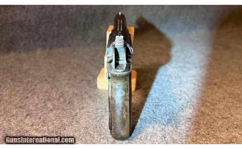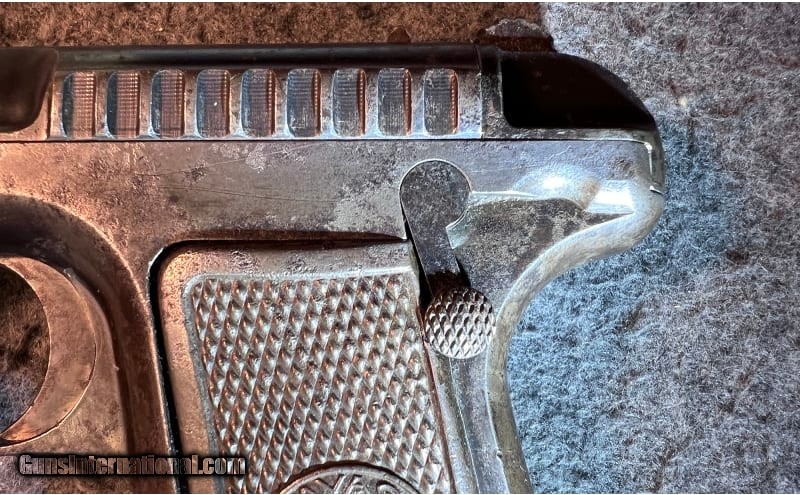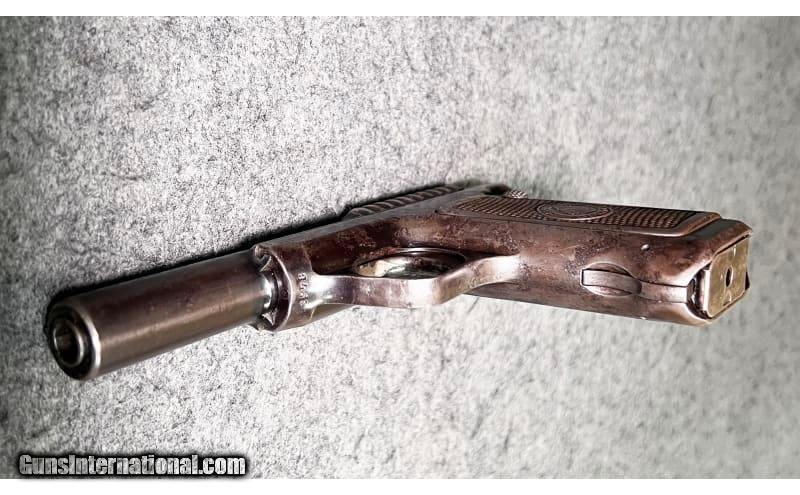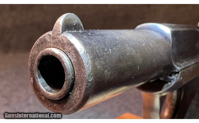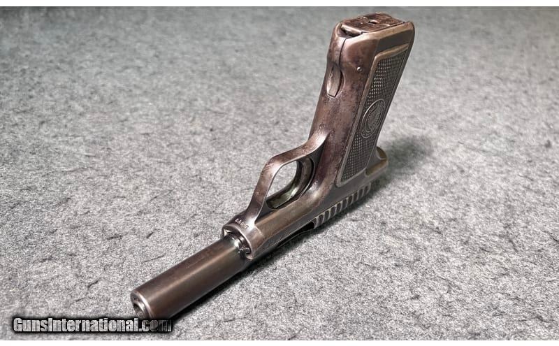 Description: This 1909 manufactured semi-automatic pistol is a Savage Arms Co. Model 1907 chambered in .32 Caliber. It has fixed front and rear sight, serrated slide, and a 3¾" barrel. The safety selector lever is not marked with "SAFE" or with "FIRE" on the frame, indicating it is an early model. The top of the slide is marked, "MANUFACTURED BY SAVAGE ARMS CO. UTICA, N.Y. U.S.A. PAT. NOV. 21, 1905 CAL 32." It is serial-numbered "3978" on the frame which dates it to 1909 and has a circle R (®) stamped at the front of the frame. This early model has a great hand-worn patina, but does show significant bluing loss throughout with some signs of pitting and erosion, but with minimal signs of rust. The grip panels show considerable hand wear but are in relatively good condition. It comes with a single magazine. .32 Centerfire SOLD Curio/Relic: Yes Metal Condition: "Significant bluing loss throughout with some signs of pitting and erosion, minimal signs of rust however Barrels: 3 13/16" barrel Triggers: Smooth trigger Stock Dimensions: 6¾" overall length Butt Pad: Metal grip panels with "Savage Quality" Indian head logo Weight: 1 lb 5 oz Sights: Fixed font and rear sights Item Location: Wichita, KS |