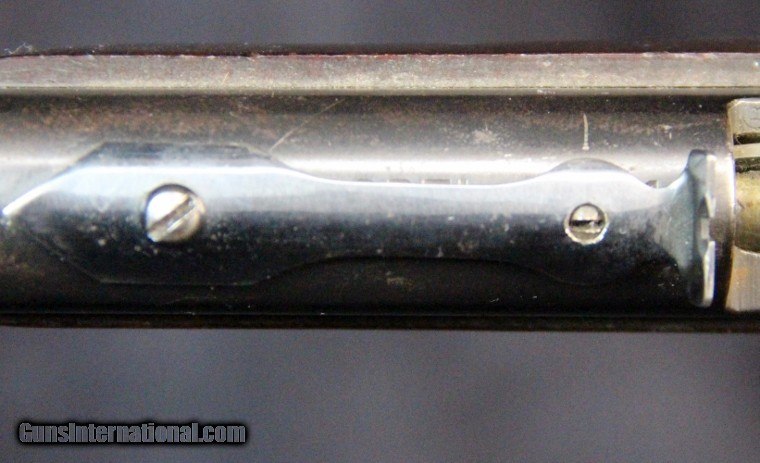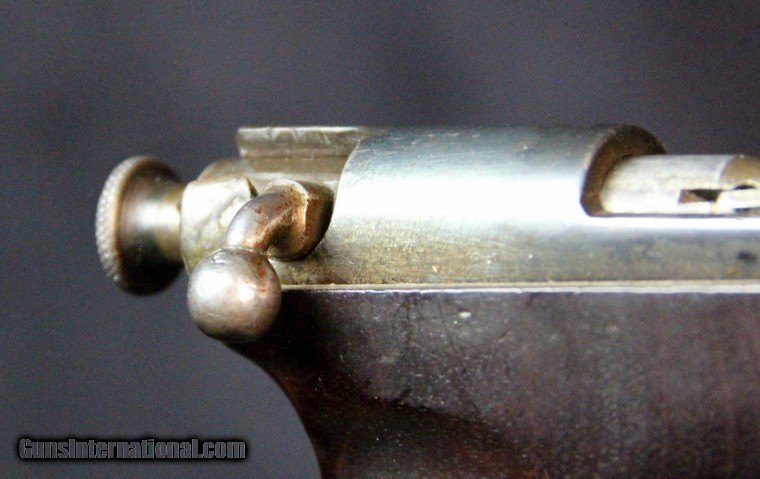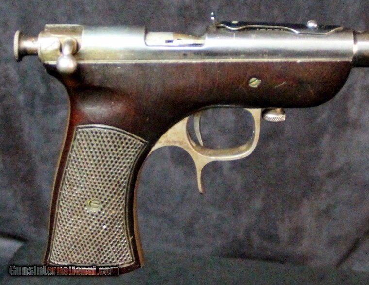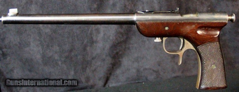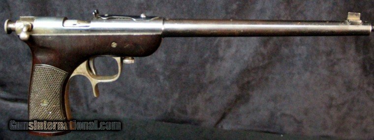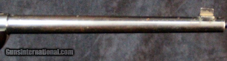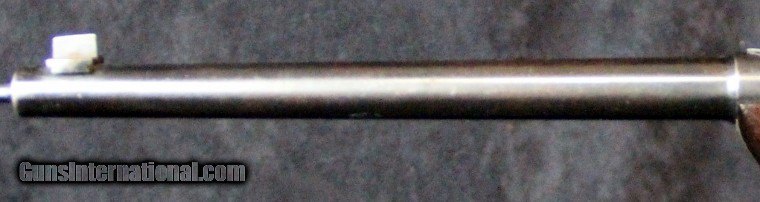 Description: .22rf, s/l/lr, #121022, 10 inch barrel, blue barrel, silver bolt/trigger & guard/grip straps, 2 piece walnut grips, 19-teens. Condition: very good bore, 95% barrel blue, silver parts dulling, excellent grips, excellent mechanically, excellent marks. SOLD |