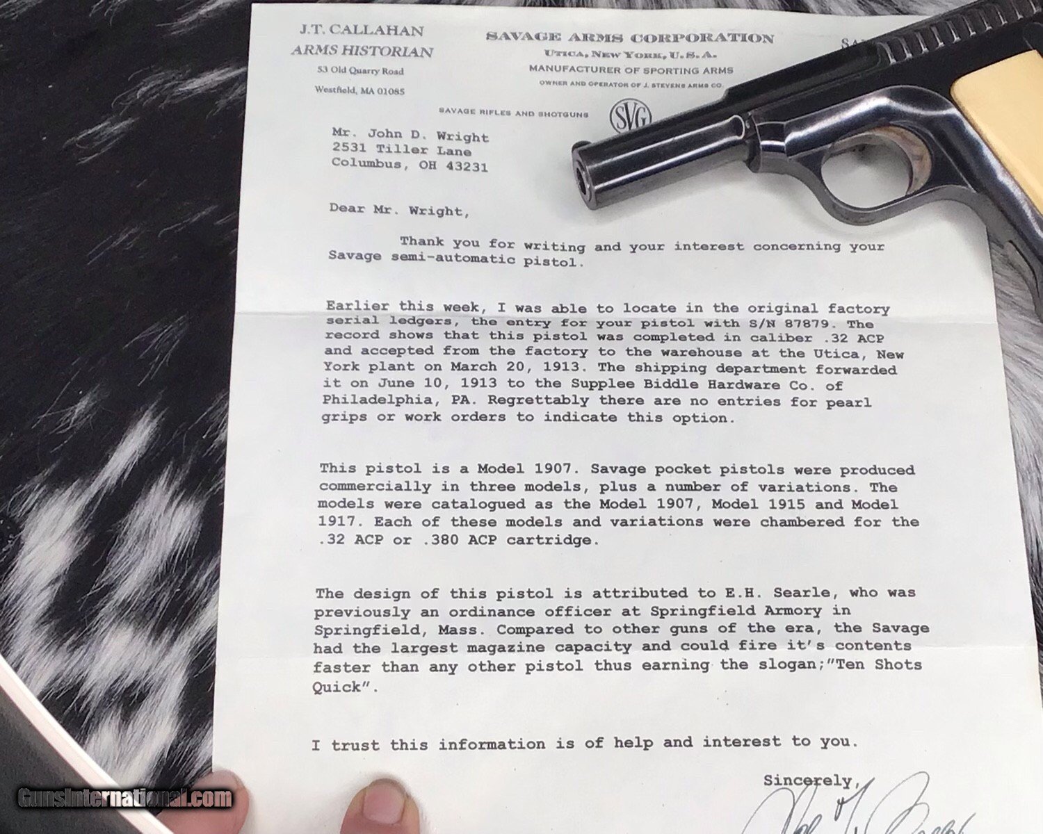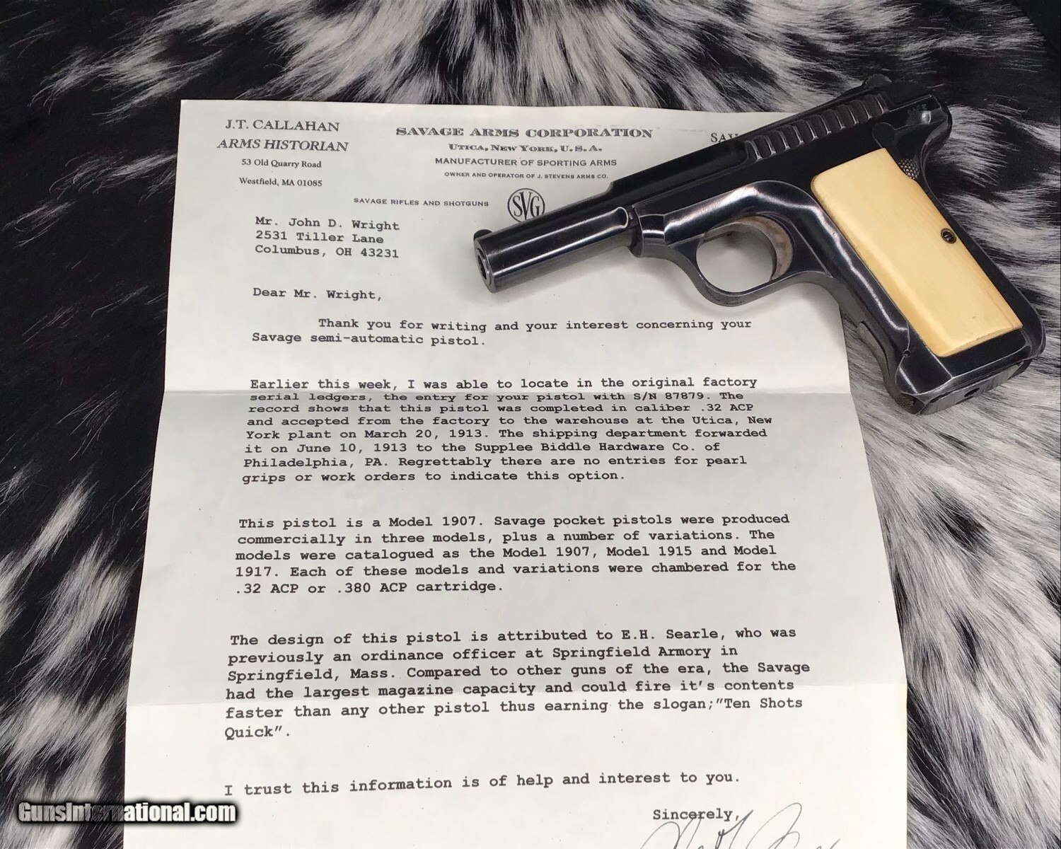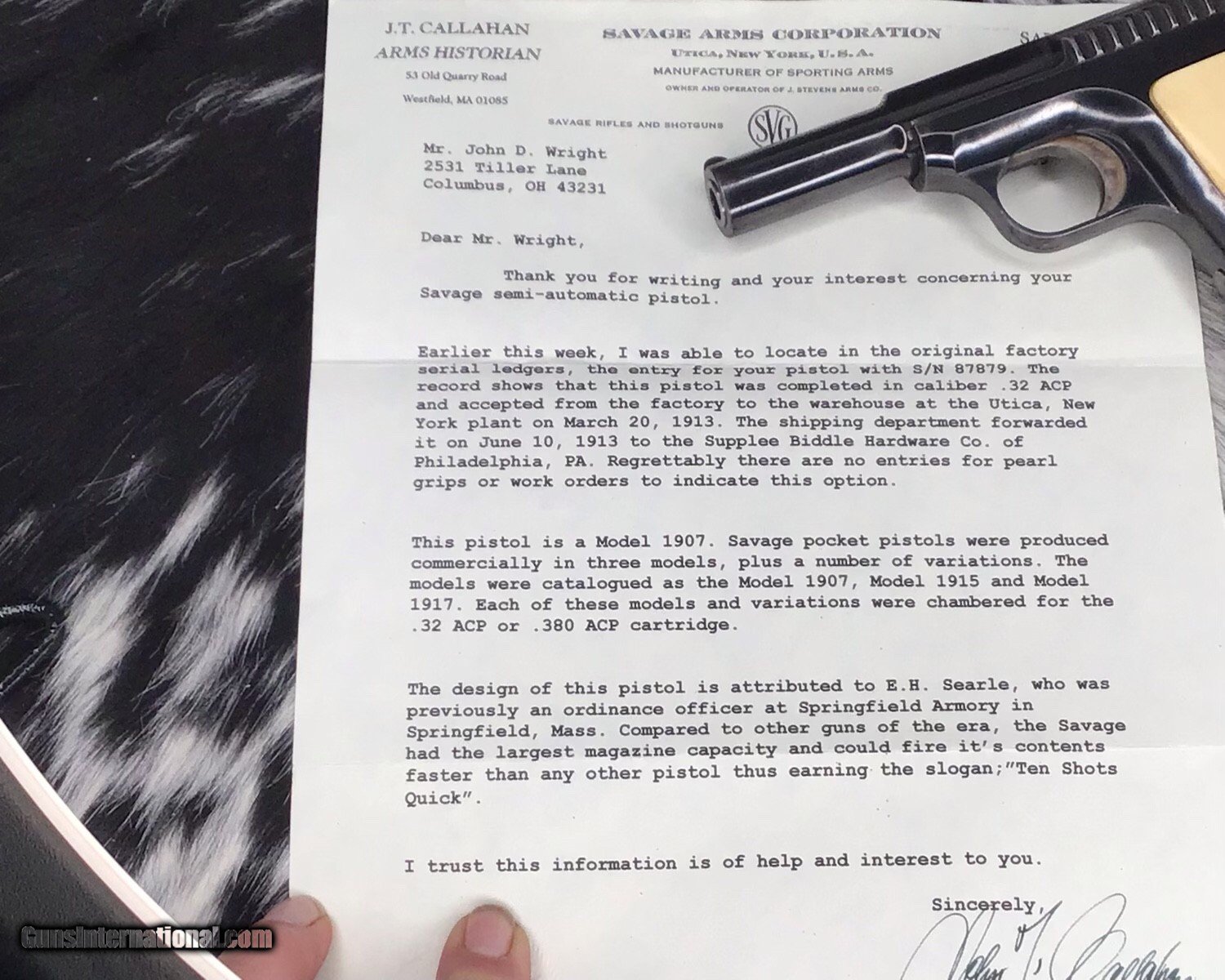 Savage Model 1907,.32 acp, Factory Letter W/Ivory Grips