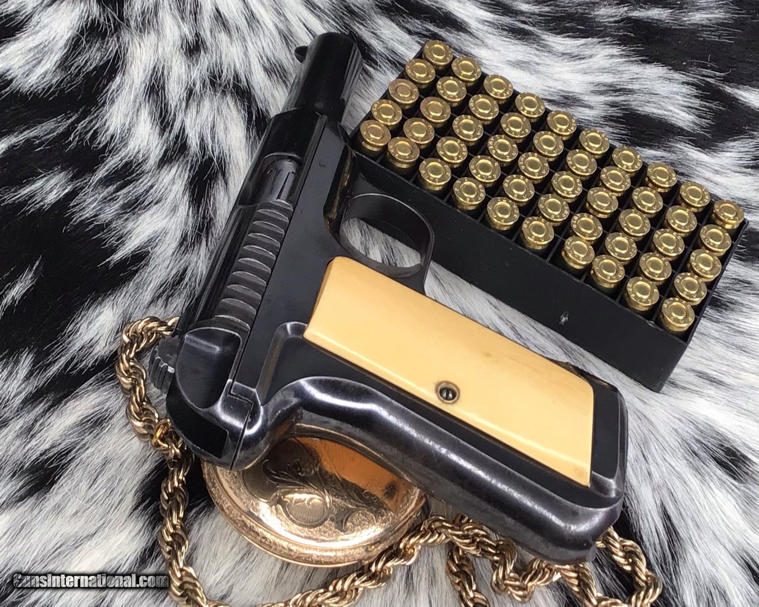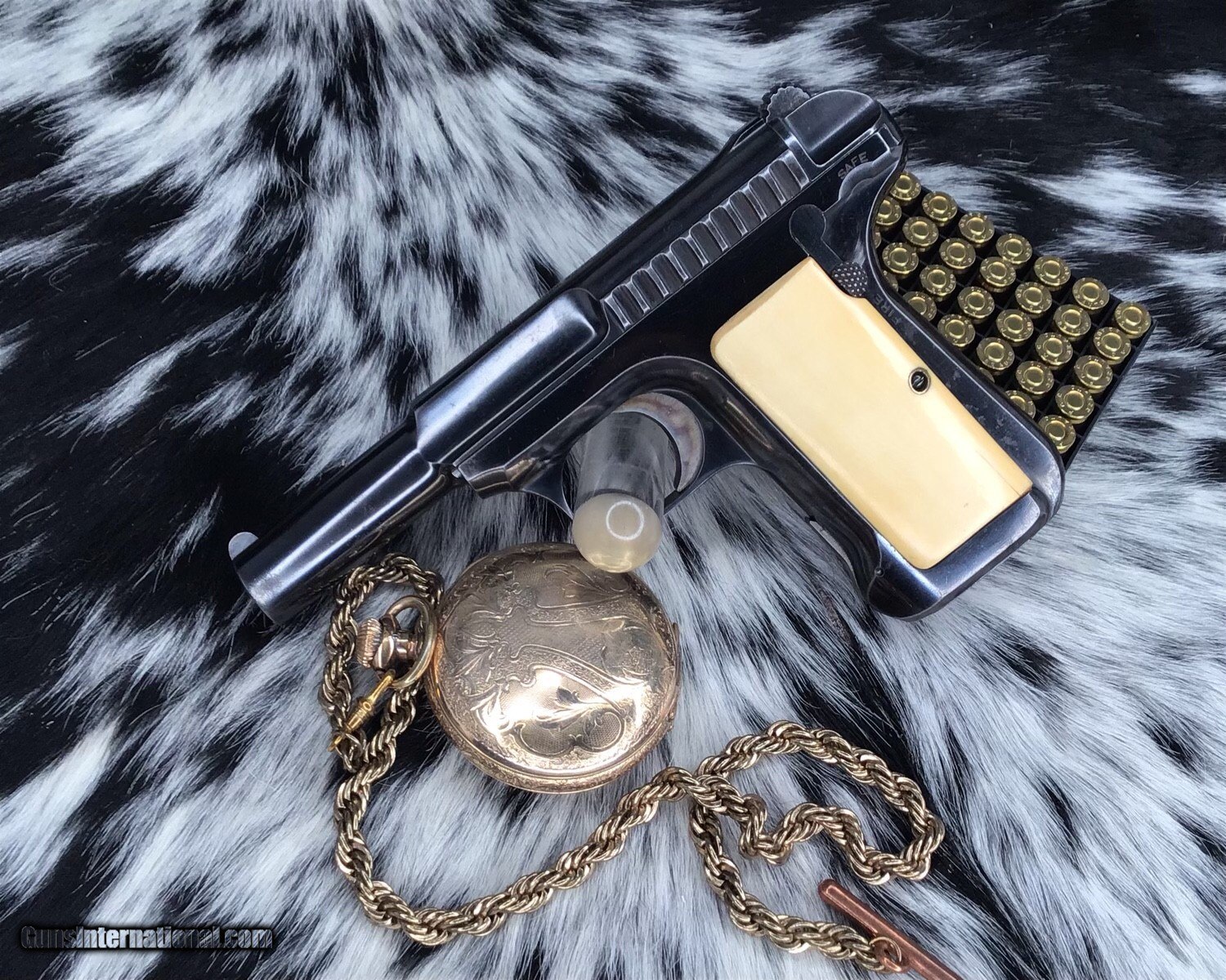 Description: This Beautiful Savage 1907 pistol was shipped June 10, 1913 to Supple Biddle Hardware Co. of Philadelphia PA. Wearing a 4 1/4 inch barrel, antique Pre ban Ivory panel grips and retains 90% or better of its factory blued finish. Case colors on trigger are also good. Factory letter from Savage comes with gun to document its history. Smooth action with Indian Chief logo grips. This pistol was way ahead of its time in design. Add 3% if paying with credit card. God Bless America from a proud American, and a Viet Nam Vet , thankful for our freedoms.. paid for by the Blood ,Sweat and Tears of our brave men and women in uniform. Ten Below Firearms is a Veteran owned and operated business. We specialize in out of production models of high quality firearms. We love to ship! If you are out of state or can't make it to our store, just give us a call! Handguns normally ship for $30 and Long guns for $40 to $65 for extra length long guns. That's 2-3 day USPS Priority shipping, Delivery conformation and with tracking number. Optional Postal insurance is additional $1.70 per $100 and highly recommended SOLD Curio/Relic: Yes Handgun Caliber: .32 ACP (7.65x17mm Browning SR) Manufacturer: Savage Model: 1907 Serial Number: 87879 Barrel Length: 4.25 in h Condition: 90 plus% Metal Condition: Very good Bore Condition: Very good Action: Semi auto Finish: Blued Sights: Fixed Manufacture Date: 1913 |