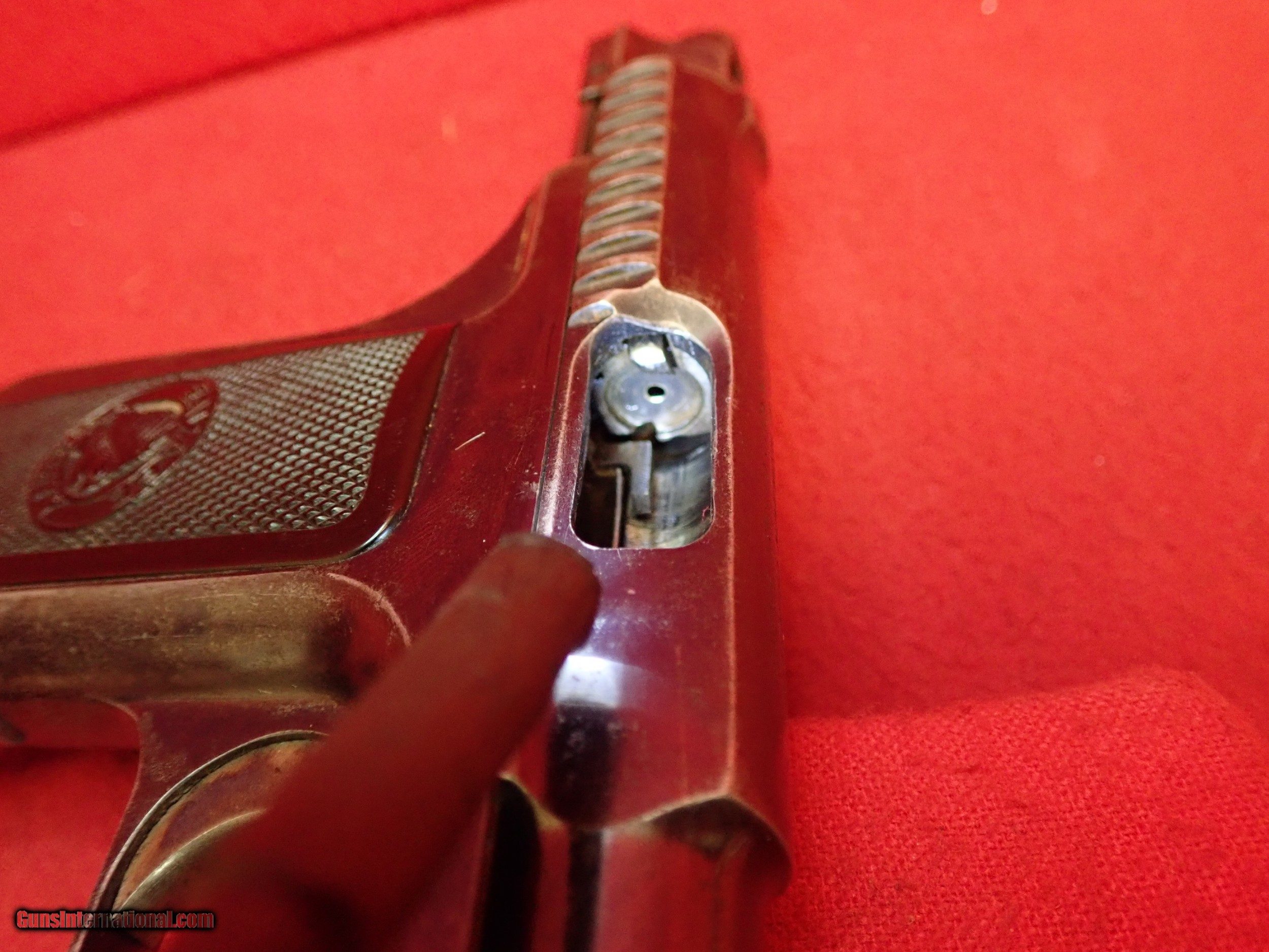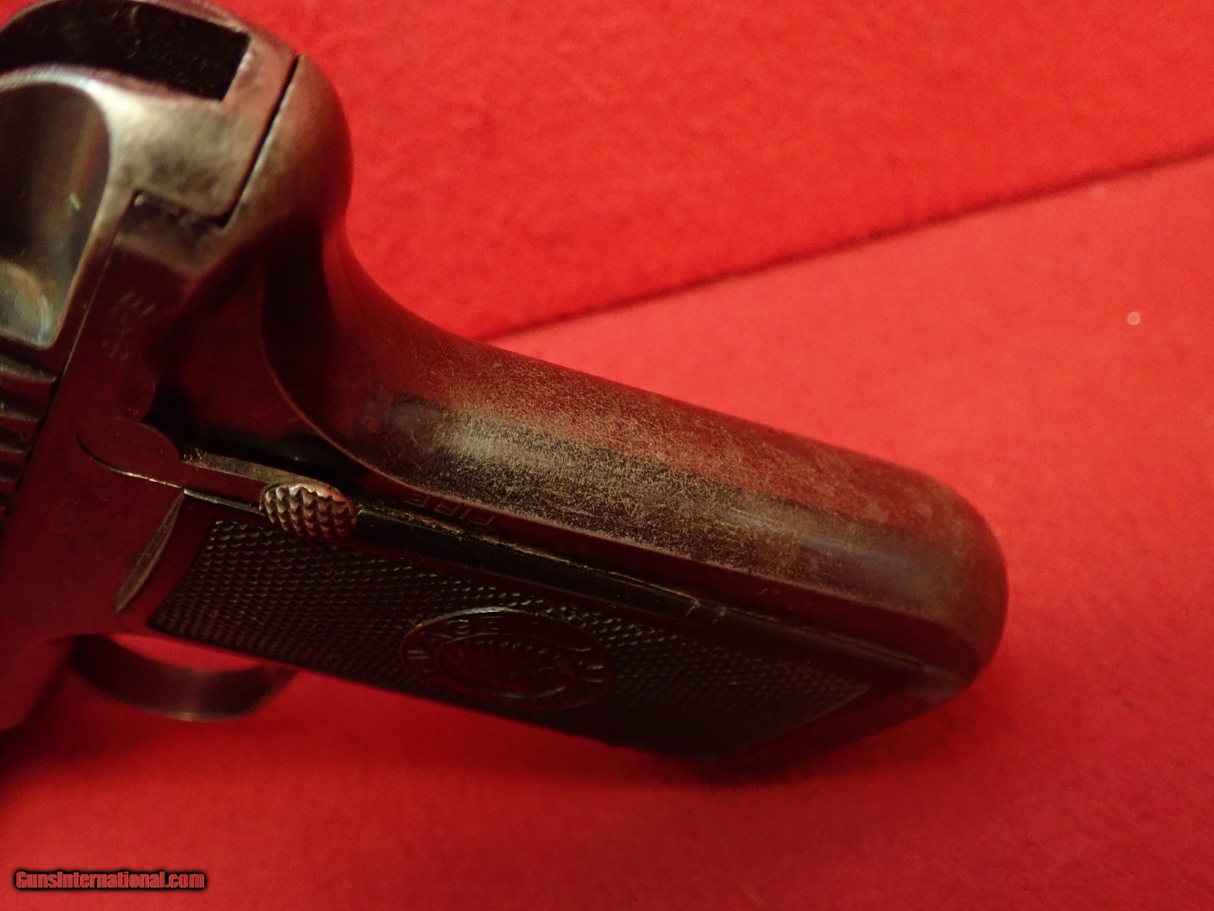 Description: Savage Model 1907 semi automatic pistol chambered in .32ACP, dated to 1915. This pistol features a blued finish with textured black plastic grips bearing the Savage logo, as well as a single action only firing mode and a safety lever that also acts as a slide lock. The pistol is in great working order with some signs of age and use such as finish loss and scratching, as seen in our photos. A very small chip can be seen in the left side grip panel. The pistol has a smooth action and the bore looks great with minimal wear. Includes an original 10rd magazine. A wonderful collectors piece in great condition, especially condsidering it's 104 years old! Please refer to the photos to further assess the condition of the pistol. C&R Eligible. No handgun sales in MA. SOLD Curio/Relic: Yes Manufacturer: Savage Model: 1907 Serial Number: 118405 Caliber Info: .32 ACP |
