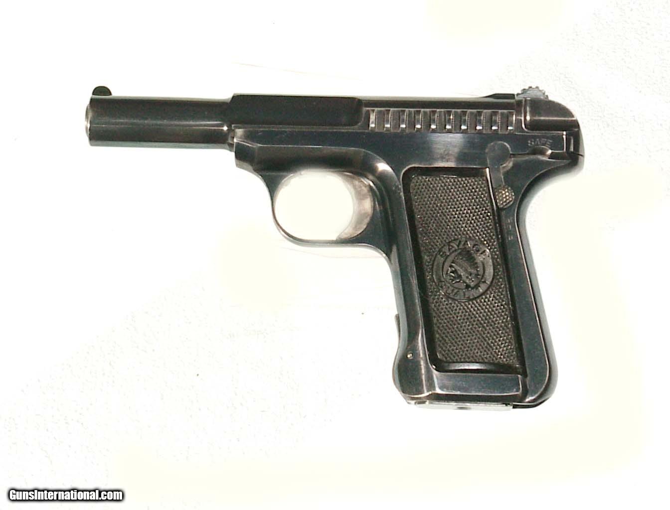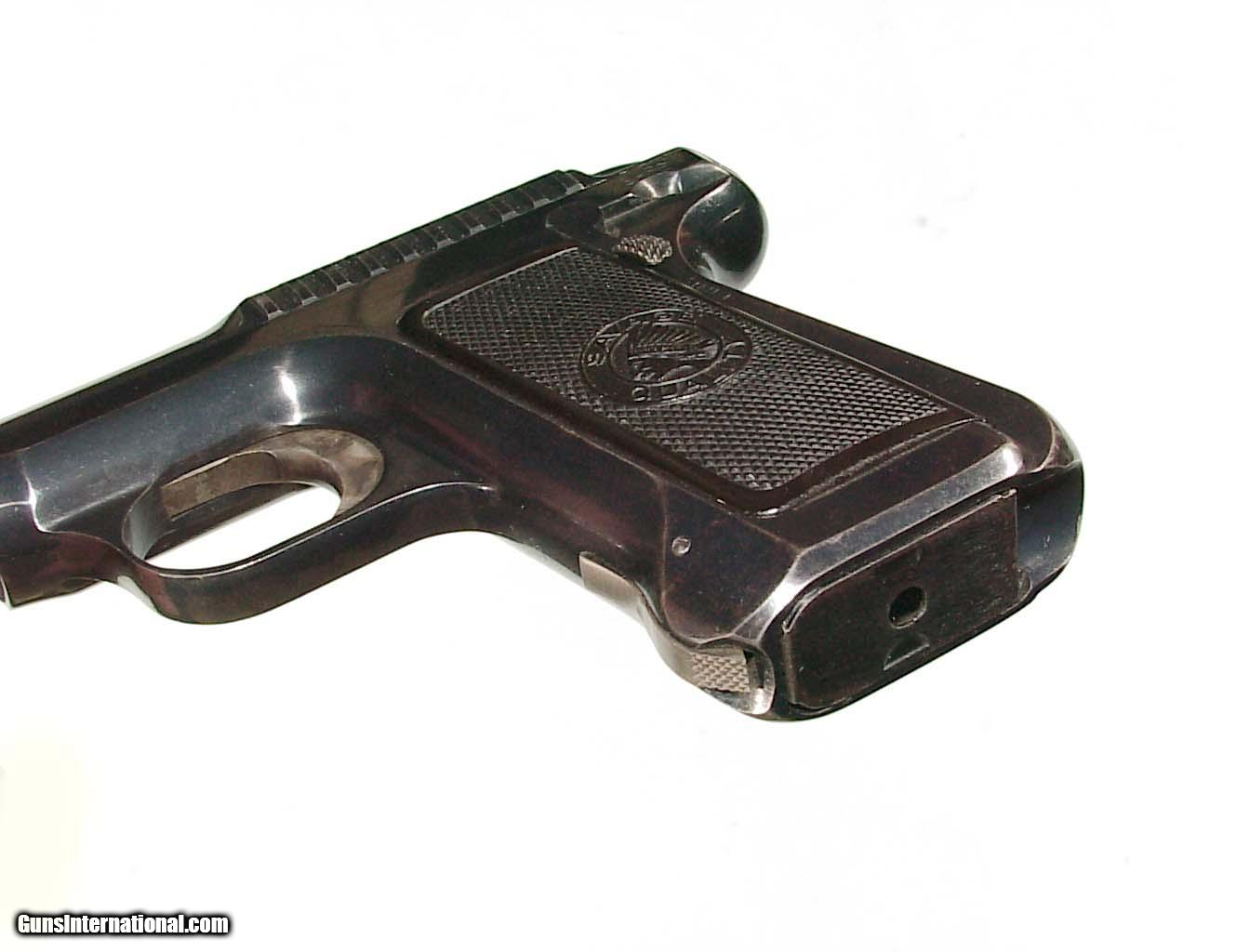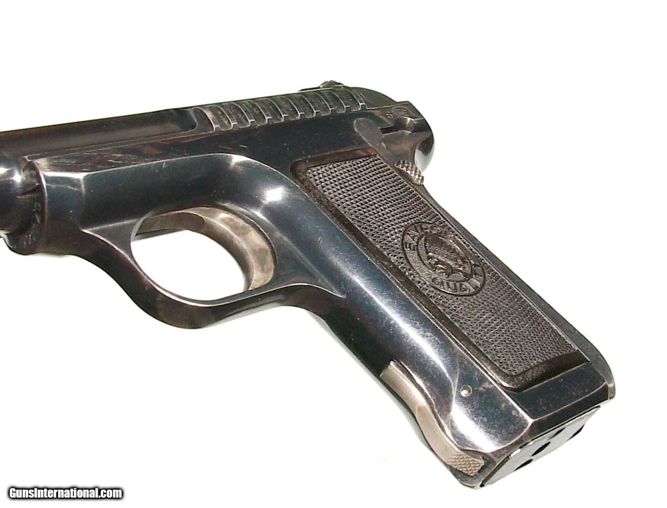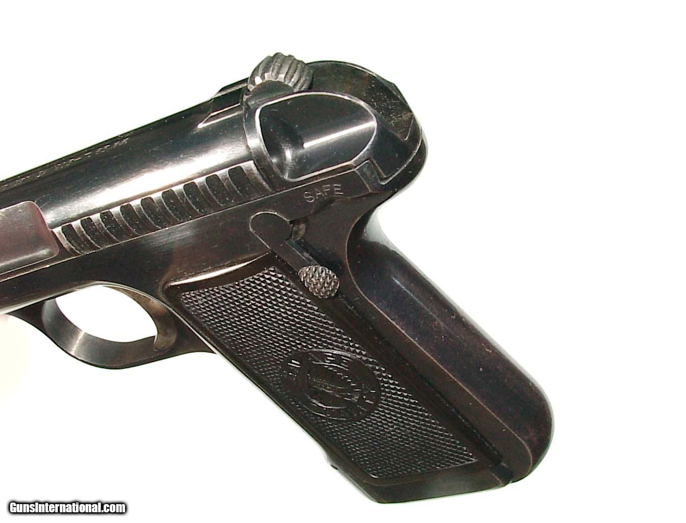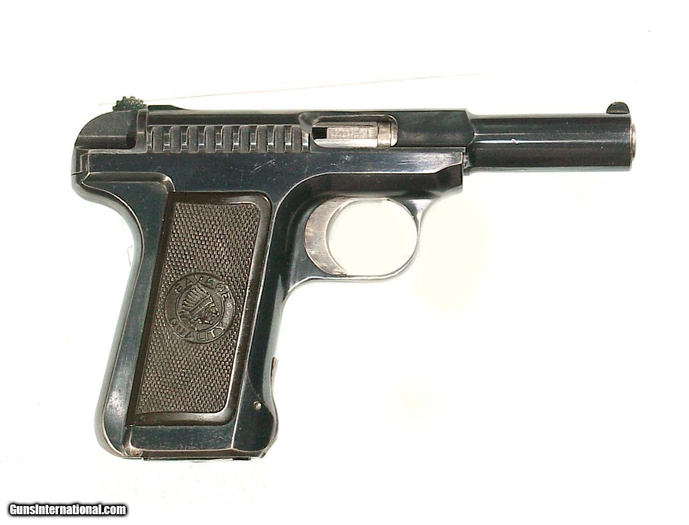 Description: .32 acp caliber, simi-automatic action with exposed hammer. Finished blue with checkered hard rubber factory grips. Retaining 98-99% original high polish blue, mint grips and bore. Appears little or unused. SOLD Curio/Relic: Yes |