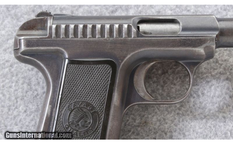 Description: This Savage Model 1907 .32 acp pistol is in fair to good condition. The finish is worn in the normal areas and there is some fine surface pitting. SOLD Curio/Relic: Yes Manufacturer: 1917 Caliber Info: .32 acp Metal Condition: Fair, with finish wear, fine surface pitting and scratches Bore Condition: Very good with signs of use Barrels: 3 3/4 inch barrel Stock: Gutta percha grips with Savage logo Weight: 20 oz. with empty 10 round magazine Sights: Fixed square notch rear sight with blade front Item Location: Lehi, UT |