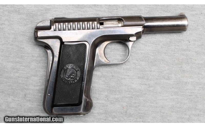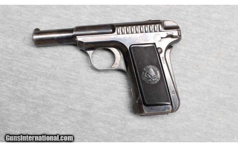 Description: Savage Model 1915 cambered in .32 ACP. This is an example of one of approximately 6,500 32 caliber (7.65 mm), Model 1915 pistols manufactured from 1915 to 1917. Fixed sights, "SAVAGE" marked on the left side of the frame, and two-line address/caliber/1905 patent date marking on top of the slide. Fitted with black checkered grips with the Savage Indian head trademark. The action is tight and smooth. There are no cracks or breaks in the original factory hard rubber grips. It comes with one factory 10 round magazine. .32 Auto SOLD Metal Condition: Very good Bore Condition: Bright Barrels: 3 3/4 inches Triggers: Factory Sights: Fixed sights Item Location: La Vista, NE |