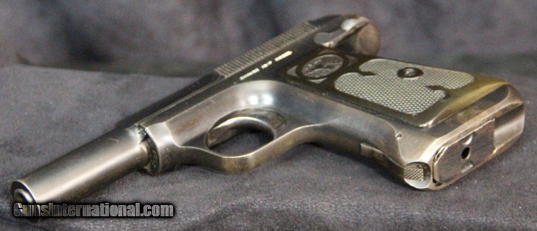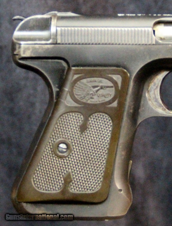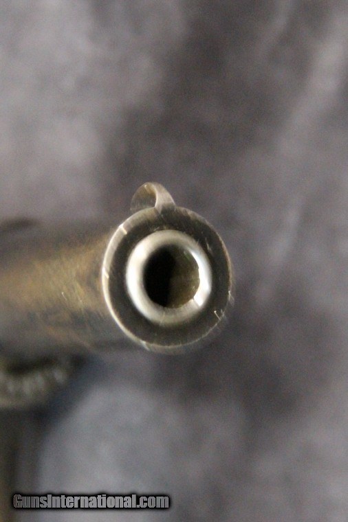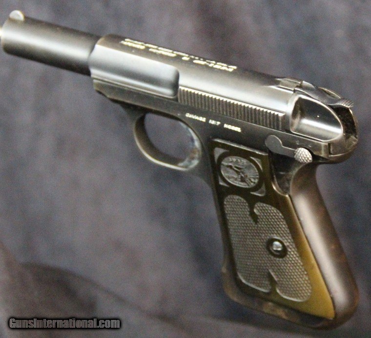 Description: .32acp, #258292, 3 3/4 inch barrel, blue finish, 2 piece hard rubber grips, original sights, manufactured 1920-1928. Condition: excellent bright bore, 95% blue overall, excellent grips, excellent mechanically, excellent marks. SOLD Curio/Relic: Yes |