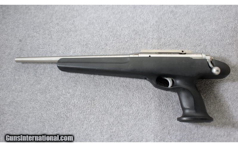 Description: The Savage Striker Series pistols were designed for metal silhouette shooting and handgun hunting. They were in production from 1998 to 2005. .223 Remington SOLD Metal Condition: Very good with some scratches Bore Condition: Excellent Barrels: 14 inch stainless barrel Weight: 5 lbs. 10 oz. Sights: Drilled and tapped for scope mounting Item Location: Lehi, UT |