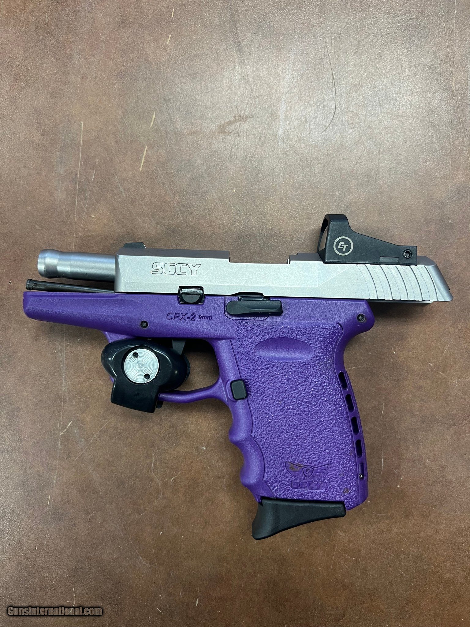 Description: Guns Listing ID: 474727 Used with one magazine No case Contrast front and rear sights Stainless steel slide CT sight Slight rust photos included SOLD Manufacturer: SCCY Model: CPX-2 CT OPTIC Condition: Used - Non-Certified Barrels: 3.1 Gauge Info: 9MM LUGER (9x19 PARA) Finish: PURPLE |