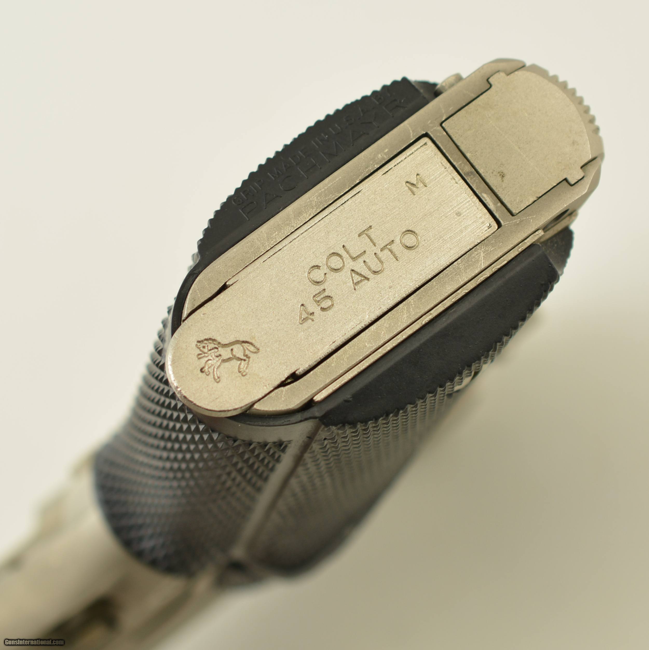 Description: Serial #70SC22942, .45 ACP, 4 1/4" barrel with an excellent, bright bore. This is one of a few Colt Government Model pistols elegantly converted to SA / DA by the late L.W. Seecamp in early 1970s. The pistol has a mostly conventional appearance, with an excellent satin nickel finish, and distinctive Seecamp trigger assembly, and “LWS" marked, reshaped and knurled trigger guard. The double action bar is covered by an added, contoured metal plate on the right side of the frame, finished to match the rest of the pistol. Pachmayr wrap-around neoprene grips, and a single, original Colt magazine complete the pistol. These ingenious conversions were the brainchild of Louis W. Seecamp, better known for his Seecamp .32 auto pistol, and turns the Colt Government Model into an effective DA pistol, able to be carried with a round in the chamber and off safe, by adding a new trigger that both actuates a cocking lever along the right side, and impinges on the original SA trigger which has been reduced in size, but is still present and functional. There were very few of these interesting and well-made pistols ever built, although they seem to have found favor with federal law enforcement agents, and conversions on Commander size pistols are even rarer. This example is in excellent condition, and would make a great addition to any collection. FFL SOLD Manufacturer: Colt Model: Combat Commander Serial Number: 70SC22942 Caliber Info: .45 ACP Gauge Info: .45 ACP |