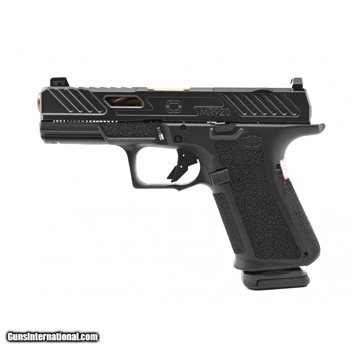 G19 sized pistol with slide porting and burnt bronze spiral fluted barrel. Slide is cut for RMR style optics. Comes with suppressor height sights and two Magpul 15 round magazines. new. UPC:810013431612