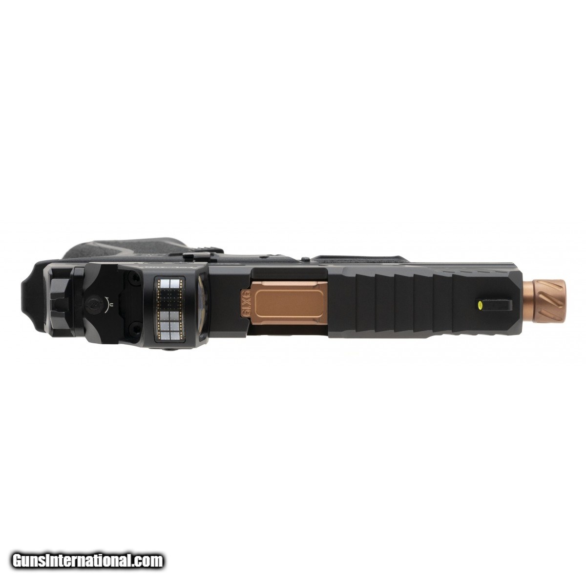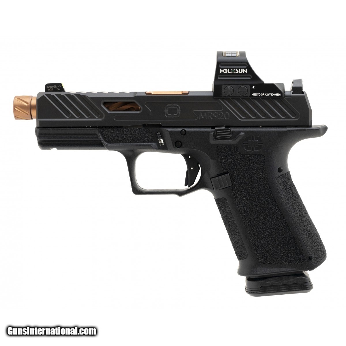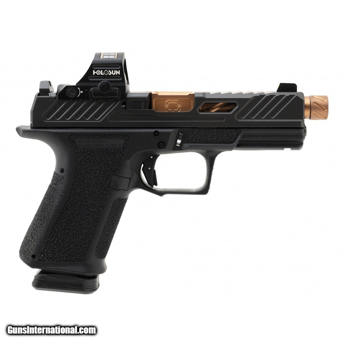 Description: " SN:SSC027259. Optics ready compact 4.5"" threaded, fluted, bronze carry pistol with a Holosun 507C-GR cowitnessing AmeriGlo sights. In excellent condition. In box with range pouch & two spare mags. SOLD |