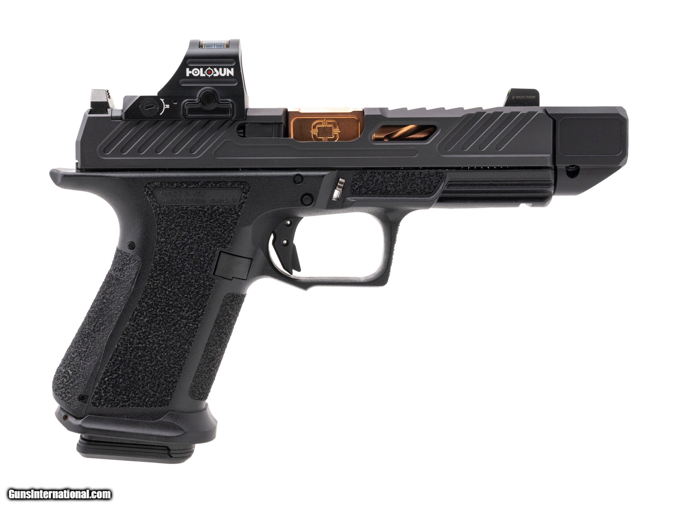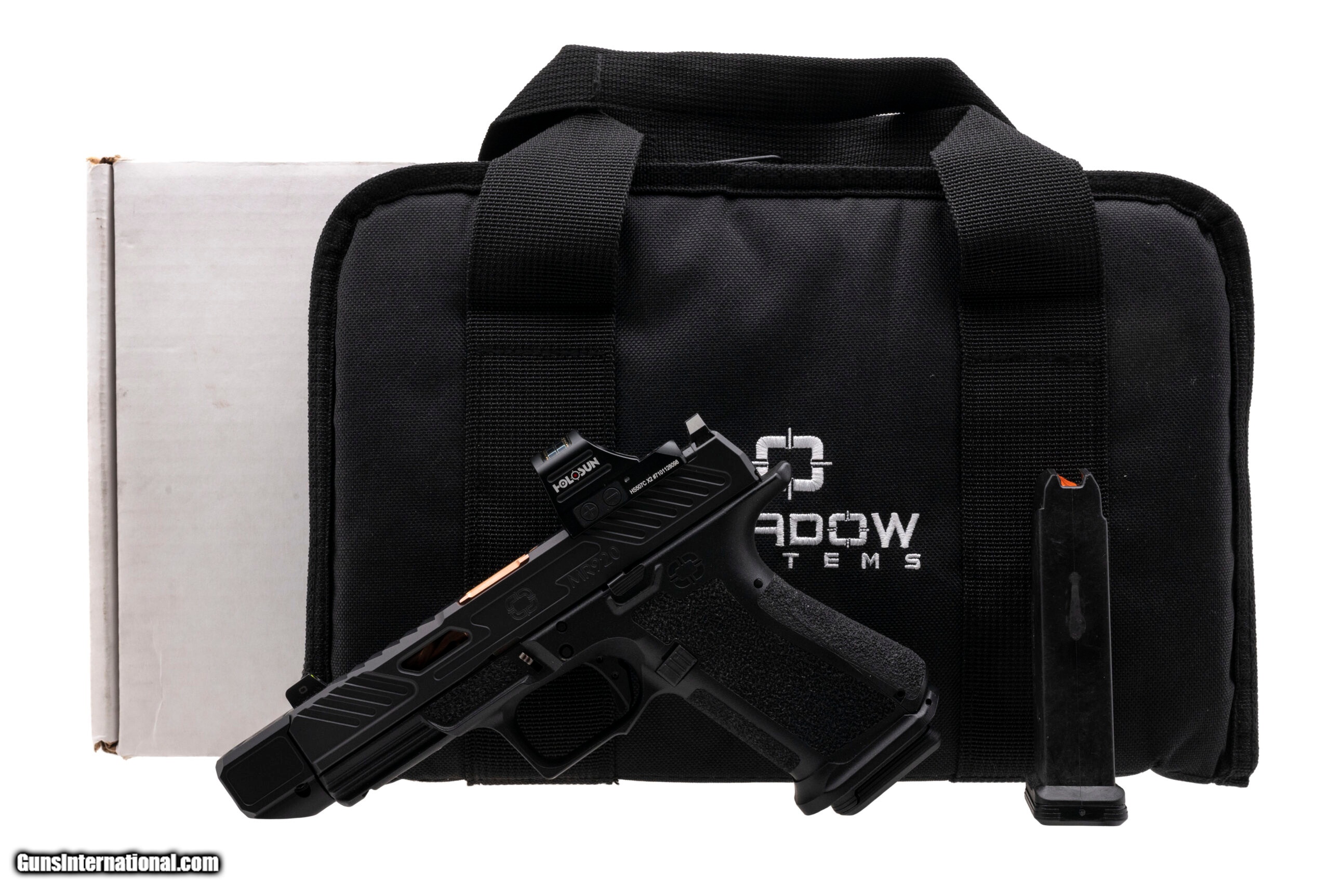 Description: "SN: SSC117879. Modern production, 9mm with a 4.5"" spiral fluted threaded barrel w/ compensator. Bore is bright with excellent rifling. Full size striker fired pistol with a ported slide, flared magwell, and Holosun 507C red dot optic co-witnessed w/ blacked out rear & front night sights. Nitride finish and polymer frame is excellent. Comes with box, Shadow Systems range bag, and extra magazine. SOLD |