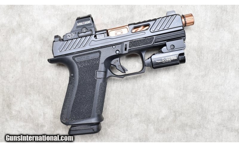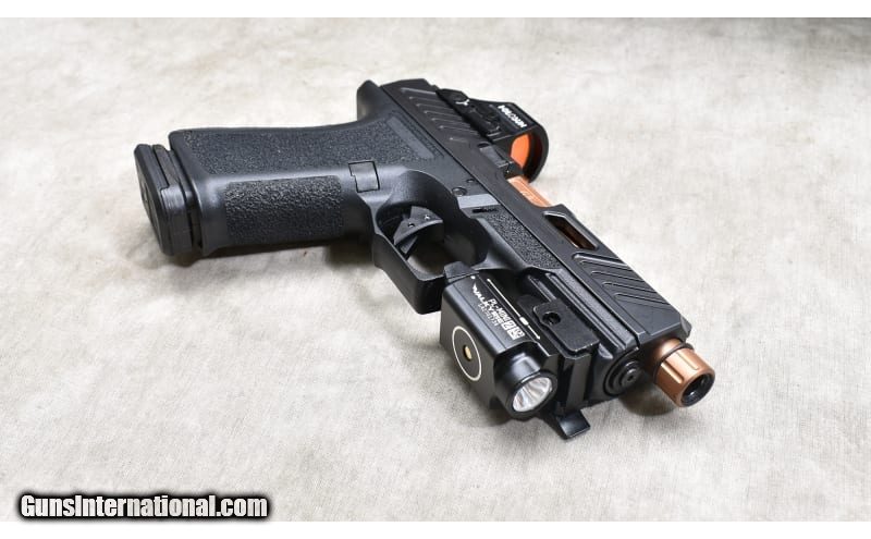 Description: Nice package including the tactical light, the holographic sight, night sights, and three magazines. The pistol also has a fluted bronze coat barrel with threaded muzzle. 9mm Luger SOLD Chambers: 15 + 1 capacity Metal Condition: Excellent Wood Condition: Excellent. Bore Condition: Shiny and bright with good rifling. Barrels: 3-3/8 inch inclusive of barrel cap. Triggers: Factory single action trigger with integral safety. Butt Pad: Textured black plastic. Weight: 25 oz Sights: Night vision post and notch open sights. Optics cutout and outfitted with Holosun sight. Item Location: Rogers |