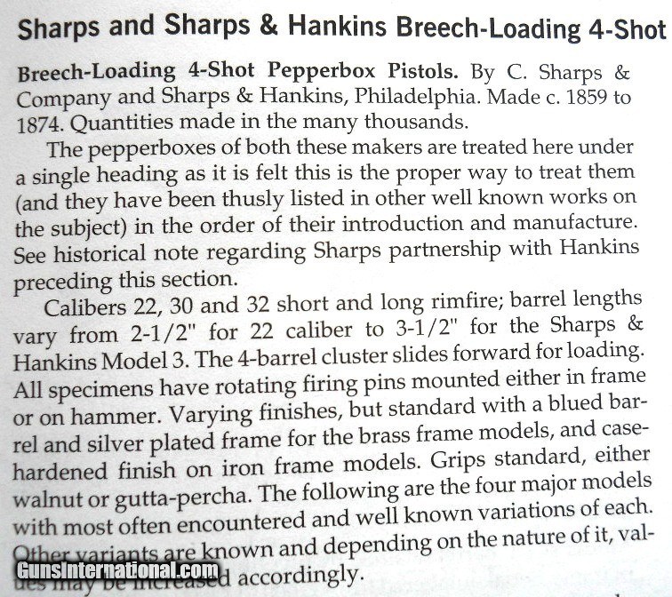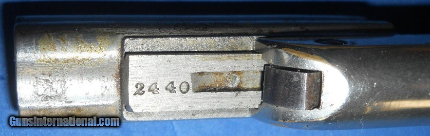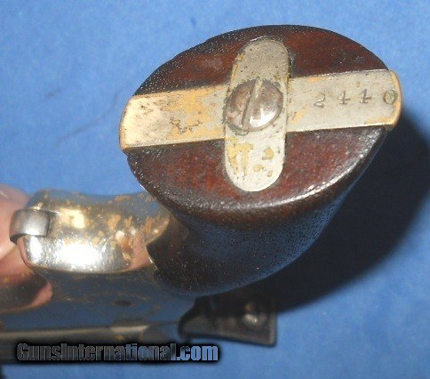 Description: SCARCE ORIGINAL ALL NICKLE FINISH SHARPS MODEL 1B .22 CALIBER 4 SHOT PEPPERBOX ONLY ABOUT 3200 WERE MADE. ROTATING HAMMER NOSE FIRING PIN & ACTION IN FINE WORKING ORDER, AS FOUND & PICTURED. $10.00 S&H DIRECT TO BUYER ANYWHERE THAT'S OK. M45 SEE ALL "ESTATE ANTIQUES" LISTINGS. LOOK AROUND BRINGING YOU THE BEST FOR LESS FROM OLD TIME COLLECTIONS & ESTATES. SOLD Antique: Yes Handgun Caliber: .22 Short Manufacturer: SHARPS Model: 1 B Serial Number: 2440 MATCHING Barrel Length: 2 1/2 Bore: BRIGHT GOOD RIFLING Chambers: CLEAR Condition: VERY GOOD Metal Condition: ORIGINAL Wood Condition: VERY GOOD Bore Condition: GOOD Barrel Type: CLUSTER Action: CRISP & TIGHT Stock: WALNUT Finish: ORIGINAL Weight: 8.6 oz Sights: ORIGINAL Manufacture Date: 1859-1874 |