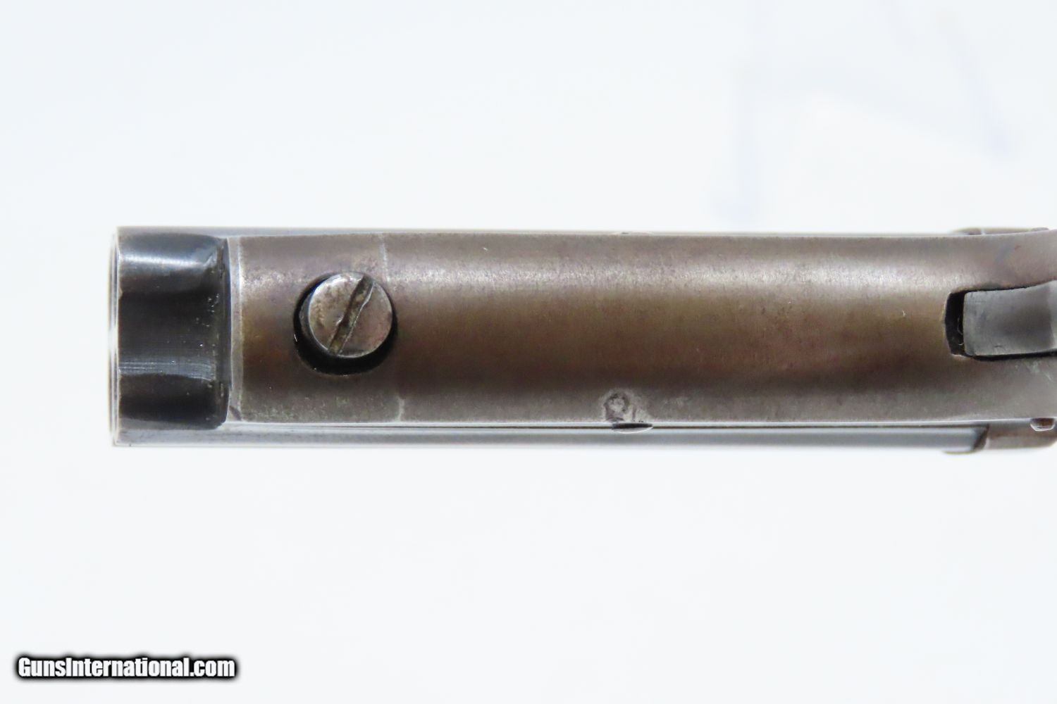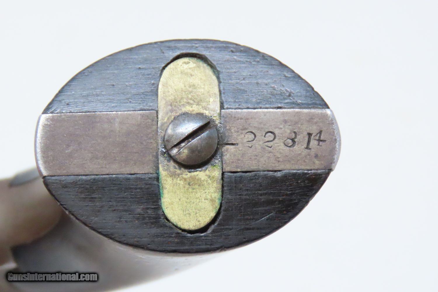 Description: CIVIL WAR Era Antique C SHARPS .22 Short Model 1 PEPPERBOX Revolving Pistol 1860s Pocket Revolver for Self-Defense Here we present an antique Sharps Model 1 Pepperbox Pistol, made circa 1865 with a production run of 1859 through 1874 in Philadelphia, Pennsylvania. Christian Sharps invented his famously large bore, breech-loading rifle in 1848, after practicing gun-making under John Hall at Harpers Ferry Armory. In 1859, he premiered another unique design in the 4-barreled pepperbox pistol with a unique revolving firing pin, made for 19th Century concealed carry. This repeating design was able to utilize the new rimfire ammunition like Smith & Wesson, without infringing on Smith & Wesson’s Rollin White Patent for bored through chambers on a revolver’s cylinder. This gave Sharps a leg up in the market since everyone else either had to produce single shot pistols, come up with an alternate ammunition and weapon design, or just stick with percussion until the patent expired. They made very nice, easy to use and compact firearms for 19th century conceal and carry. The overall condition is fine. Very nice blue finish on the barrel cluster with silver finish on the iron frame. The action is strong and crisp, and the firing pin indexes properly. All bores are semi-bright in good shape with clear rifling. Both grips are firm and in very good condition. All numbers match. This is a very nicely preserved example of the ingenious Sharps pepperbox! Own the original! This is a legitimate antique and not a reproduction. Barrels are 2-1/2 inches. Caliber: .22 Rimfire Short Overall condition as seen in photos. Very Fast. Very Safe. FREE SHIPPING WORLDWIDE. Delivered directly to your door by express mail! Guaranteed AUTHENTIC & Includes CERTIFICATE OF AUTHENTICITY. ancestryguns $1745 #201506 SOLD Antique: Yes |