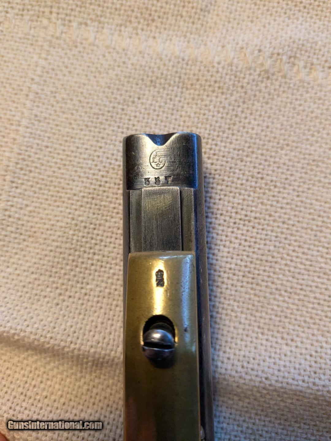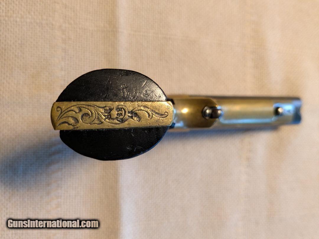 Description: L. Ghaye copy of Sharps 2A 30. CA pepperbox serial #357. Belgian proofed. Very sharp engravings and markings. Nice original grips with small chip in left heel. Even case colored barrels with underlying blue. Original safety on frame behind hammer. Mechanics good with proper firing pin rotation. Buyer pays $30 shipping. No shipping to NY or NJ. Antique: Yes Price: $1,300.00 Contact Seller |