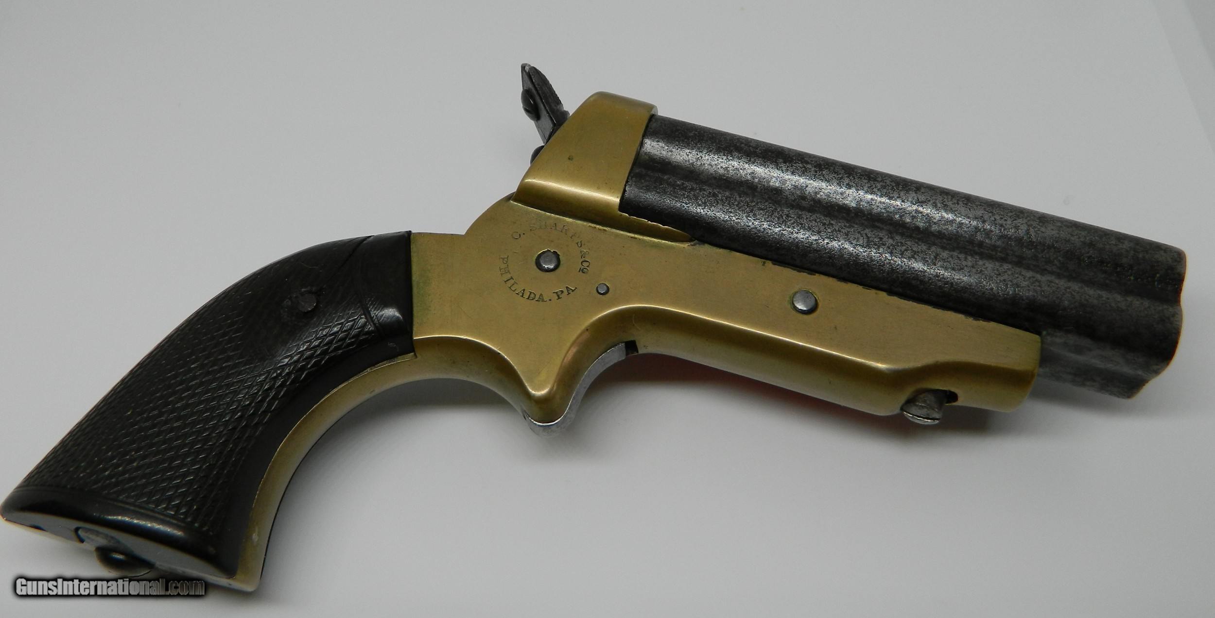 Description: REDUCED PRICE! Sharps Model 2 .30 caliber rimfire pepperbox s/n 10416in fully operating mechanical condition with good rotator as evidenced by the included pasteboard indented patch, The gun is in fair condition with some corrosion in bores and the screw holding grips has been buched up but is tight. ALTHOUGH I SAY THAT THE GUNS I SELL ARE FULLY FUNCTIONAL, I WOULD NEVER RECOMMEND TRYING TO SHOOT AN ANTIQUE GUN!! SOLD Manufacturer: Sharps Model: 2 Serial Number: 10416 Barrel Length: 3 Condition: fair Metal Condition: Good Bore Condition: Fair |