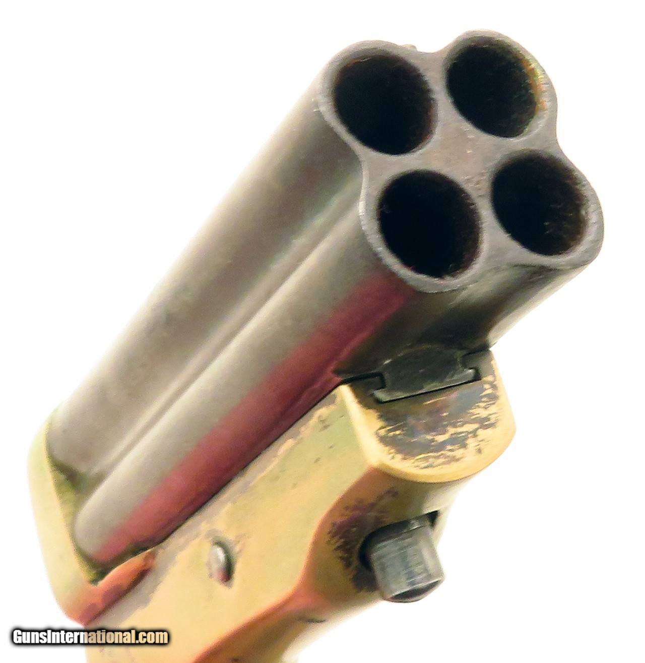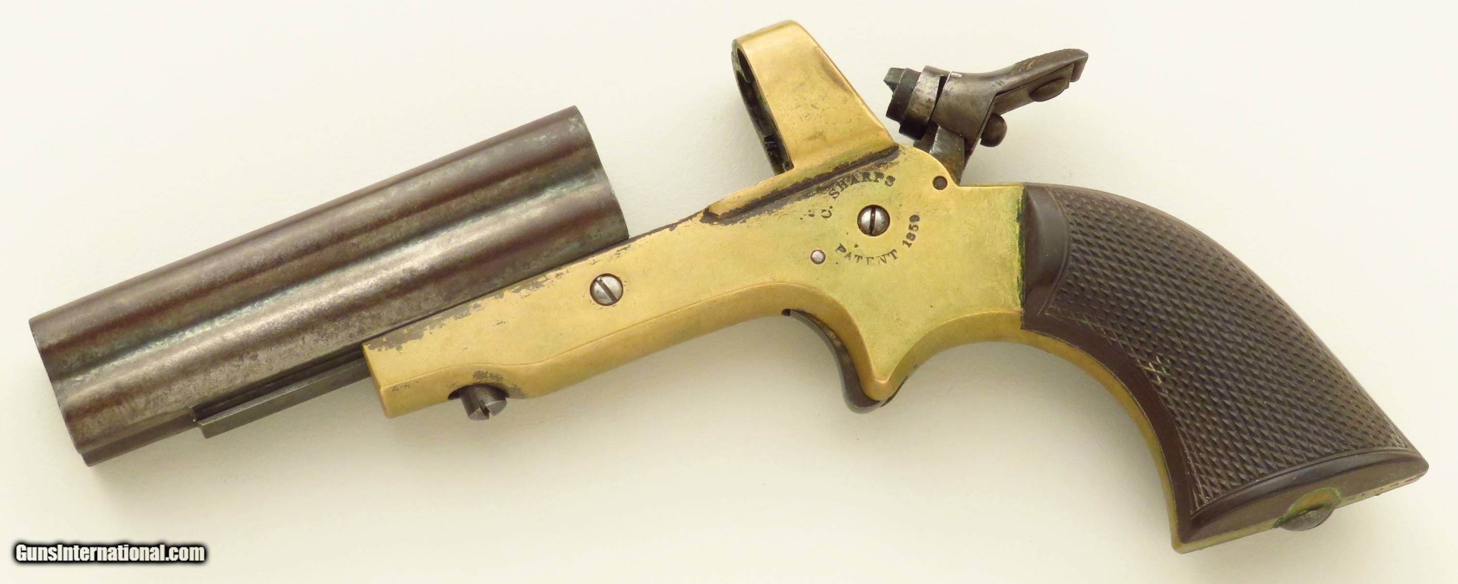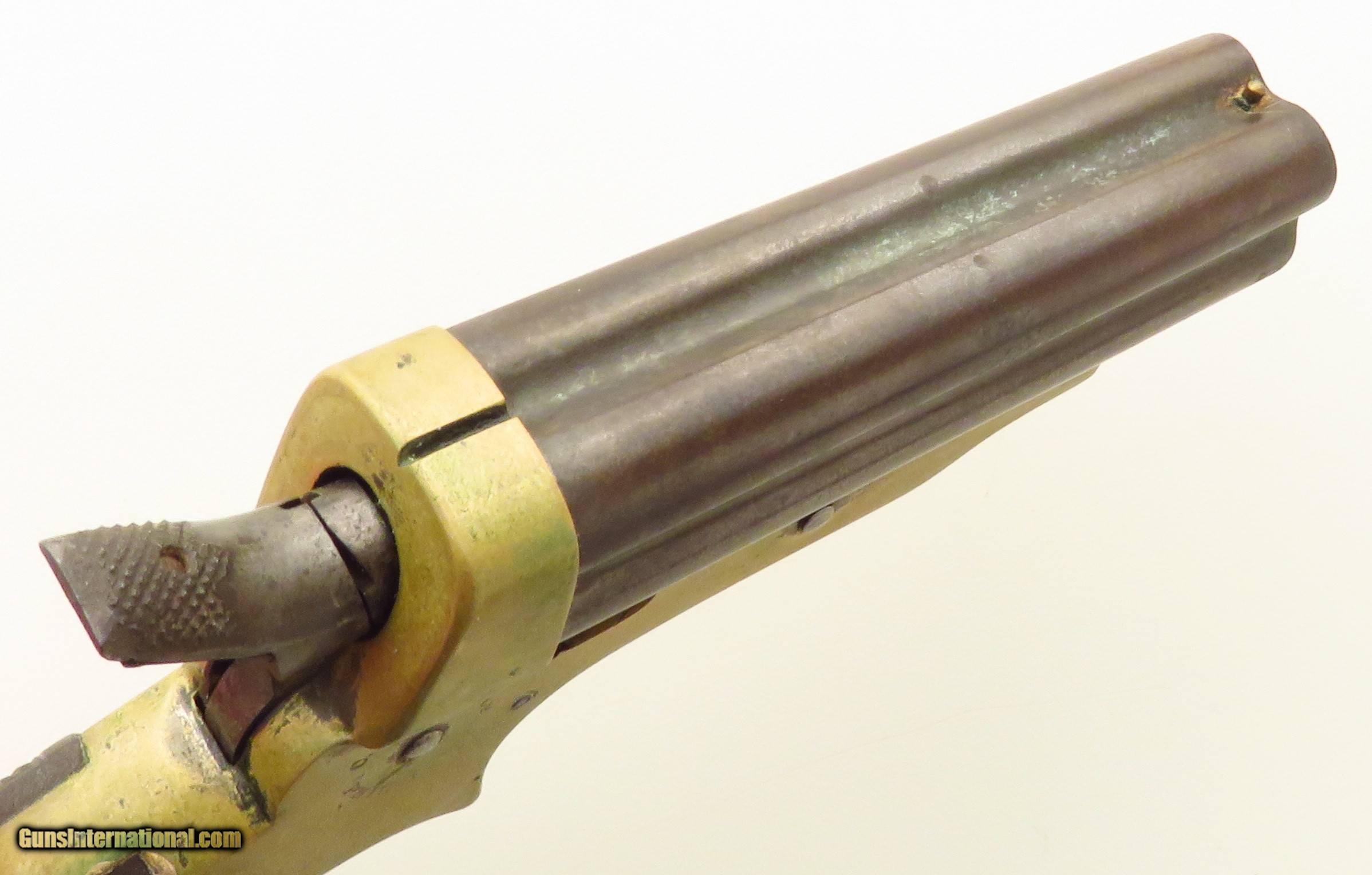 Sharps Pepperbox .30 caliber. Serial 21095 (2x: frame, barrels) has four three-inch barrels (.285-inch grooves, ,280 lands) and a brass frame. No box or case. CONDITION: Bores are dark and pitted with visible rifling. All mechanics are positive and the barrels are tight to the frame. Barrel finish has thinned and browned. Grips are solid. The price is firm. $1,250 plus shipping.