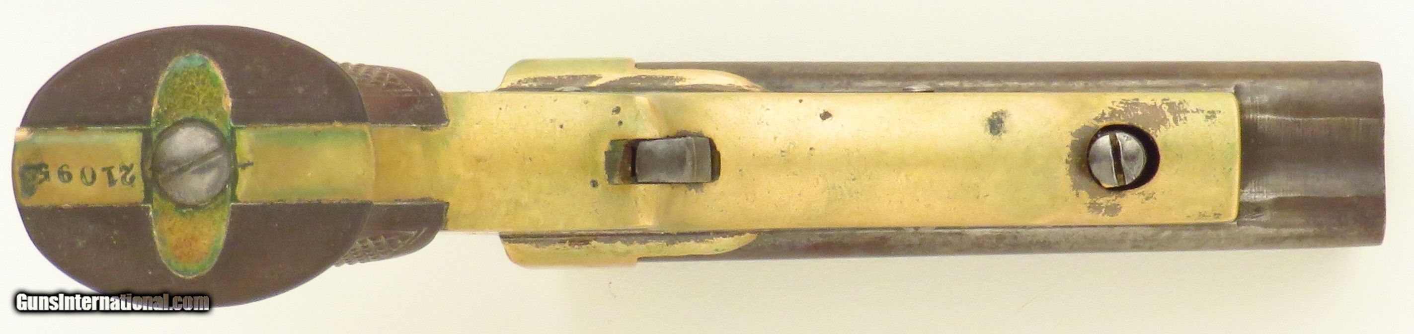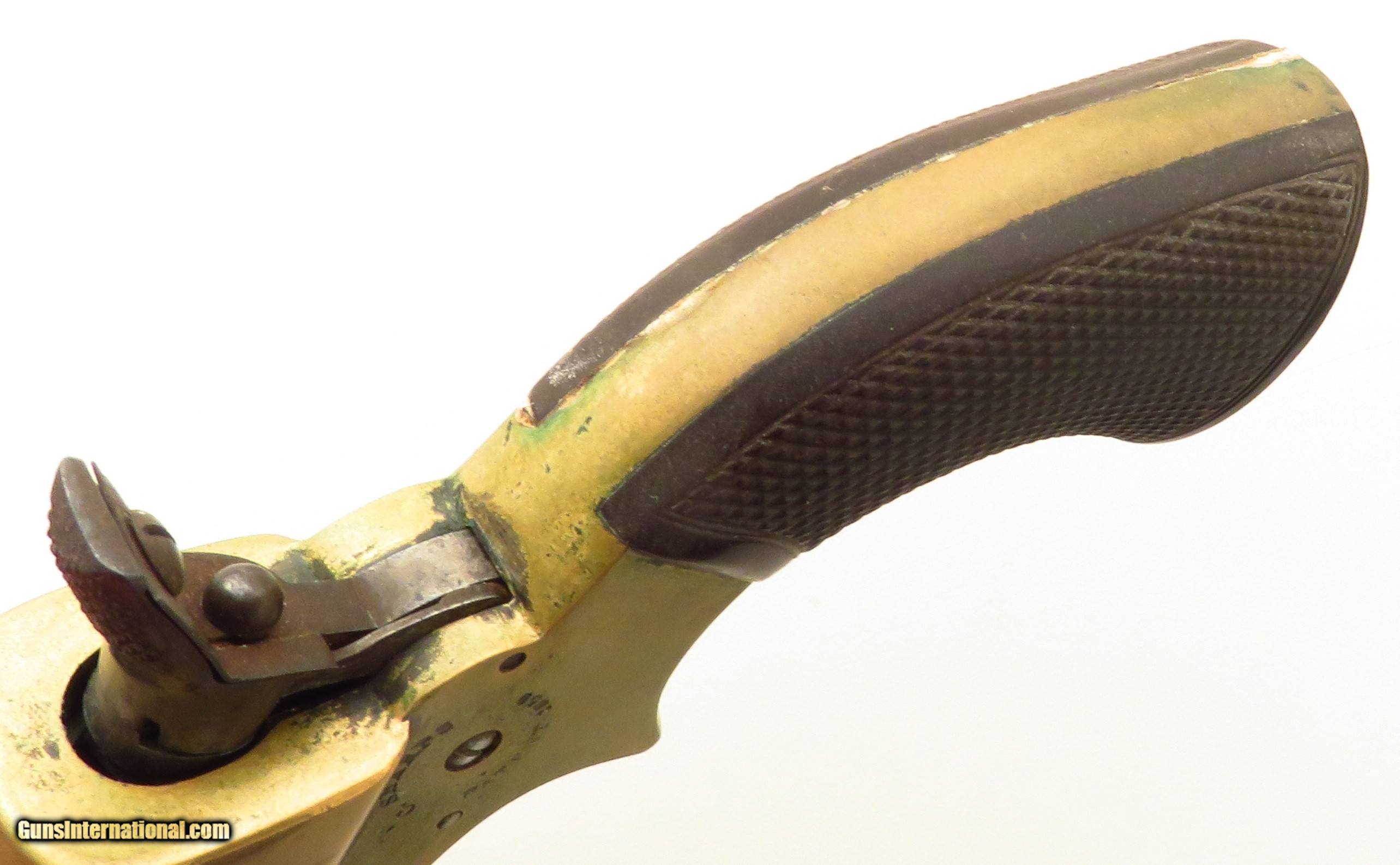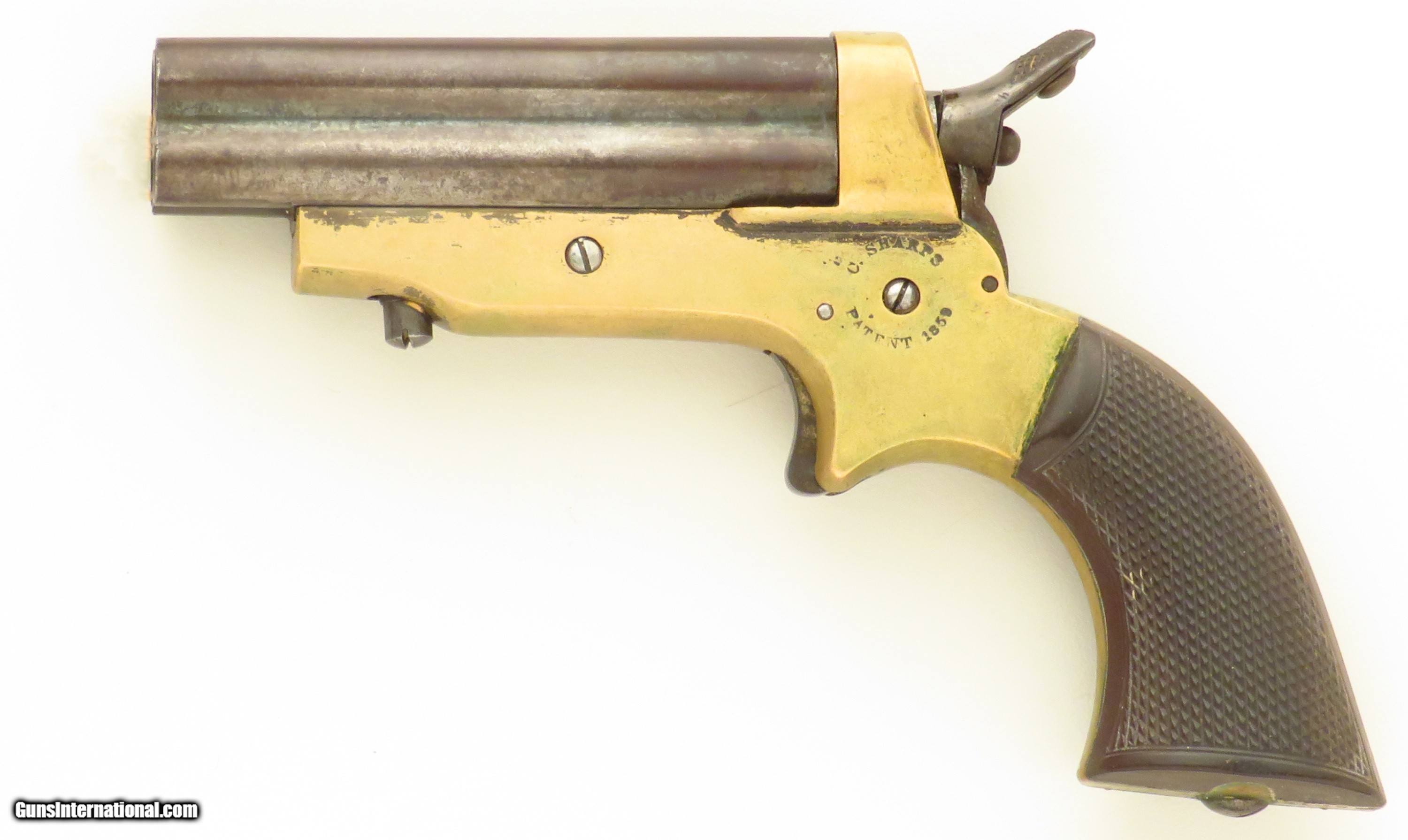 Sharps Pepperbox .30 caliber. Serial 21095 (2x: frame, barrels) has four three-inch barrels (.285-inch grooves, ,280 lands) and a brass frame. No box or case. CONDITION: Bores are dark and pitted with visible rifling. All mechanics are positive and the barrels are tight to the frame. Barrel finish has thinned and browned. Grips are solid. The price is firm. $1,250 plus shipping.