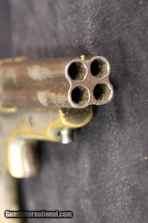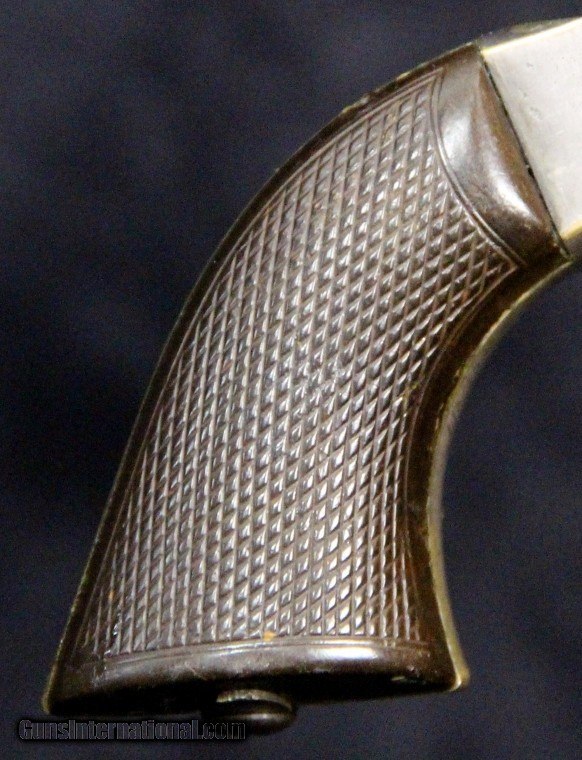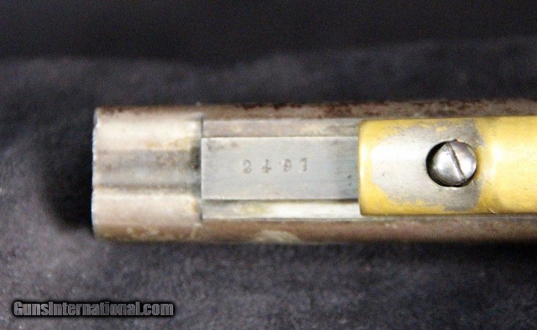 Description: .30rf, #2497, 3 inch barrels, blue and silver plate brass finish, 2 piece checkered hard rubber grips, 1860's. Condition: excellent bores, touches of blue on barrels, 60% silver plate on brass frame, left grip has been repaired, excellent mechanically, excellent marks. SOLD Antique: Yes |